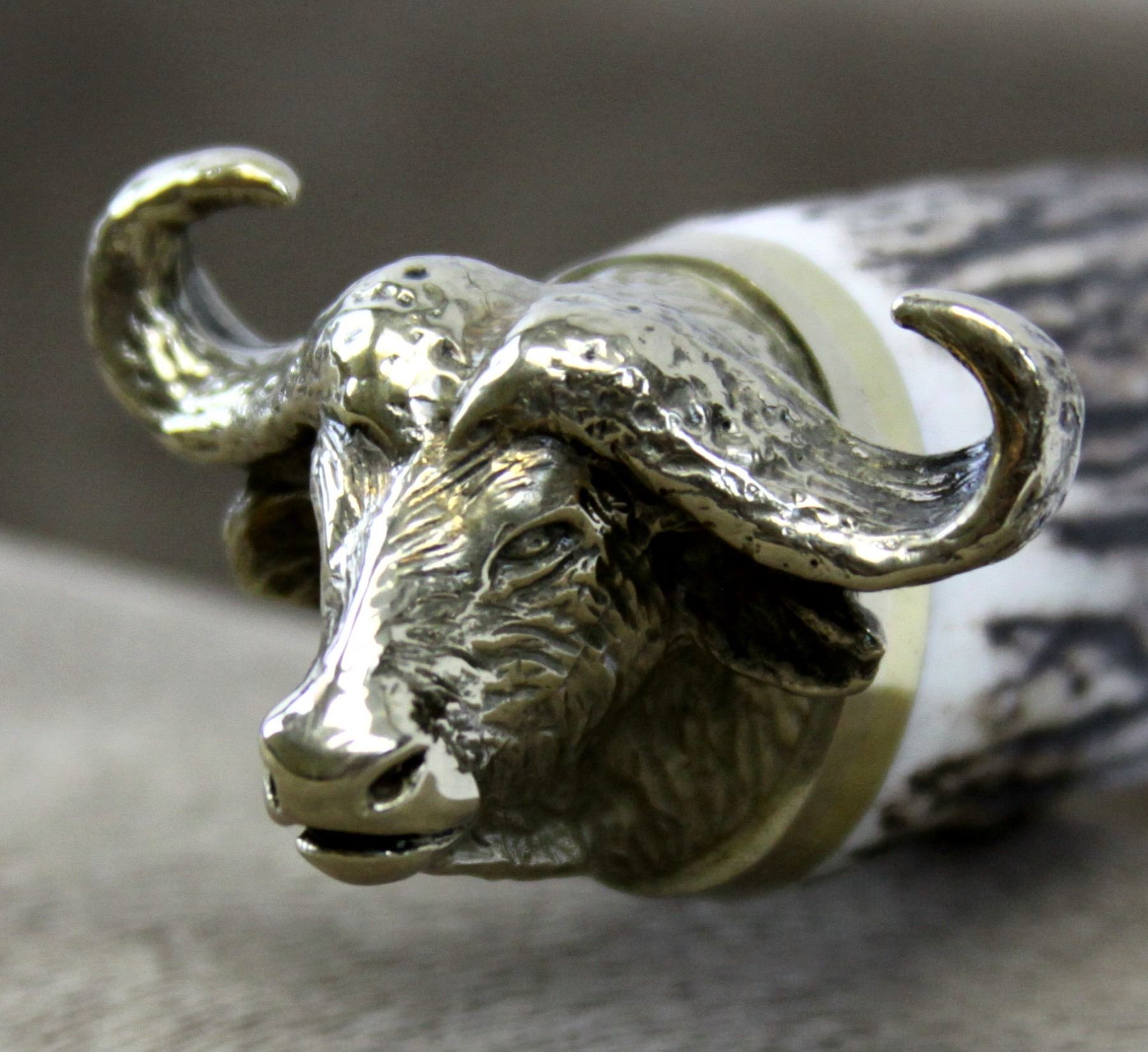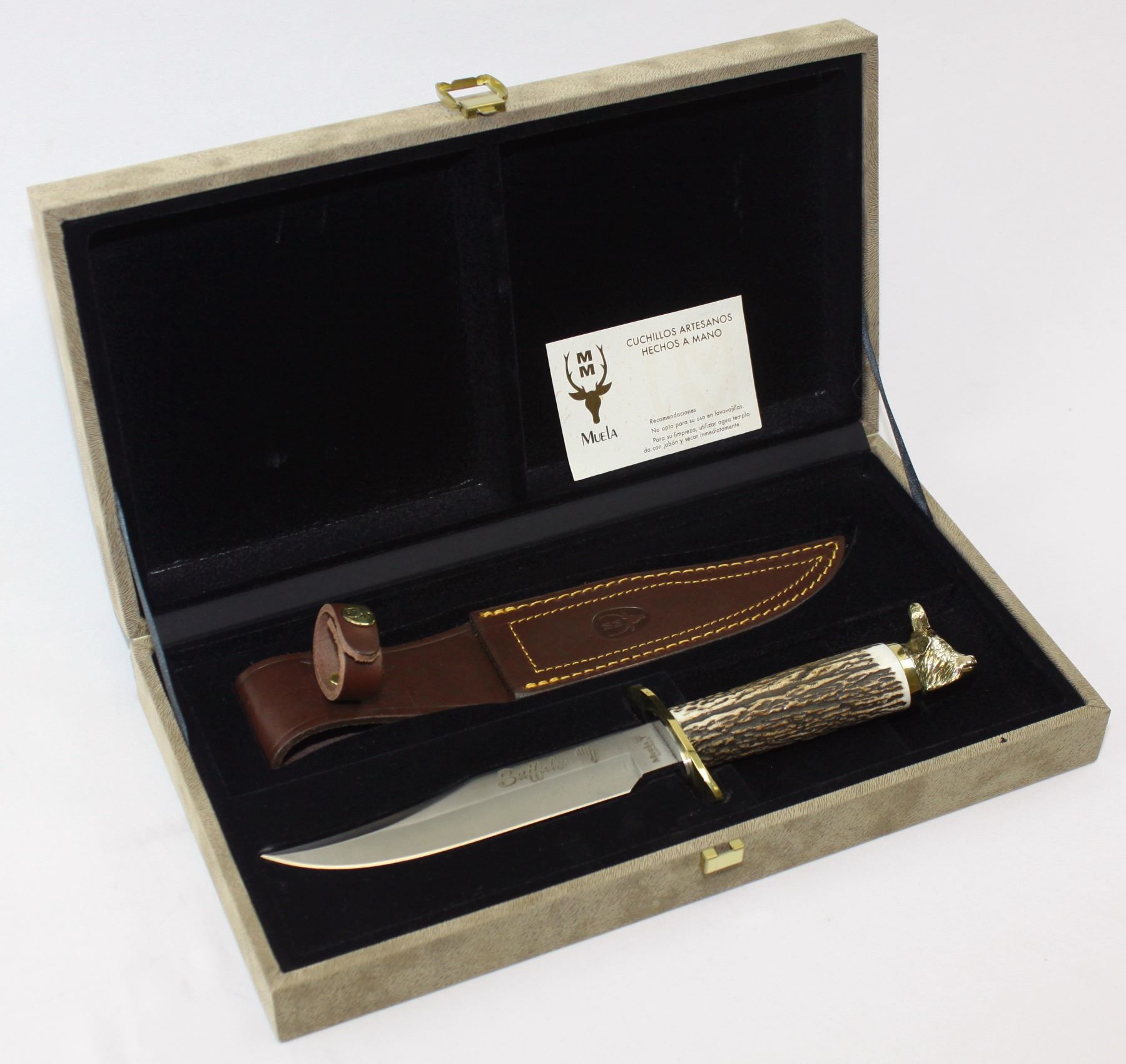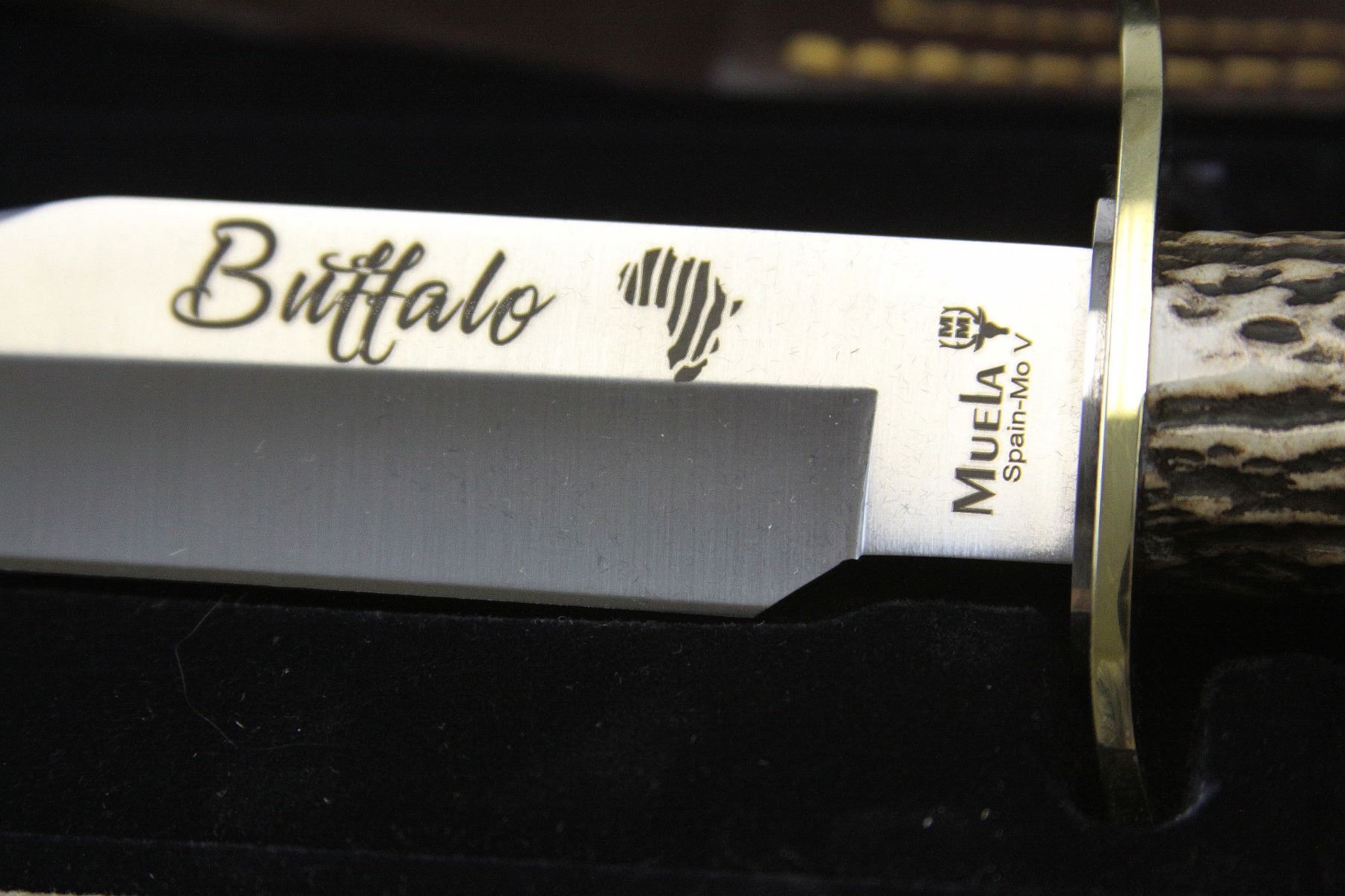 The Muela Group is currently one of the reference firms in handcrafted knives for hunting, both in Spain and the rest of the world, and its knives are highly prized for their top quality. Muela made a special edition of five deluxe models devoted to the five emblematic species of African dangerous game. There were only 150 numbered knives made of each model worldwide. The attractiveness and “hunting essence” of the red deer handles of these Muela knives, is increased with the addition of sterling silver plaque that evokes the silhouette of the African Continent. The sheaths of the knives are just as impressive and exclusive. They have been expressly designed for each model, hand – made with the best quality leather, and are adorned with exotic details related to the origin of the species, such as crocodile and ostrich skins, adding a genuine African “touch”. The knife offered here is the Cape Buffalo model. We thank Brandon Goodwin for this 100% donation.