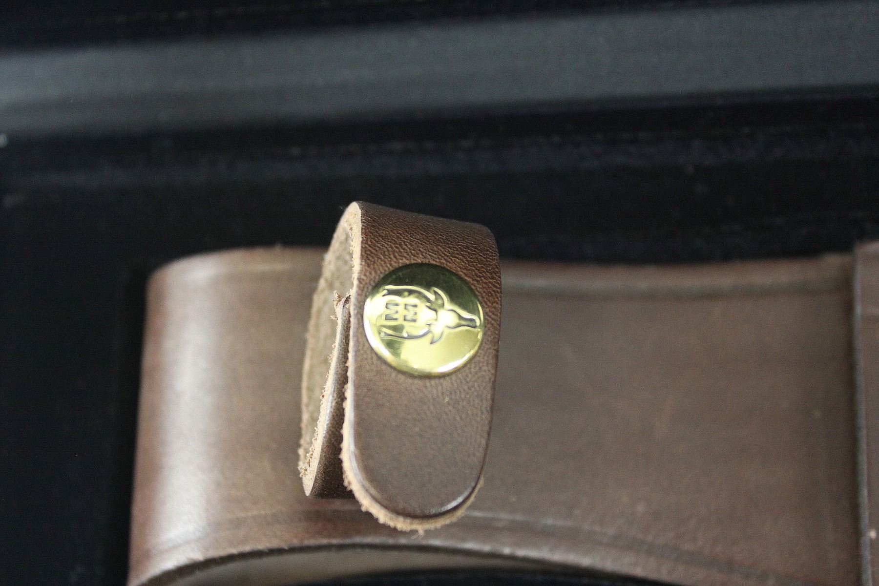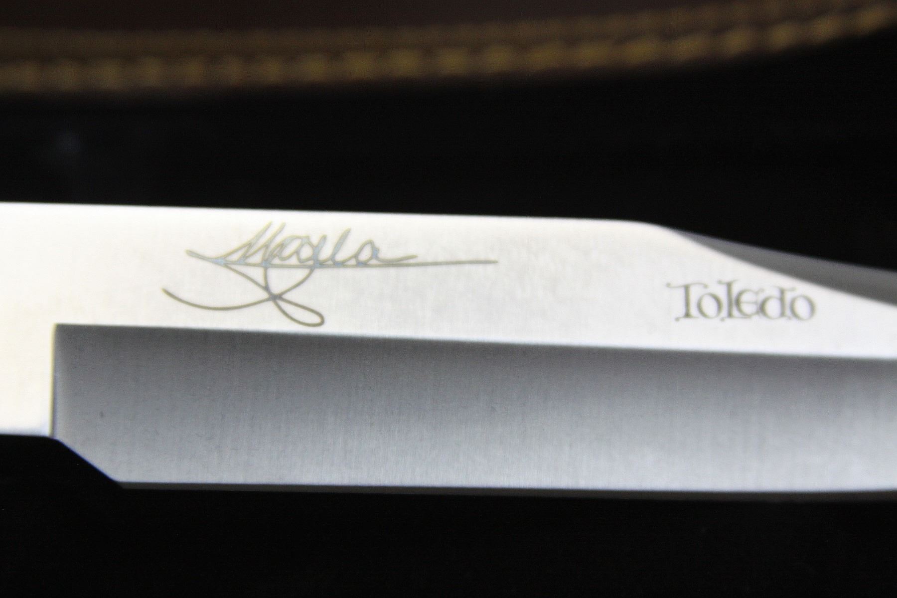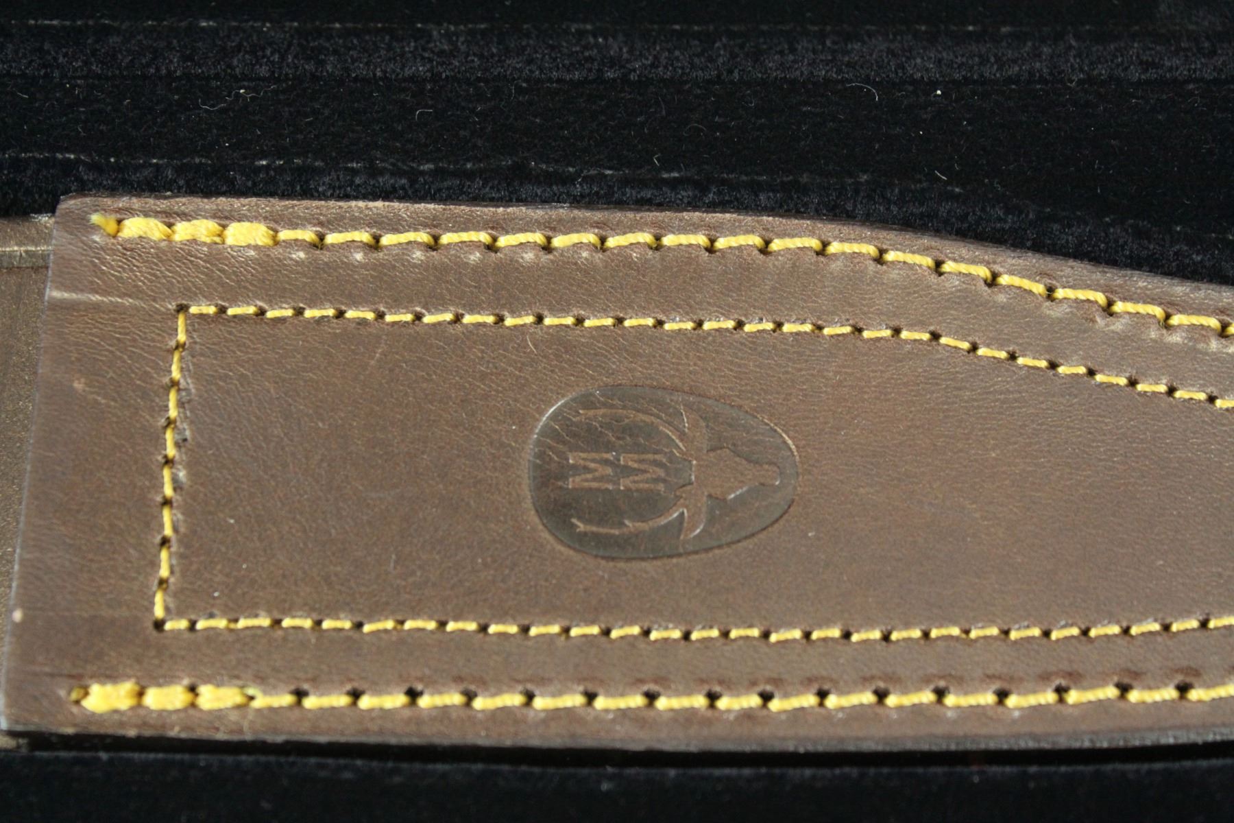 The Muela Group is currently one of the reference firms in handcrafted knives for hunting, both in Spain and the rest of the world, and its knives are highly prized for their top quality. Muela made a special edition of five deluxe models devoted to the five emblematic species of African dangerous game. There were only 150 numbered knives made of each model worldwide. The attractiveness and “hunting essence” of the red deer handles of these Muela knives, is increased with the addition of sterling silver plaque that evokes the silhouette of the African Continent. The sheaths of the knives are just as impressive and exclusive. They have been expressly designed for each model, hand – made with the best quality leather, and are adorned with exotic details related to the origin of the species, such as crocodile and ostrich skins, adding a genuine African “touch”. The knife offered here is the Cape Buffalo model. We thank Brandon Goodwin for this 100% donation.