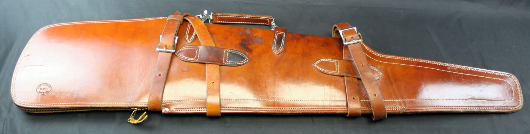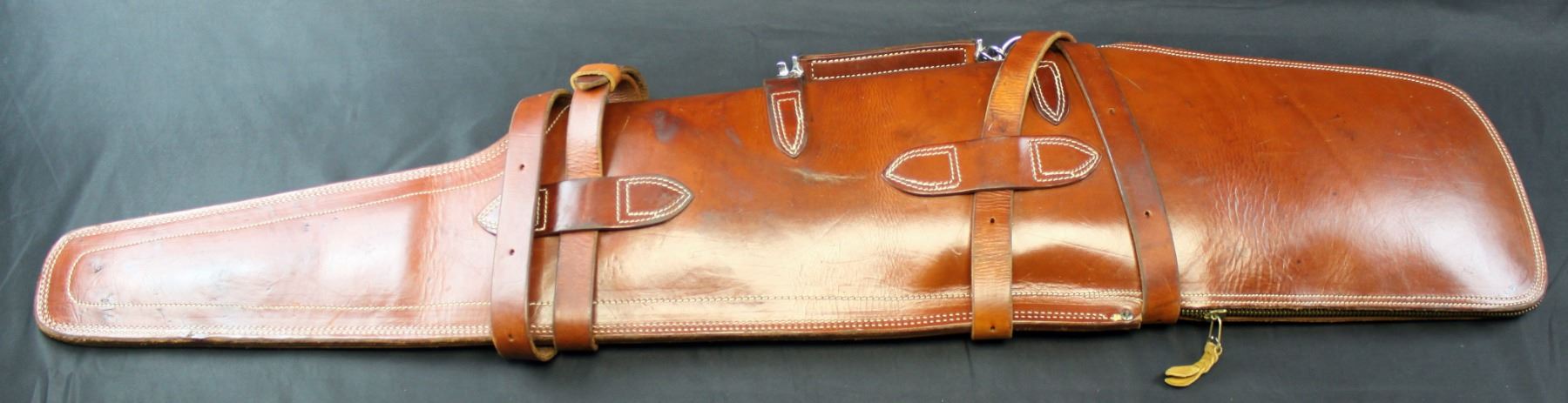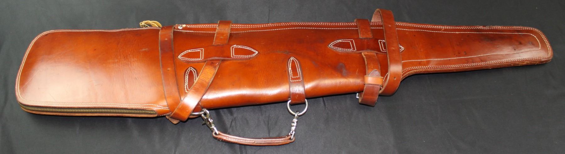 The Murray Ultimate Saddle Scabbard is designed for maximum protection of your big game rifle. The case is made from the very finest saddle leather and completely encases the gun. Lined with an exclusive man-made sheepskin that is breathable and non-reactive to gun oil, it will protect the gun blue as well as the stock finish. The heavy duty brass zipper is double nylon stitched and virtually indestructible. The 1-1/4-inch saddle attaching straps give you an added degree of safety and durability. This gently used scabbard will conveniently fit inside most hard cases for travel. A detachable leather grip enables this scabbard to be used as a rugged year-round gun case. Designed to fit any position on your saddle. Proudly hand-crafted in the USA and rated a top product by Guns & Ammo Magazine.