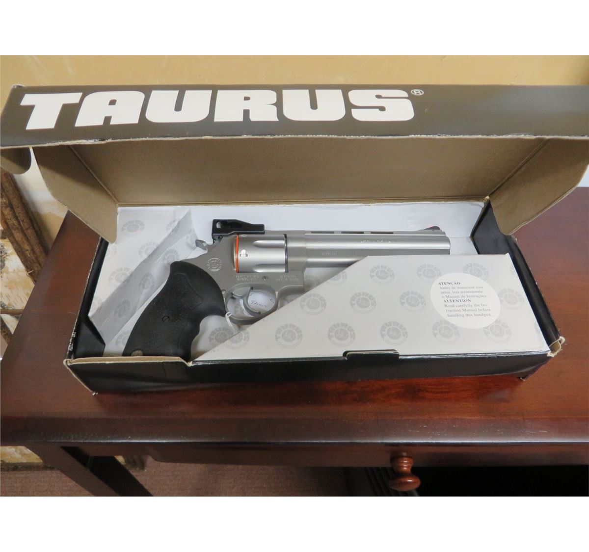 Taurus Stainless Steel 44 Magnum Revolver in one of three cases being auctioned. We auction off three pistol cases and each successful bidder receives one case to be opened after the third cases is sold. One of the three pistol cases has the SS Taurus 44 Magnum pistol in it.