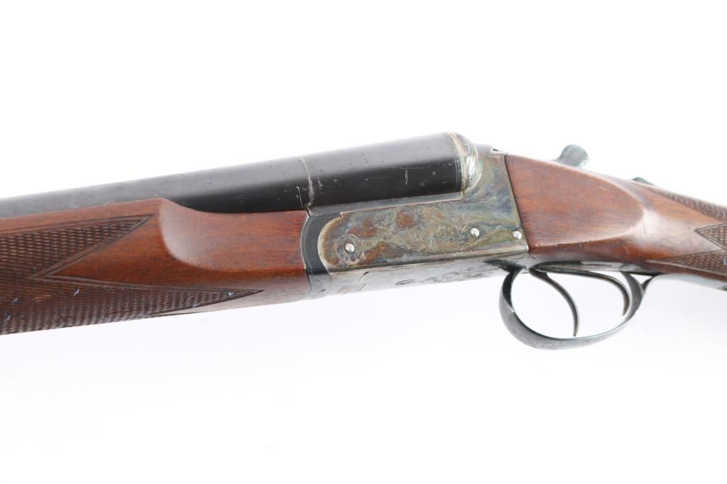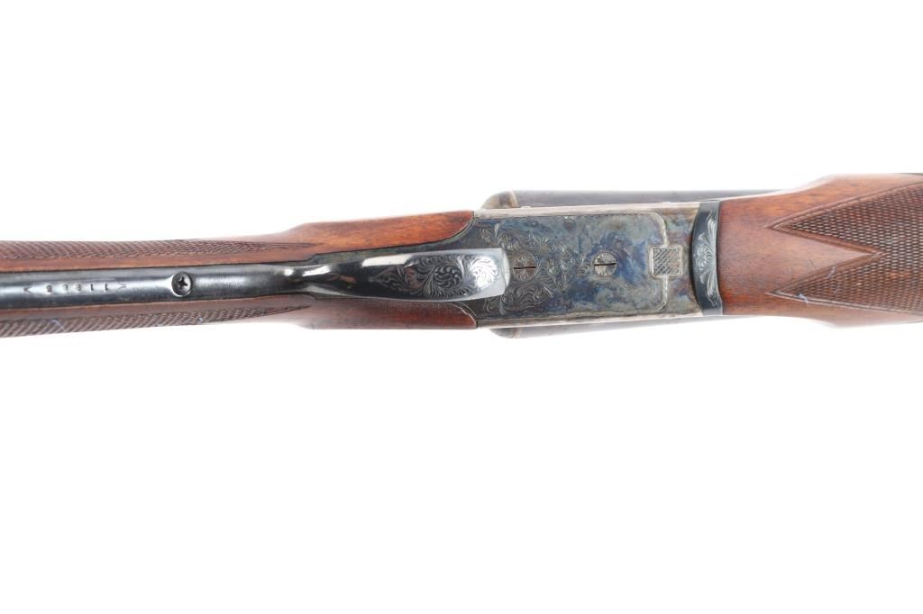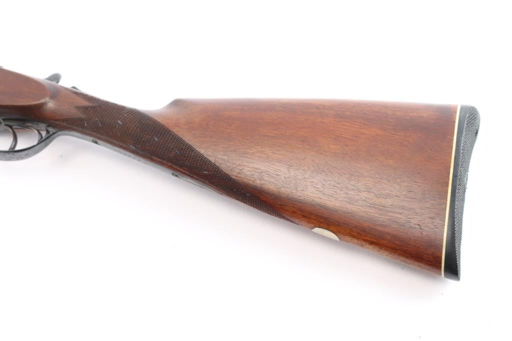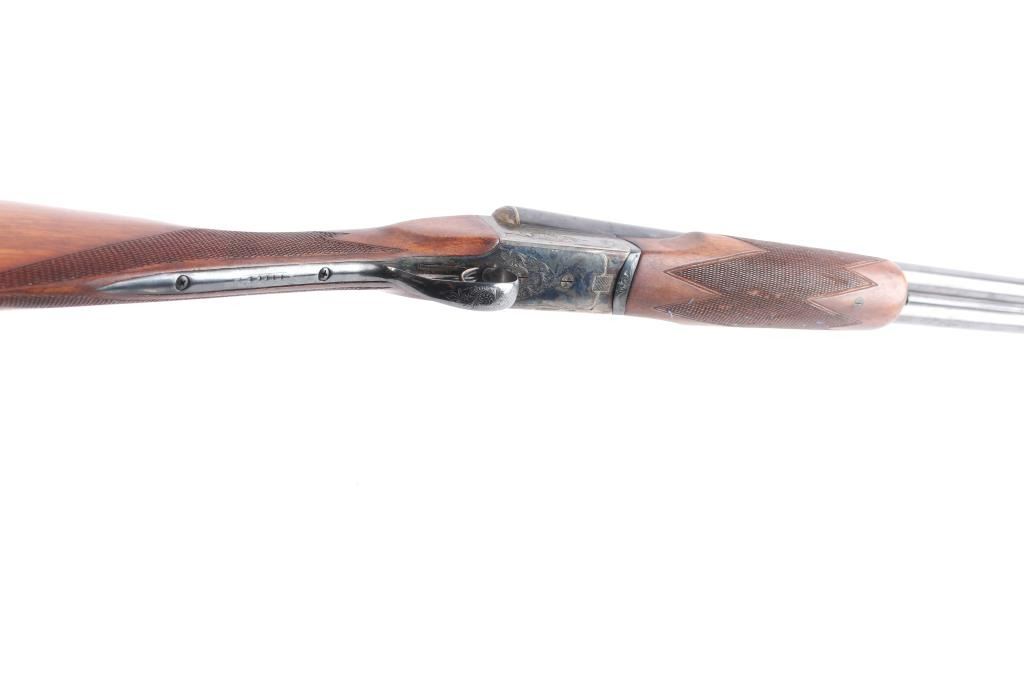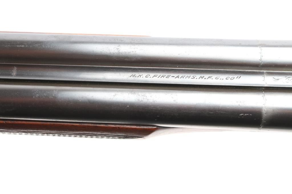 Nice quality 12 gauge SxS shotgun with 28" blued barrels, contoured. low profile rib with brass bead, choked left-CYL, right-IC, case color receiver with limited scroll engraving, both side marked "The Condor", double triggers, sliding tang safety. Rib stamped "N.K.C. Fire-Arms M.F.G. Co." Matching serial number stamped on lower tang, both barrels and watertable, barrels & water table have flying eagle proofs, water table also stamped "NKC". nice straight grip shoulder stock with silver oval inletted in toe line, checkered hard rubber buttplate with image of stag's head in circle, beavertail forearm with Anson release, checkered panels on wrist & forearm. Bores are excellent/bright, wood is near excellent with a few minor scratches/dings, the blue & case color finishes are about 95% with minor scratches. This gun is a bit of a mystery as we could not find any reference to the make or model number, possibly Japanese made.
