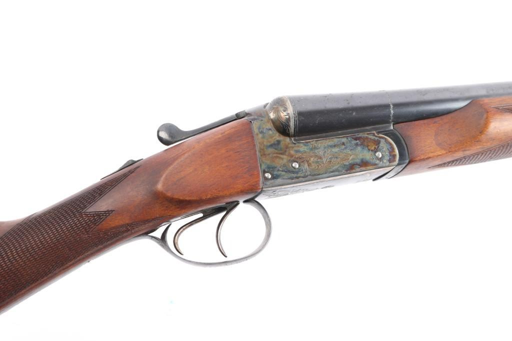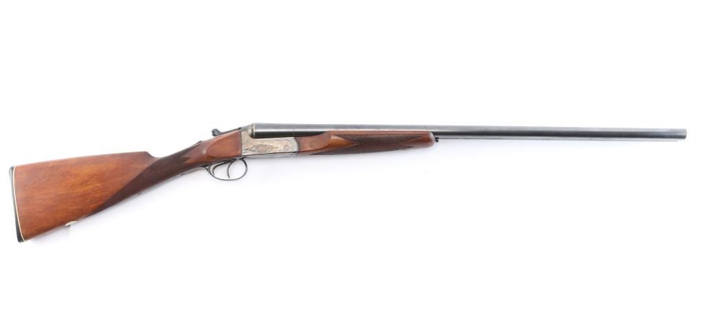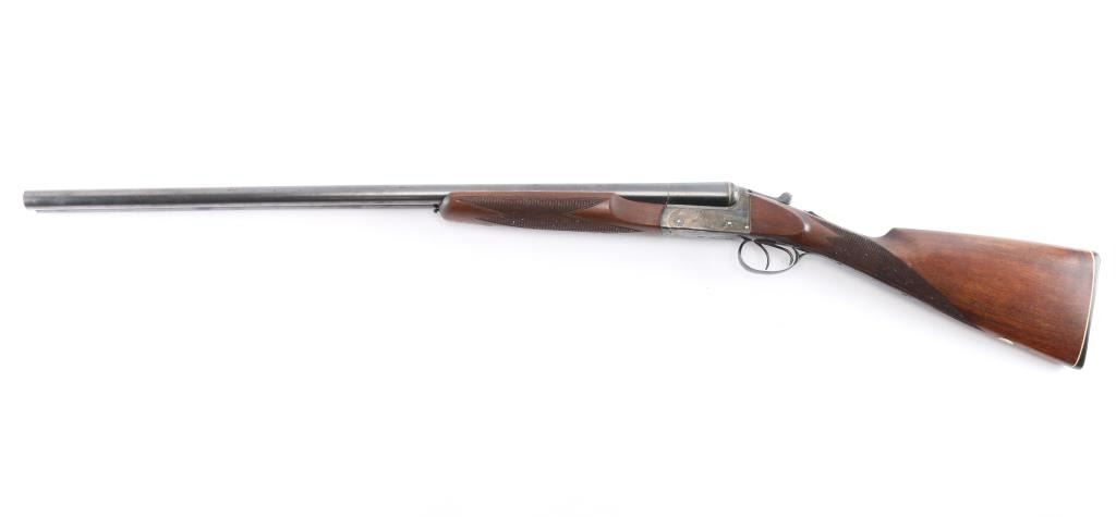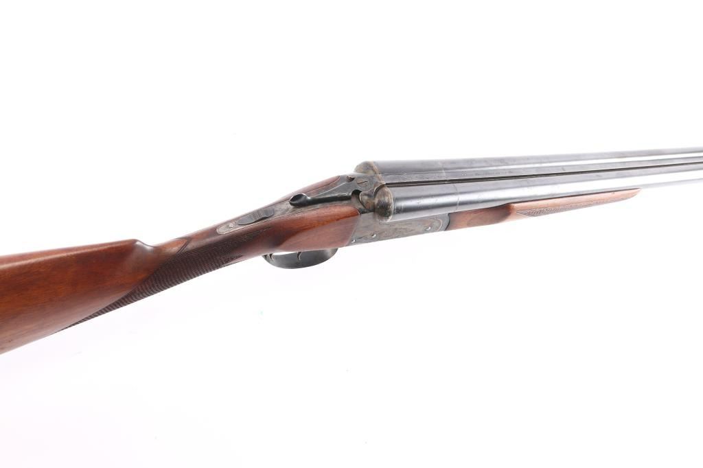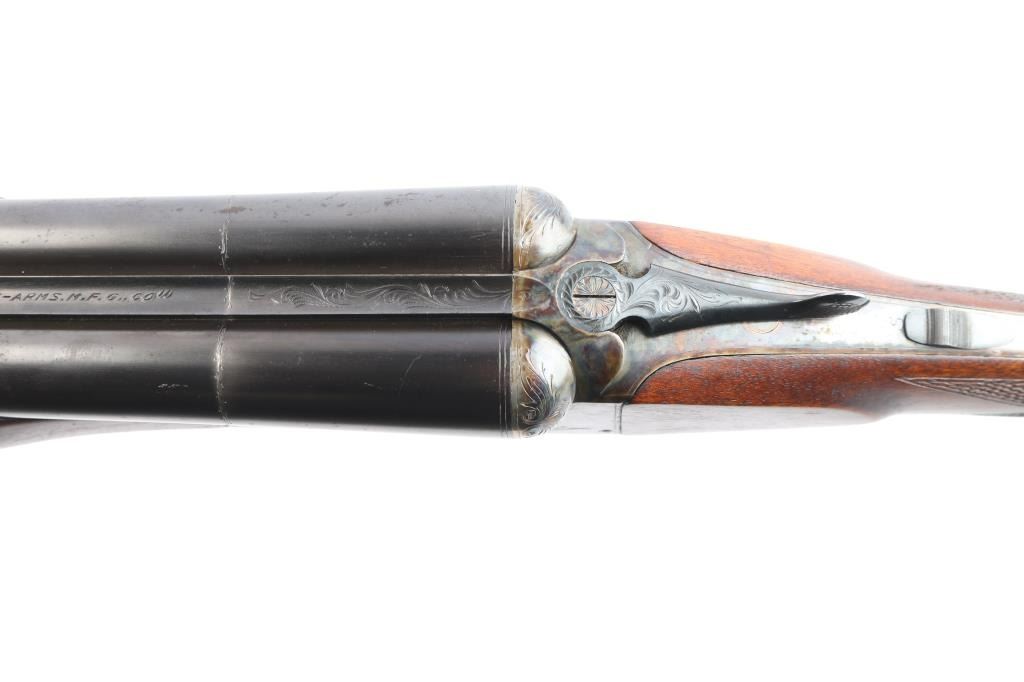 Nice quality 12 gauge SxS shotgun with 28" blued barrels, contoured. low profile rib with brass bead, choked left-CYL, right-IC, case color receiver with limited scroll engraving, both side marked "The Condor", double triggers, sliding tang safety. Rib stamped "N.K.C. Fire-Arms M.F.G. Co." Matching serial number stamped on lower tang, both barrels and watertable, barrels & water table have flying eagle proofs, water table also stamped "NKC". nice straight grip shoulder stock with silver oval inletted in toe line, checkered hard rubber buttplate with image of stag's head in circle, beavertail forearm with Anson release, checkered panels on wrist & forearm. Bores are excellent/bright, wood is near excellent with a few minor scratches/dings, the blue & case color finishes are about 95% with minor scratches. This gun is a bit of a mystery as we could not find any reference to the make or model number, possibly Japanese made.