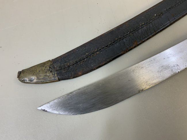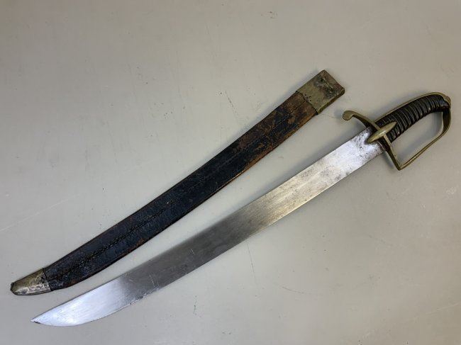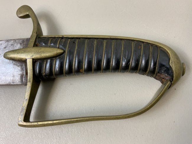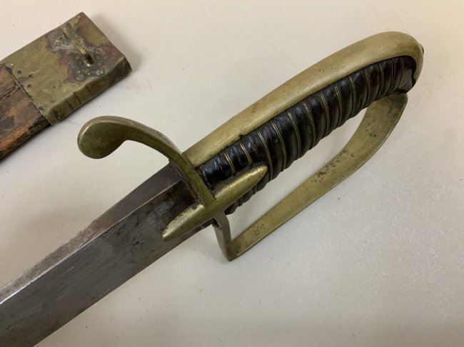 NAPOLEONIC WARS RUSSIAN OR AUSTRIAN INFANTRY HANGER SHORT SWORD . VERY RARE FIND. BRAGG HILT WITH NICE AND STRONG BLADE. COMES WITH ORIGINAL SCABBARD. 25" LONG WITH 20" LONG BLADE
