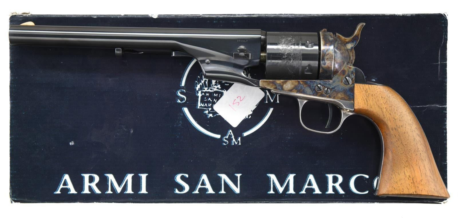REVOLVER. Cal. 38 Colt. S# 3257. Bbl. 8" w/ brass blade front sight. 6 Shot cyl. w/ roll engraved Naval scene. Case colored frame, loading gate & hammer. Silver finished front strap. Blued bbl., cyl., ejector, ejector housing, wedge & back strap. UNATTACHED ACCESSORIES: matching numbered box. CONDITION: near excellent overall including bore. (23-219/MD). MODERN. $300-500.