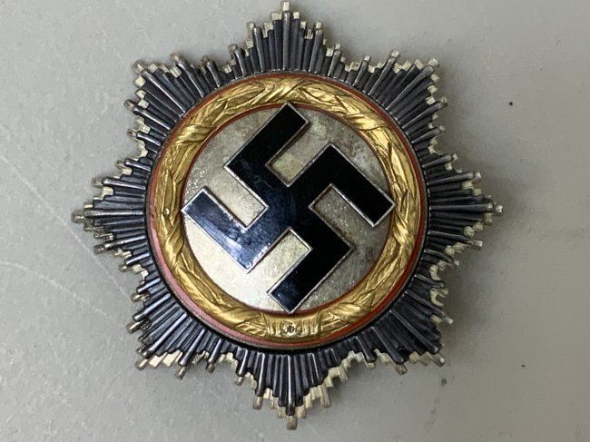 NAZI GERMANY 1941 GERMAN CROSS IN GOLD STEINHAUER & LUCK OF LUDENSCHEID . WARTIME EXAMPLE STAMPED "4" INSIDE RECTANGULAR BOX. MOST LIKELY NEVER AWARDED LIKE MOST OF THEM. THIS FIRM CONTINUED MAKING THESE AWARD POST WAR AND MOST OF THEM ARE IDENTICAL BUT WITHOUT NUMBER "4" STAMP. GREAT OVERALL CONDITION WITH NORMAL WEAR FOR ITS AGE AND ONE SMALL DING TO AN AREA AROUND 1941 DATE. RARE.