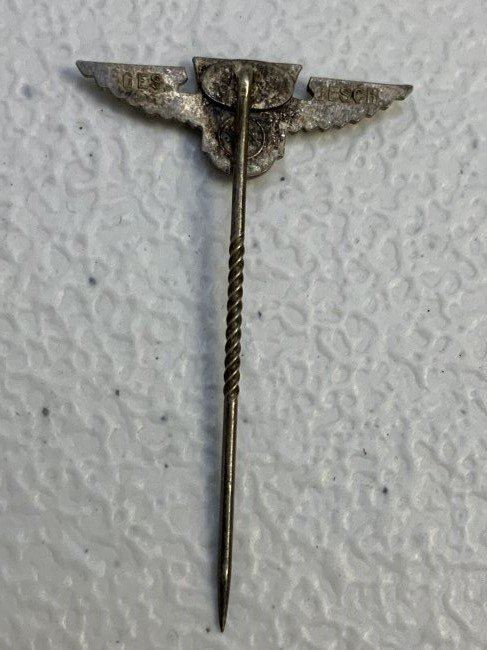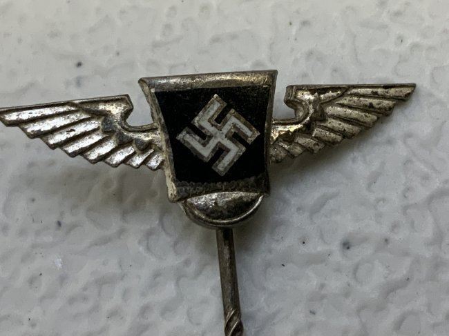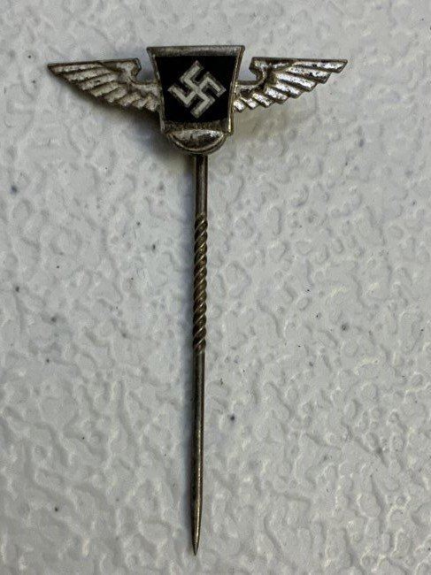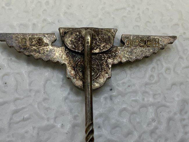 NAZI GERMANY AVIATORS WINGS PIN . SILVER COLOR METAL WITH BLACK ENAMELED CENTER. KNURLED PIN AND MARKED ON THE BACK.