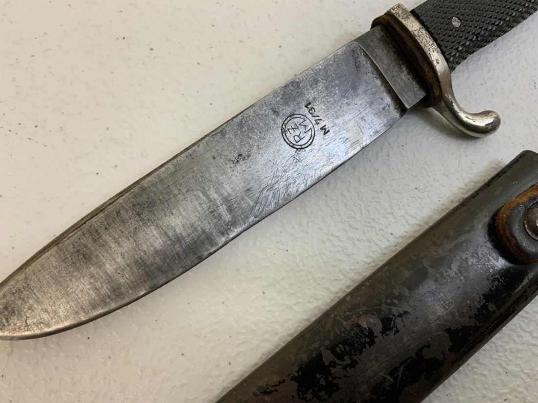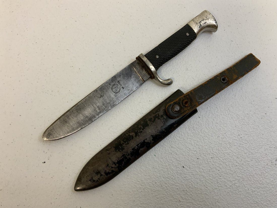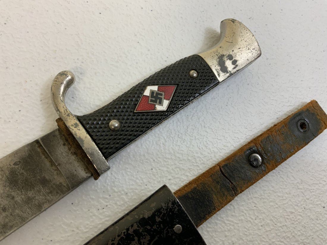 NAZI GERMANY HITLER YOUTH HJ KNIFE DAGGER RZM M7/31 . WELL USED AND WORN CONDITION . COMPLETE WITH ITS ORIGINAL SCABBARD WITH LEATHER BELT STRAP.