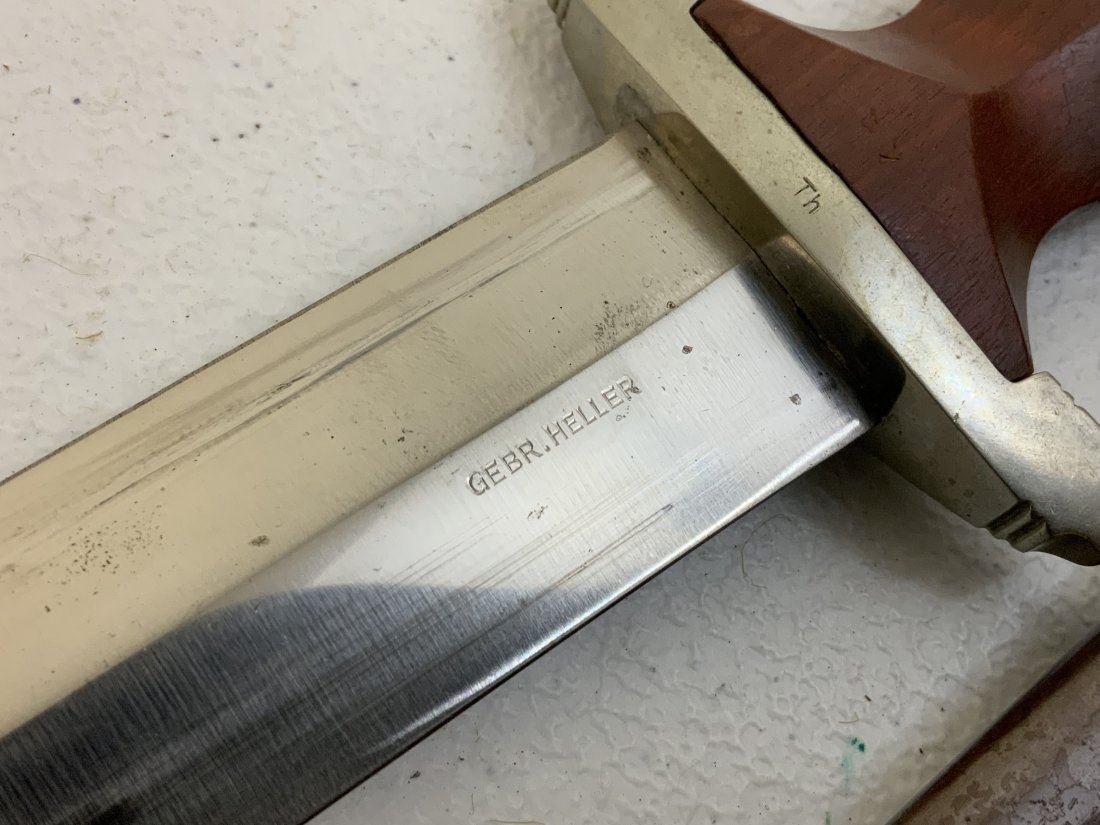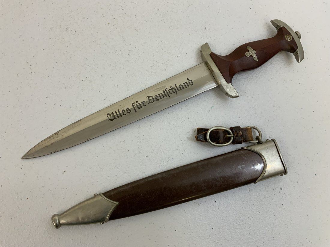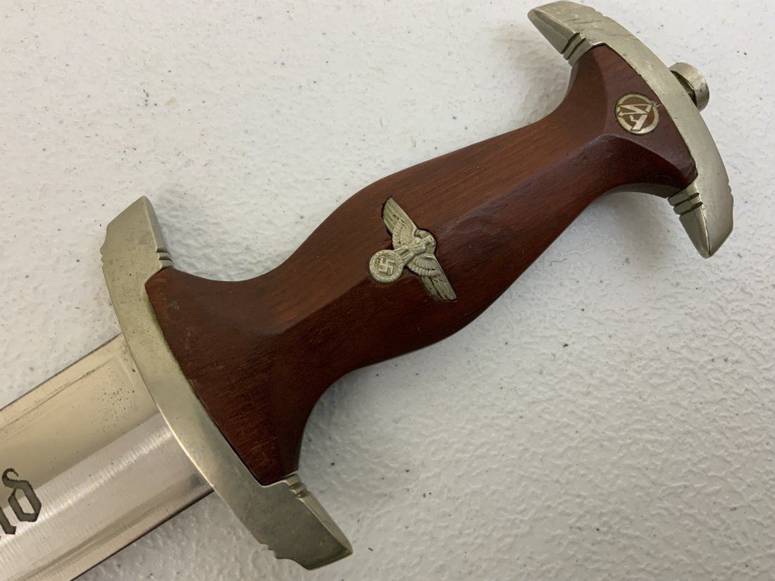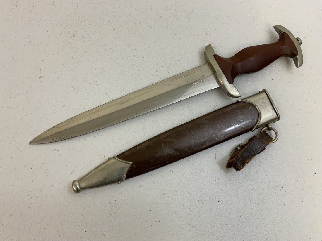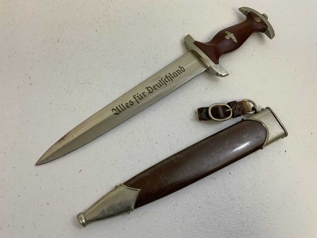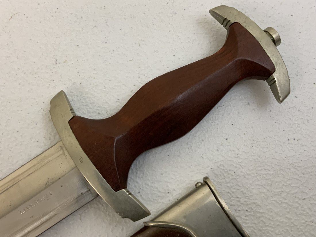 NAZI GERMANY SA DAGGER BY GEBR. HELLER . EARLY QUALITY DAGGER. GREAT OVERALL CONDITION WITH MINTY BLADE THAT HAS ORIGINAL CROSS GRAININGAND DARK DEEPLY ETCHE MOTO . ORIGINAL BROWN ANODIZED SCABBARD. EARLY TYPE NICKEL SILVER GRIP FITTINGS. DOUBLE MARKED BLADE WITH RZM M7/66 AND EICKHORN LOGO DISPLAYS SOME WITH GRUPPE MARK. GREAT EARLY QUALITY DAGGER AND IN GREAT CONDITION.