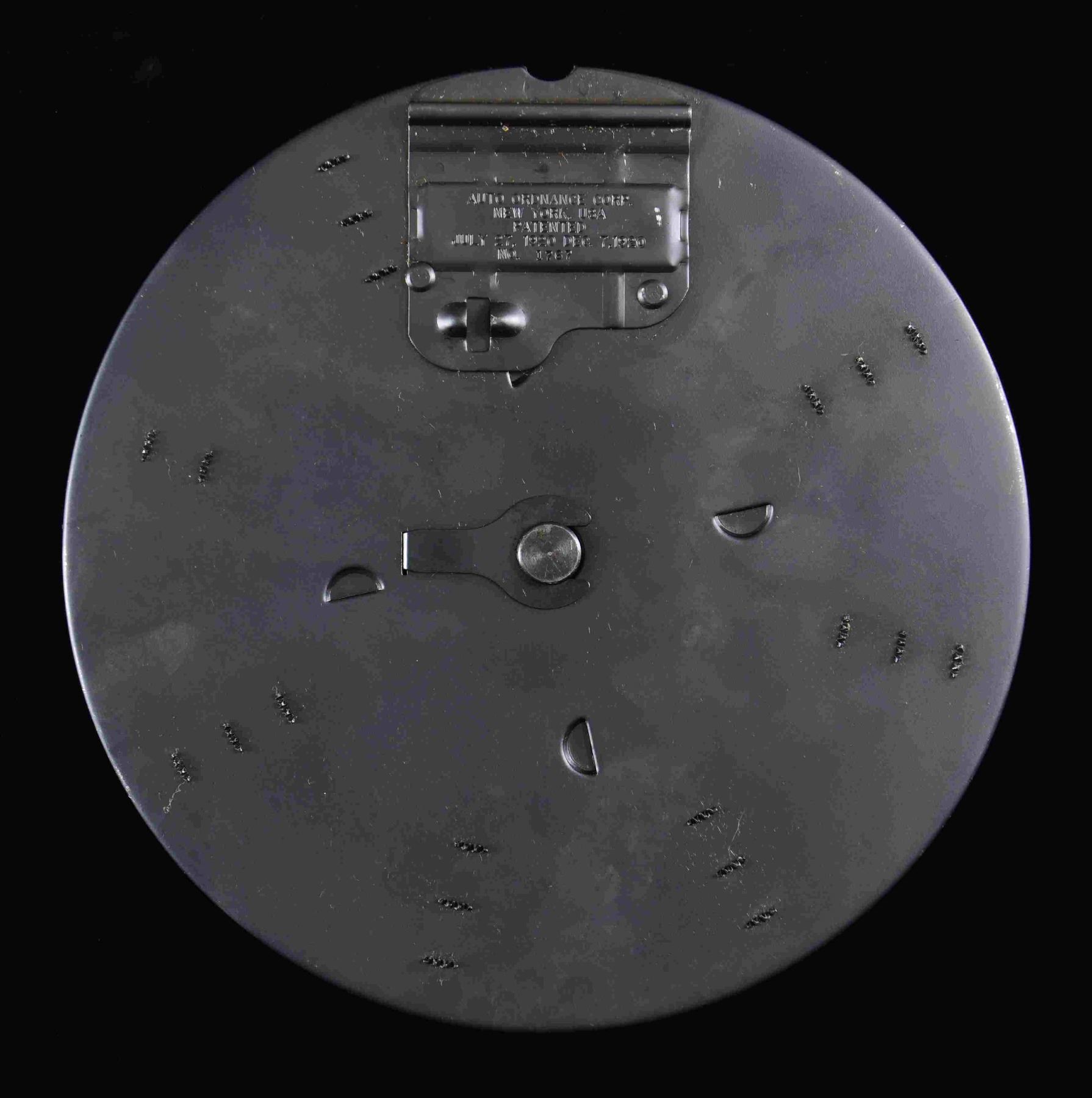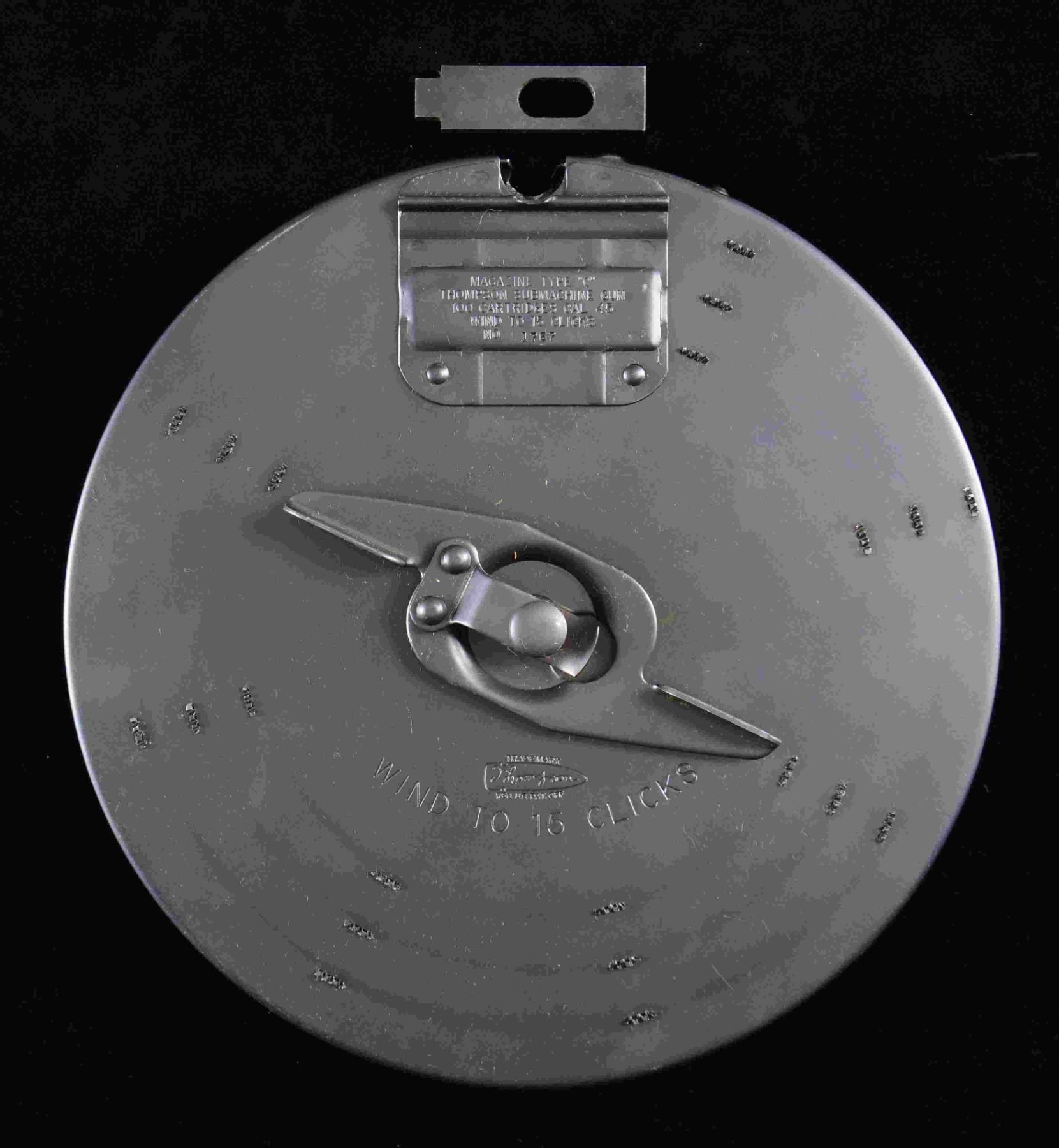 MAGAZINE WITH BOX & MANUAL. 100-rd. Thompson submachine gun "C" Drum mfg. by Auto Ordnance. Front cover data plate is marked "MAGAZINE TYPE "C"/ THOMPSON SUBMACHINE GUN/ 100 CARTRIDGES CAL. 45/ WIND TO 15 CLICKS/ NO. 1767", with the rear data plate reading "AUTO ORDNANCE CORP./ NEW YORK, USA/ PATENTED/ JULY 27, 1920 DEC. 7, 1920/ NO. 1767". Cover is marked with the Thompson bullet trademark logo above "WIND TO 15 CLICKS". Exterior exhibits a matte blue finish. UNATTACHED ACCESSORIES: unmarked box containing 2 manuals. CONDITION: near new, with metal components retaining virtually all of their original factory finish, save for some scattered light superficial marks from handling and storage. Box shows light exterior wear, but otherwise remains sturdy and serviceable. A very nice example of a near new 80s-90s production Thompson "C" drum. PROVENANCE: Lifelong Collection of Terrence McCarty. (02-21797-7/MLW). $500-1,000.