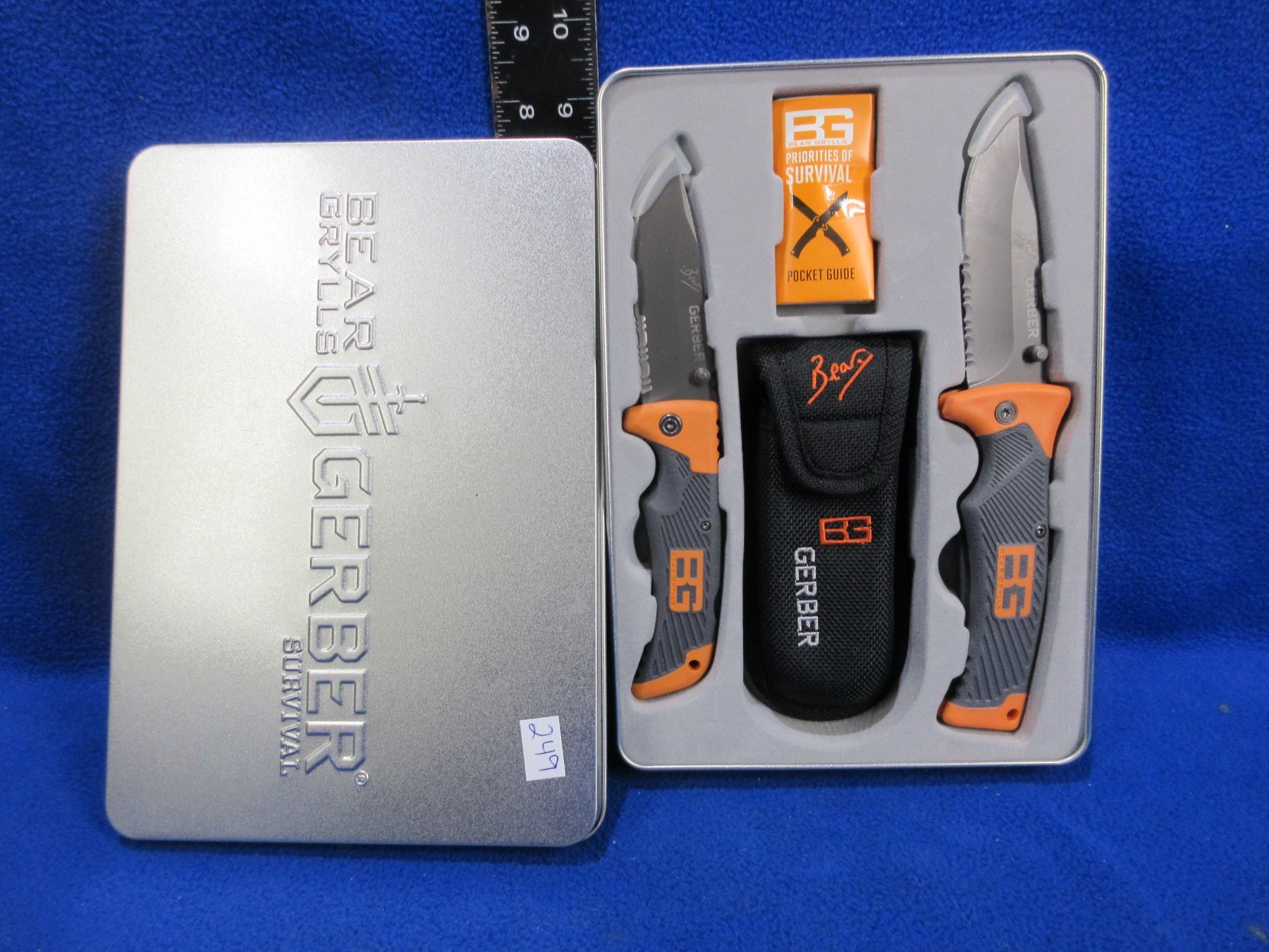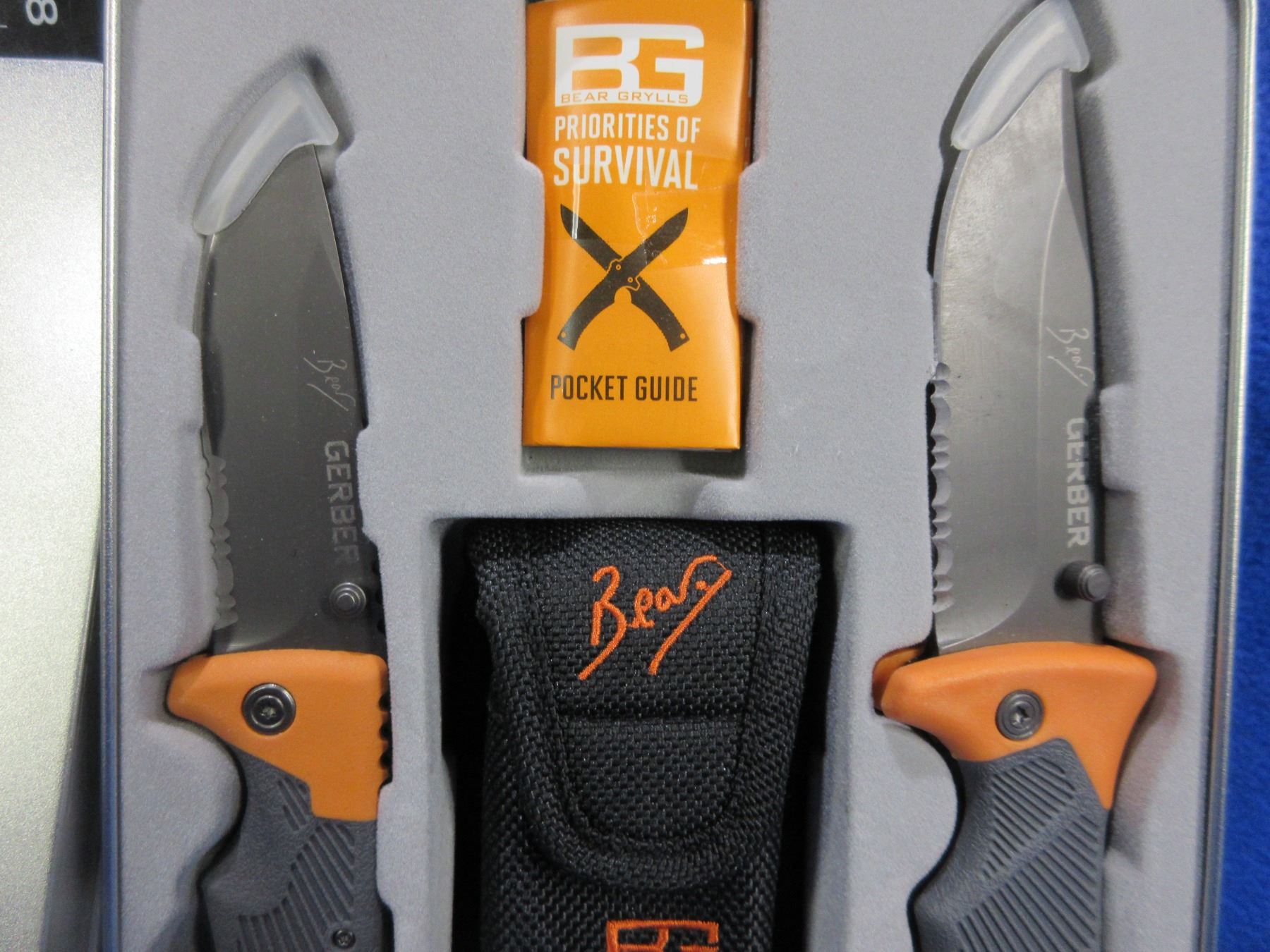 NEW - Gerber Survival Bear Grylls 2 Knife Set with Sheath in Collector Tin - 2 Folding Blade Lock Knives