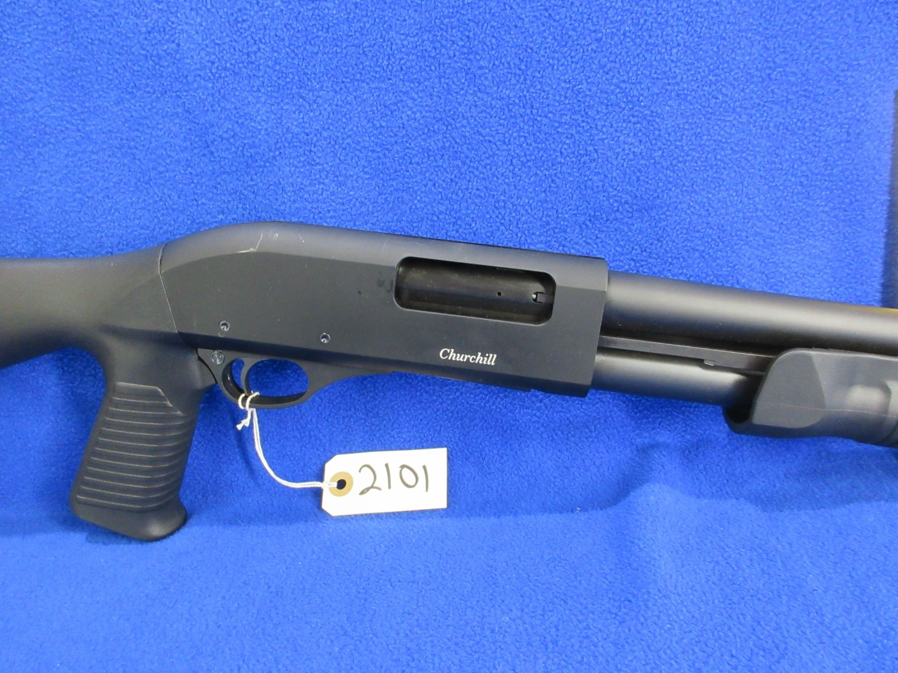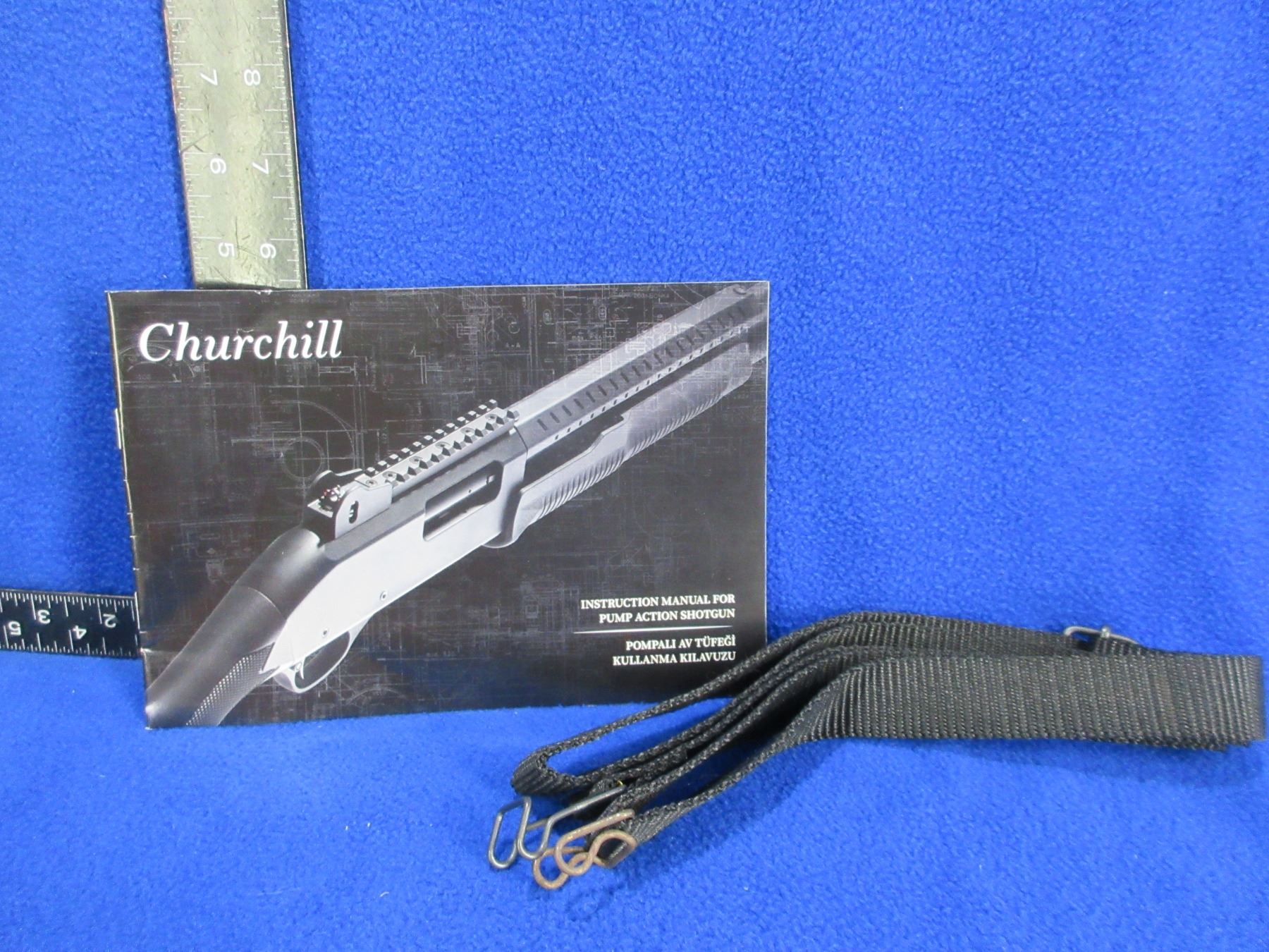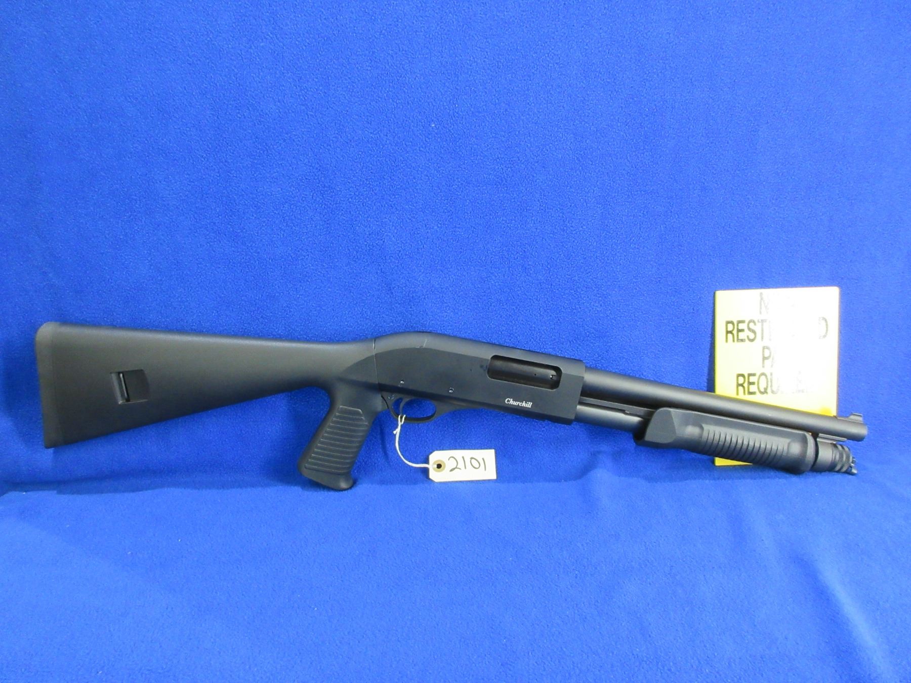 NEW - Never Fired, Never Used - Non-Restricted - Akkar Churchill Model 612 in 12 Ga. 3" - This is a pump action shotgun with tube magazine. Barrel is 12", black finish, has blade front sight, synthetic pistol grip stock, length of pull is 14", synthetic forearm, rubber recoil pad. Comes with swivels, manual and sling. Ser # 18252720