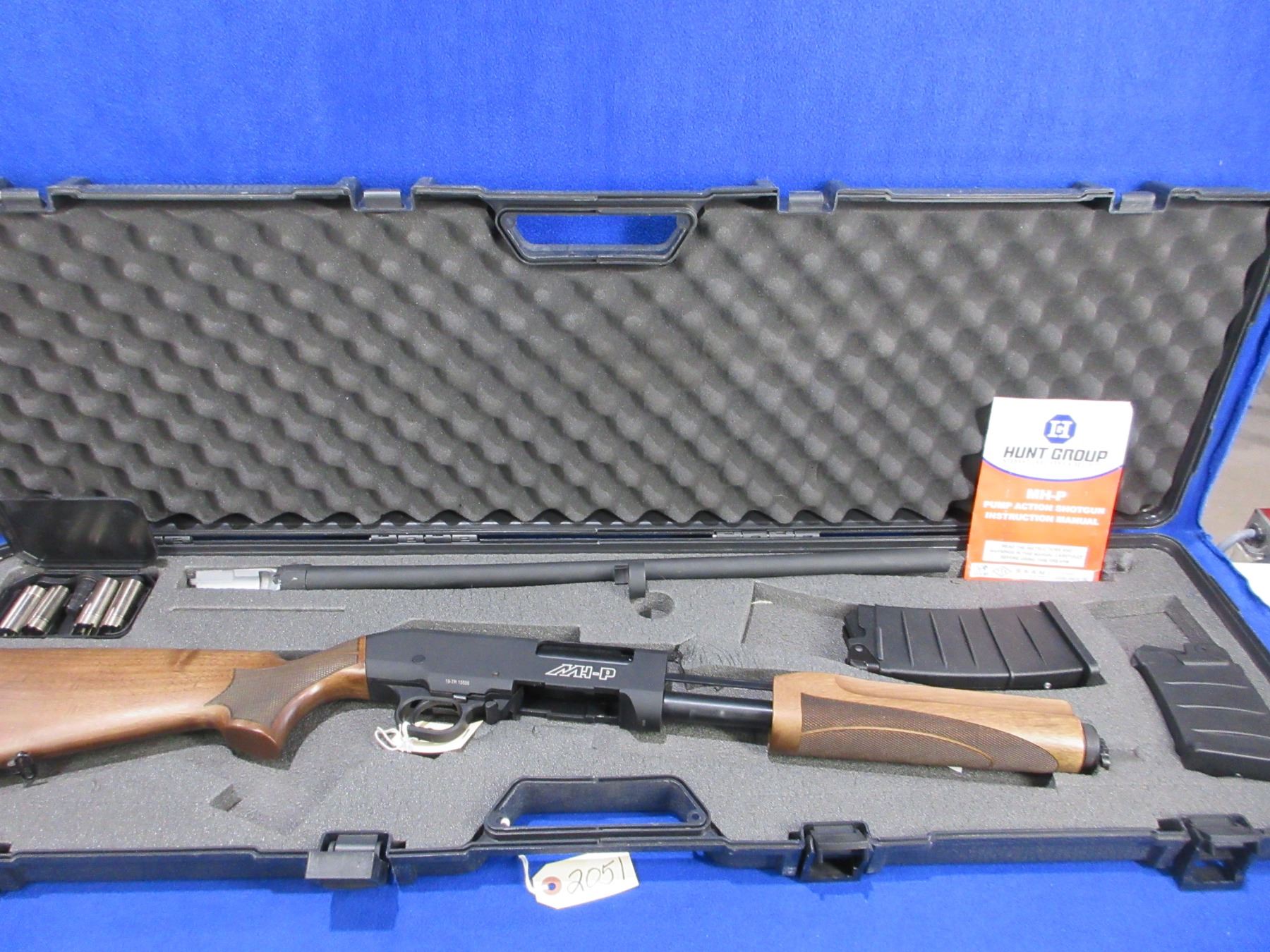 NEW - Non-Restricted - Hunt Group Model MH-P in 12 Ga. 3" - This pump action shotgun with 2 removable magazines and 5 removable chokes is NEW, never fired. Barrel is 24", Comes with 5 chokes, choke wrench, 2 magazines, manual and original case. Ser # 19-TR15556