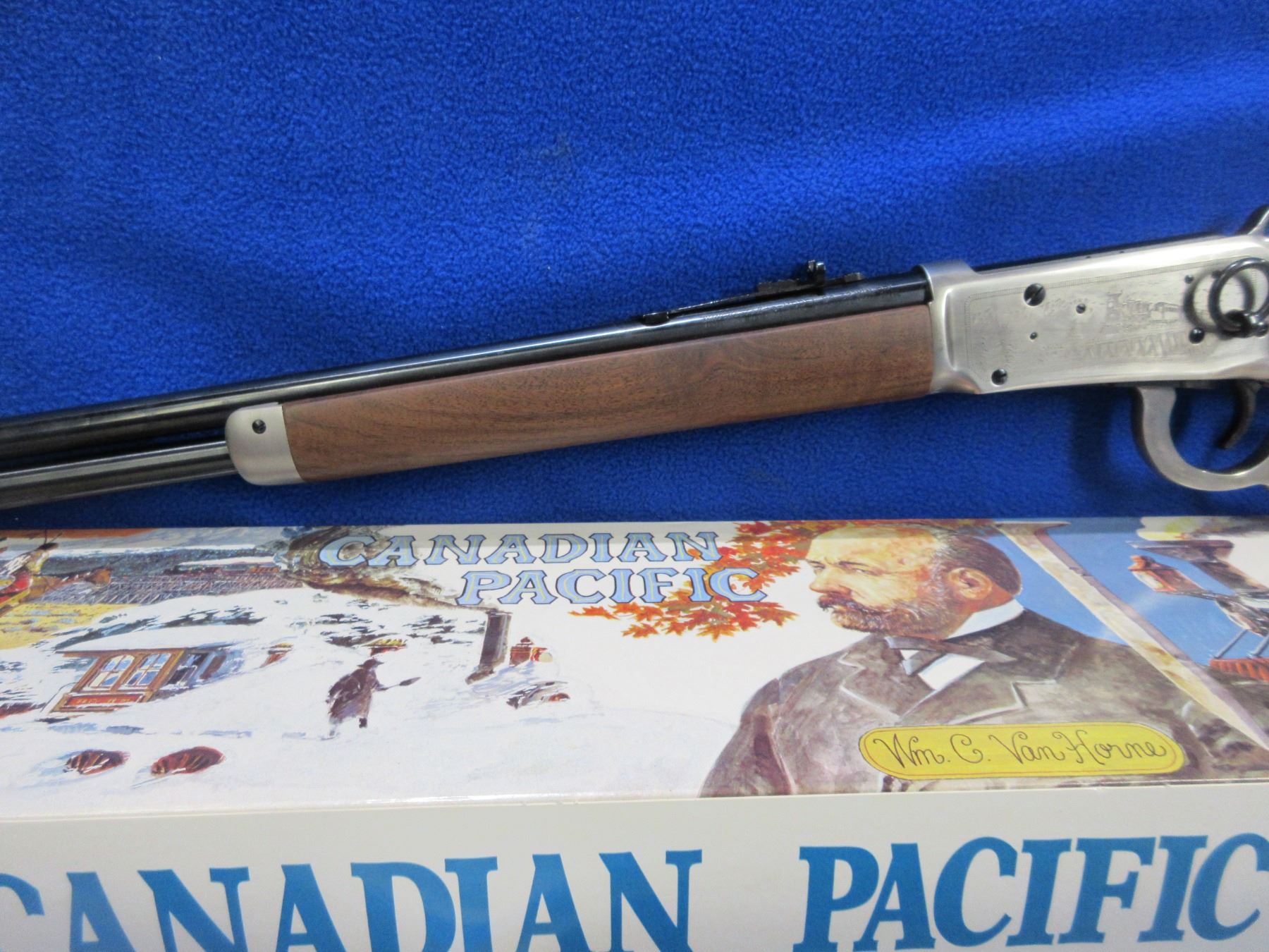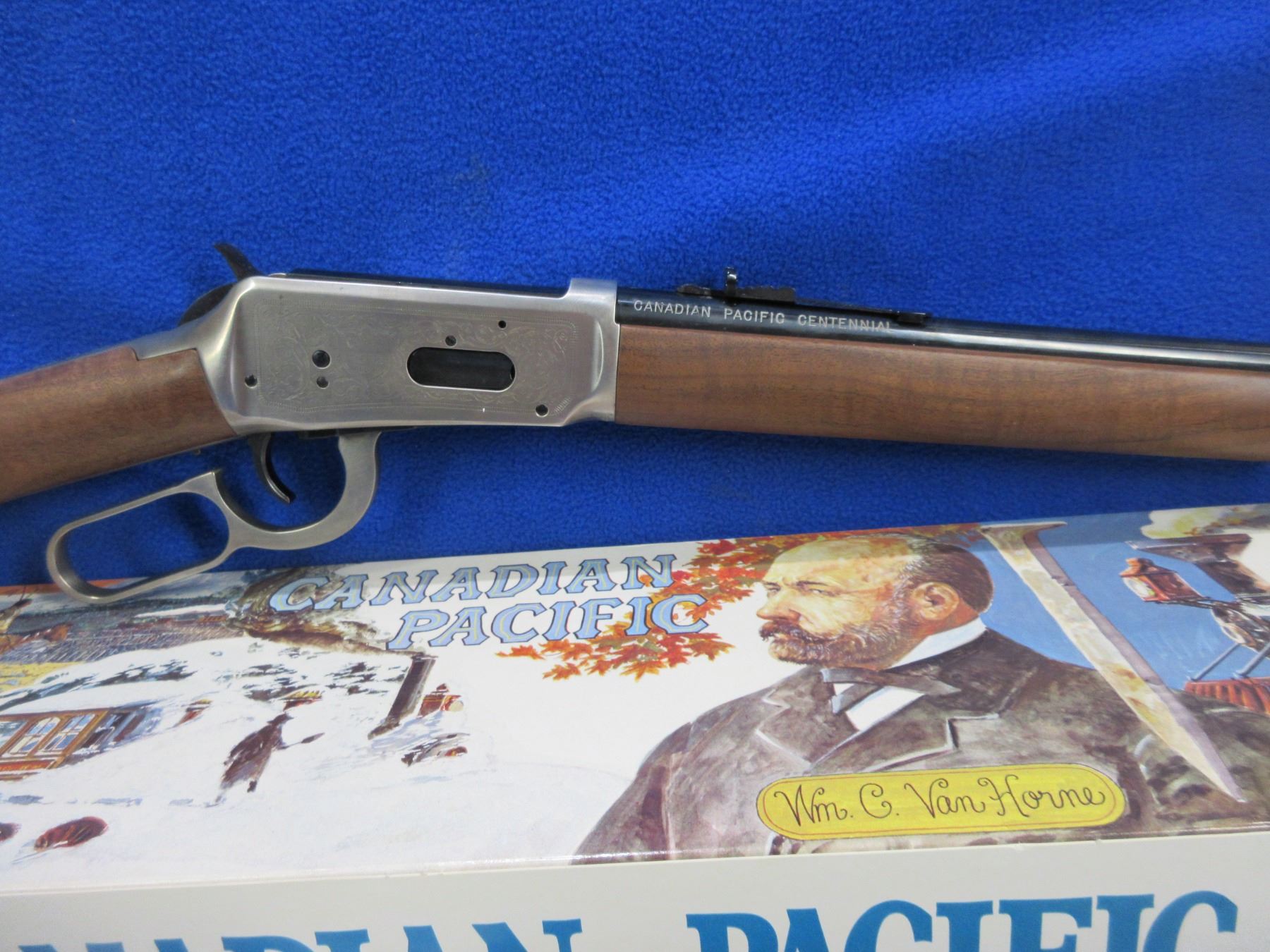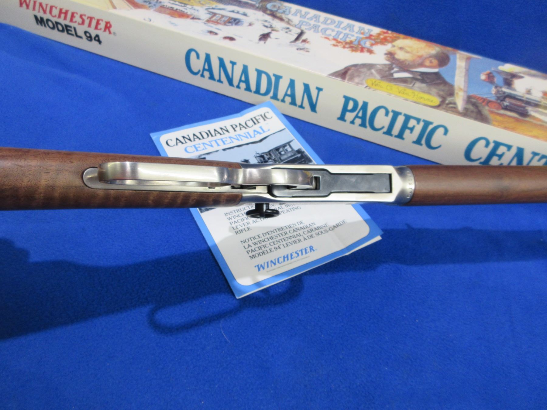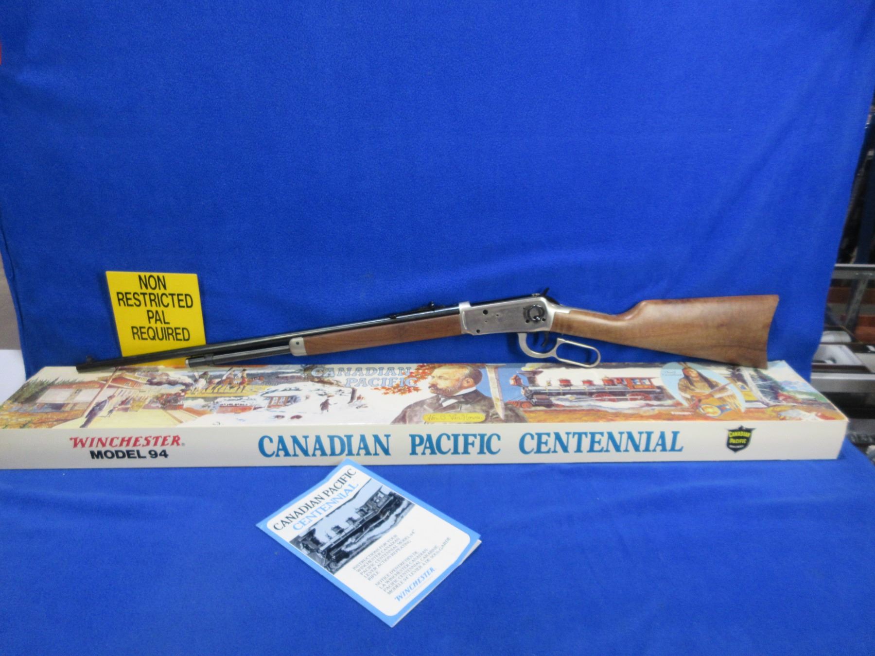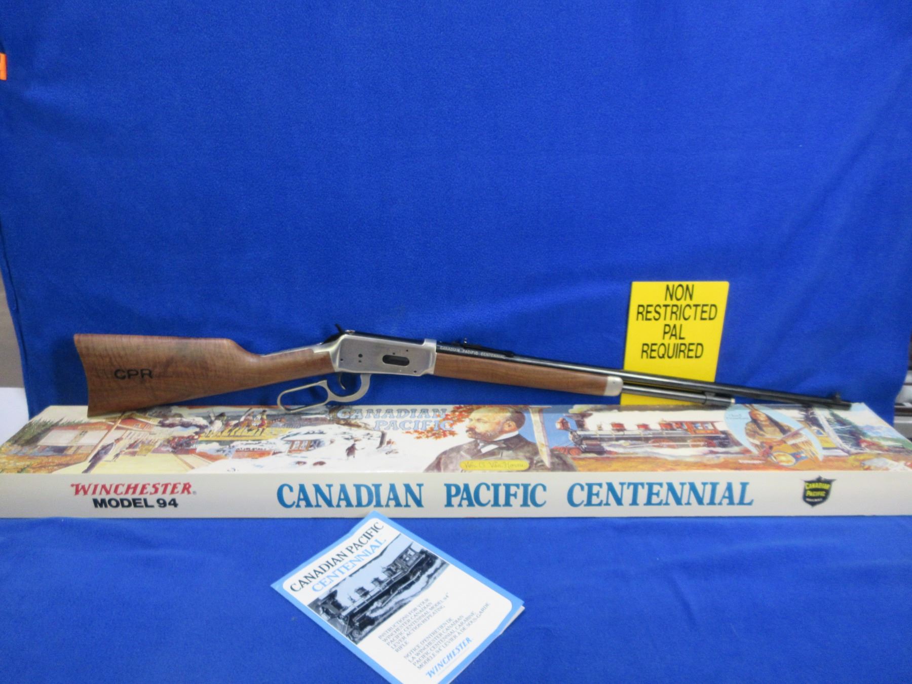 NEW - Non-Restricted - Winchester Model 94 Canadian Pacific Centennial Commemorative in 32 Win Spl - This NEW lever action rifle with tube magazine is part of a 3 rifle set with matching serial numbers (Lots 1201, 1202, 1203). Round barrel with pewter lettering "Canadian Pacific Centennial" is 24", length of pull is 13 1/4", comes with original box and paperwork. Produced to mark the 100th anniversary of the CPR. Pewter-plated lever, forend cap and magazine plug, with the remaining parts deeply blued. The right side of the receiver shows a shield with “Canadian Pacific Railway” on it, surrounded by scroll, while the left depicts a steam engine train crossing a trestle bridge with pine trees in the foreground and mountains in the background. American walnut stock with the letters “CPR“ branded on the right side. Ser # CPC2779