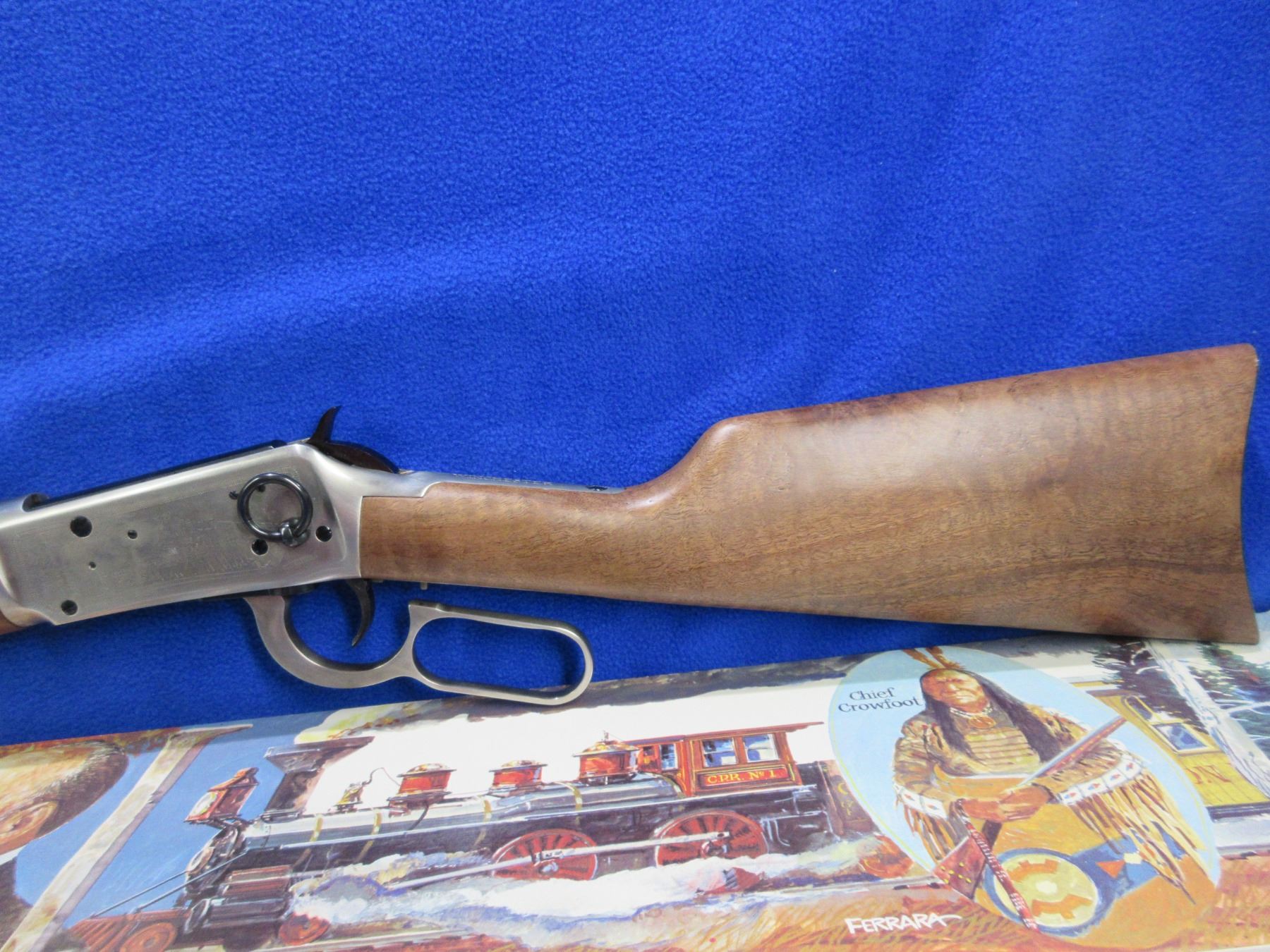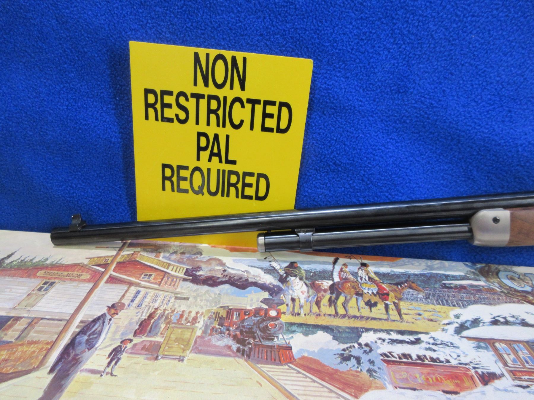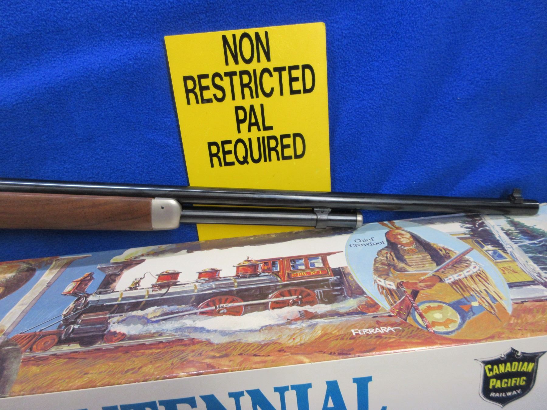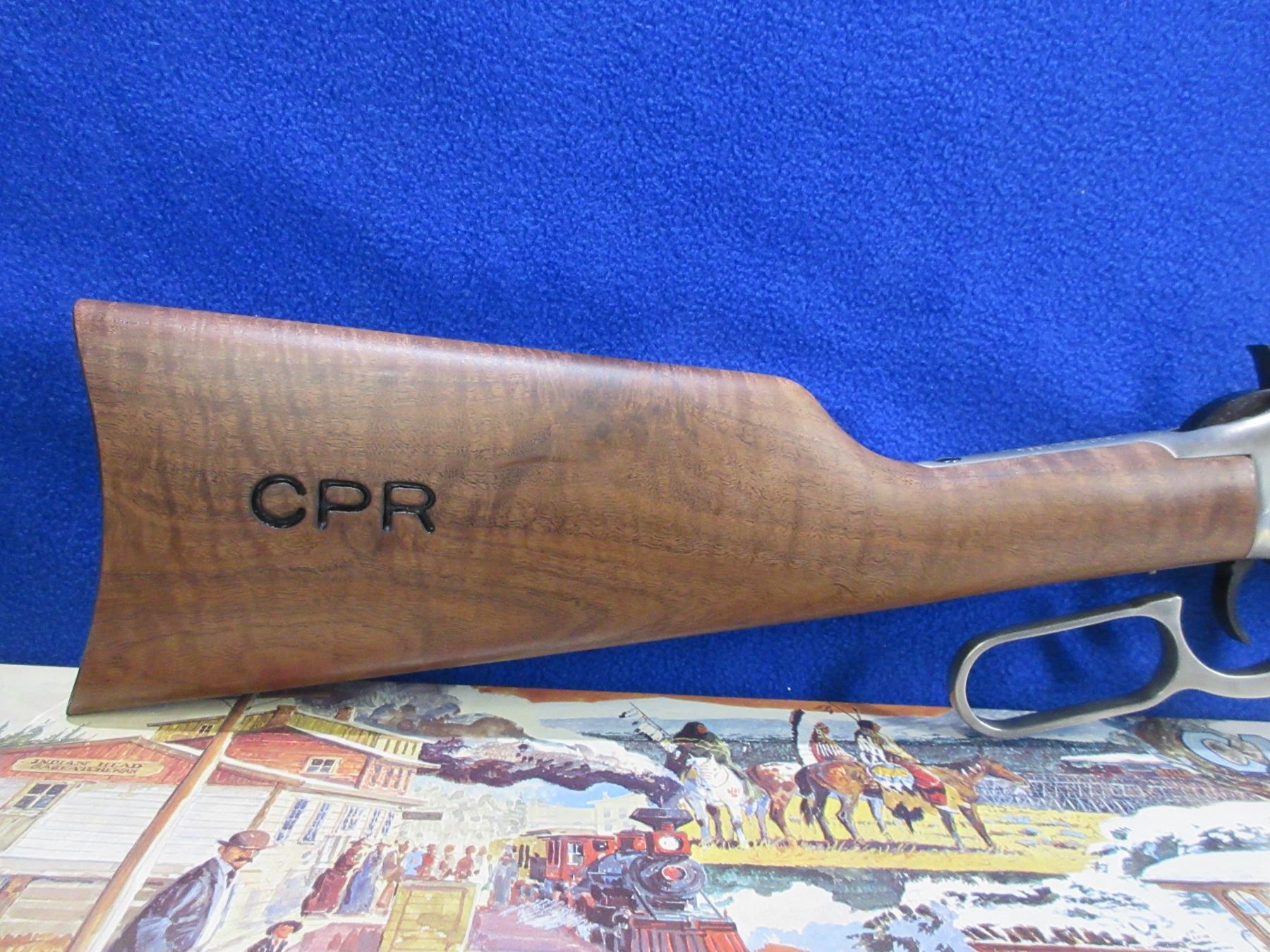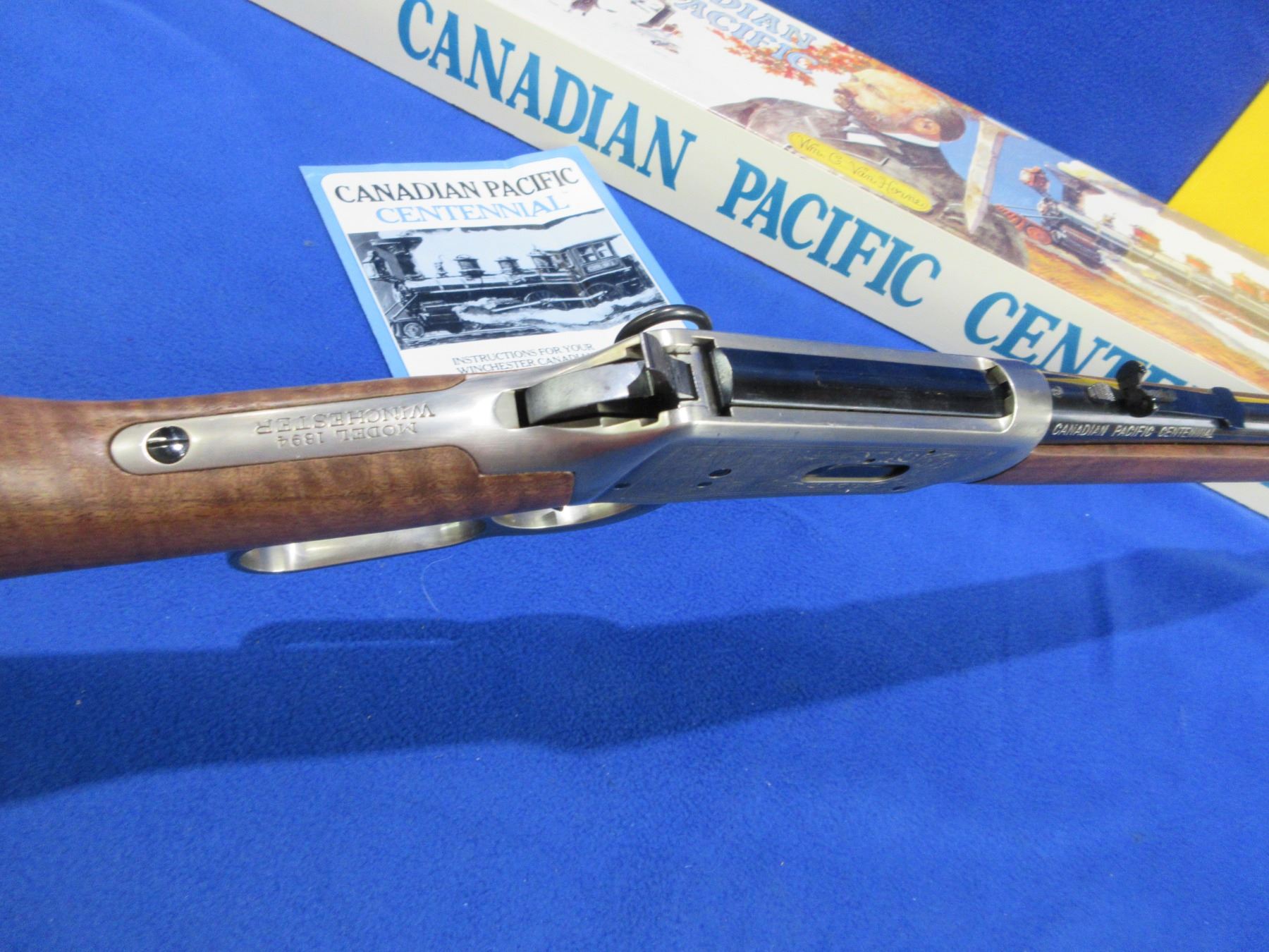 NEW - Non-Restricted - Winchester Model 94 Canadian Pacific Centennial Commemorative in 32 Win Spl - This NEW lever action rifle with tube magazine is part of a 3 rifle set with matching serial numbers (Lots 1201, 1202, 1203). Round barrel with pewter lettering "Canadian Pacific Centennial" is 24", length of pull is 13 1/4", comes with original box and paperwork. Produced to mark the 100th anniversary of the CPR. Pewter-plated lever, forend cap and magazine plug, with the remaining parts deeply blued. The right side of the receiver shows a shield with “Canadian Pacific Railway” on it, surrounded by scroll, while the left depicts a steam engine train crossing a trestle bridge with pine trees in the foreground and mountains in the background. American walnut stock with the letters “CPR“ branded on the right side. Ser # CPC2779
