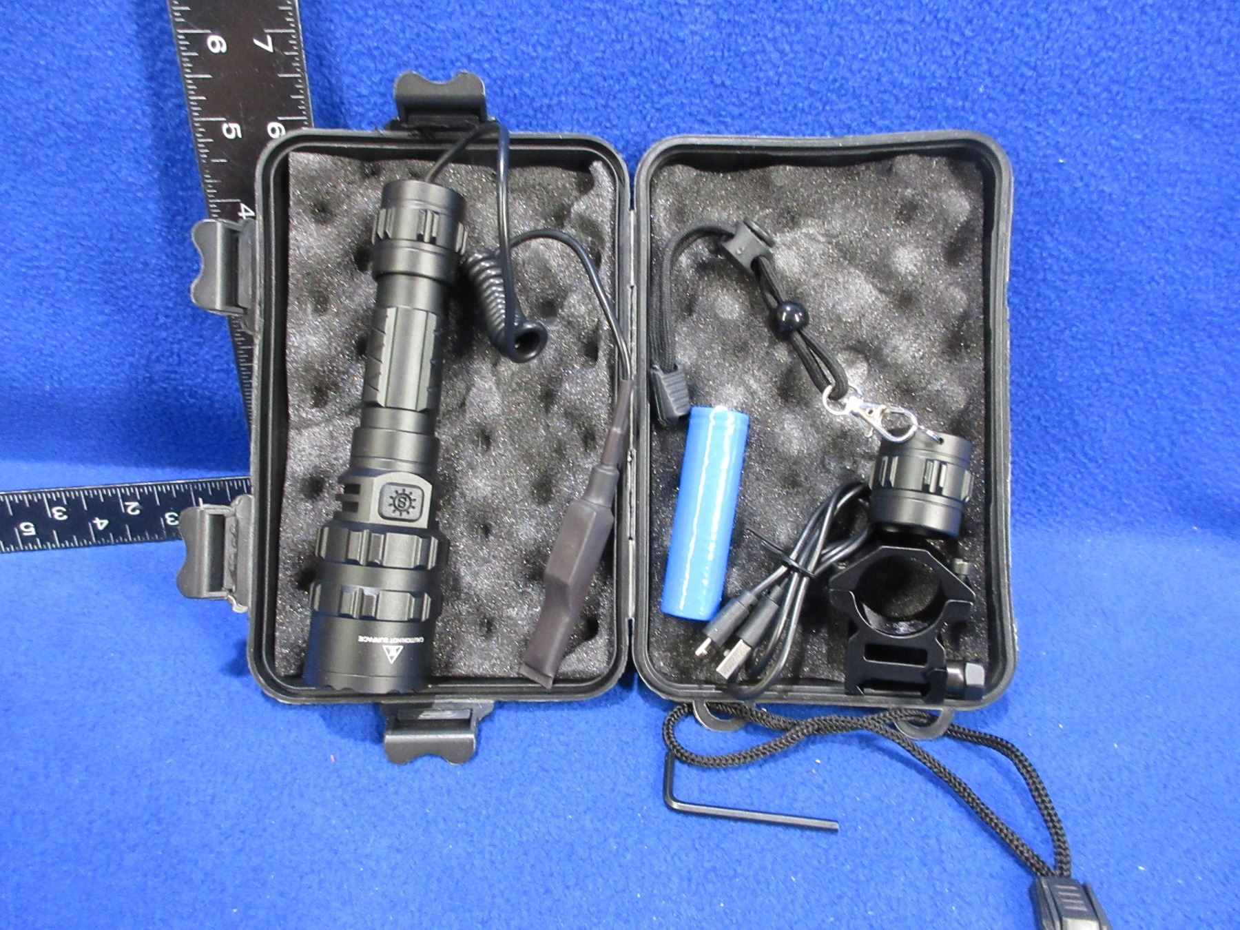 NEW - Rechargeable Tactical Flashlight in Storage Case - comes with Pressure Switch, Mount, Rechargeable Battery, Wrist strap and Charge Cord