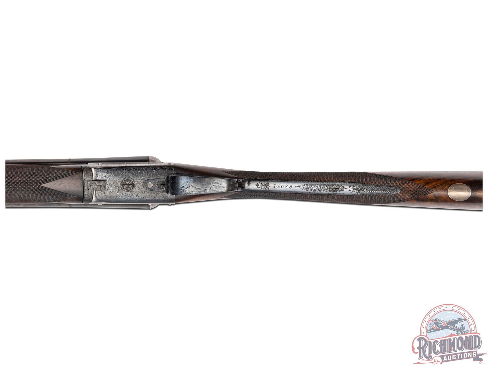 Made in Birmingham, England by Westley Richards in 1890 for Colonel Sir J. Burk and sold through the New Bond Street location. Gun is listed as a side by side 16 gauge shotgun with his gun being the No.2 gun of a matched pair. Fitted with 28" fluid steel 16 gauge Nitro proof sleeved chopper lump barrels originally with 2-1/2" chambers lengthened to 2-3/4". Gun is import marked and comes with importation history from Woodcock Hill of Benton, PA. Barrels are blued with maker marked rib, bead front sight, ejectors and choked Modified and Improved Cylinder. Full coverage vignette engraved boxlock action with "Westley Richards" banner with blued vignette engraved floorplate and trigger guard with a running rabbit on base. Action is controlled by double triggers with top tang automatic safety and a gold "2" on opening lever and word "SAFE" in gold. Select Circassian walnut checkered English grip stock with leather faced recoil pad, and German silver oval vanity plate. Matching walnut checkered splinter forearm with ebony tip. Forearm iron and latch release are vignette engraved with a gold "2" on latch. Comes with a tremendous collection of factory research. LOP: 15-3/8". DAC: 1-5/8". DAH: 2-7/8". CALIBER: 16 GA. S/N: 14688. FFL STATUS: Antique.