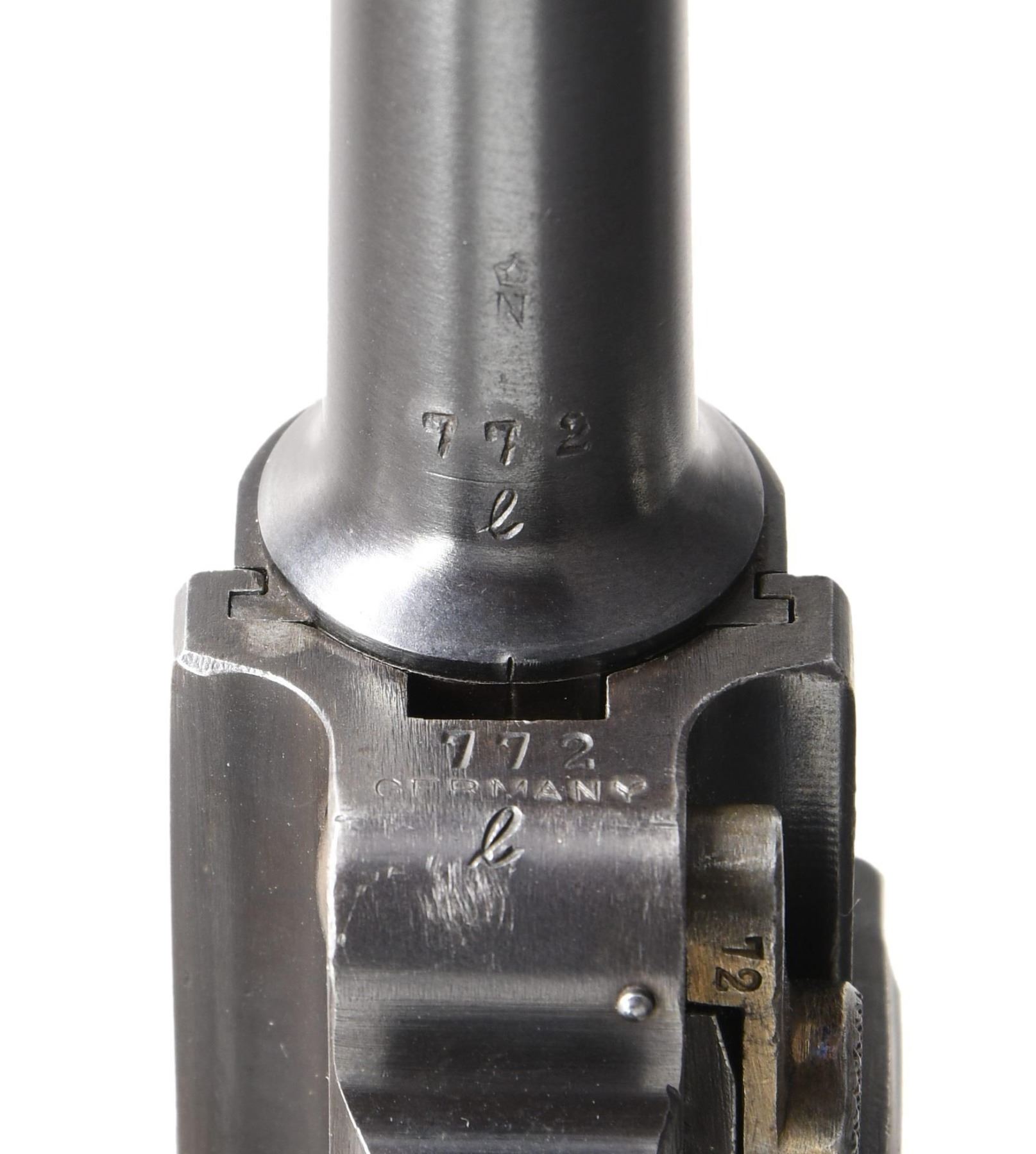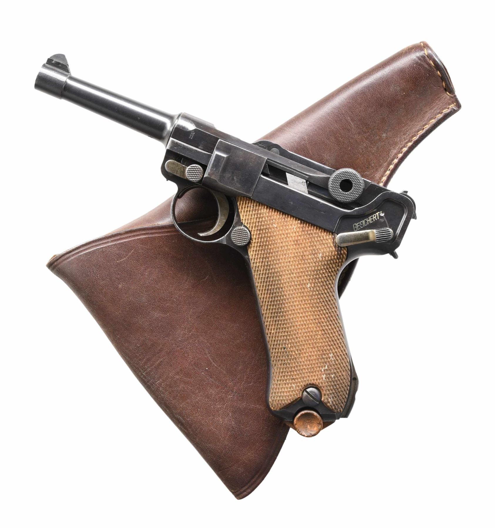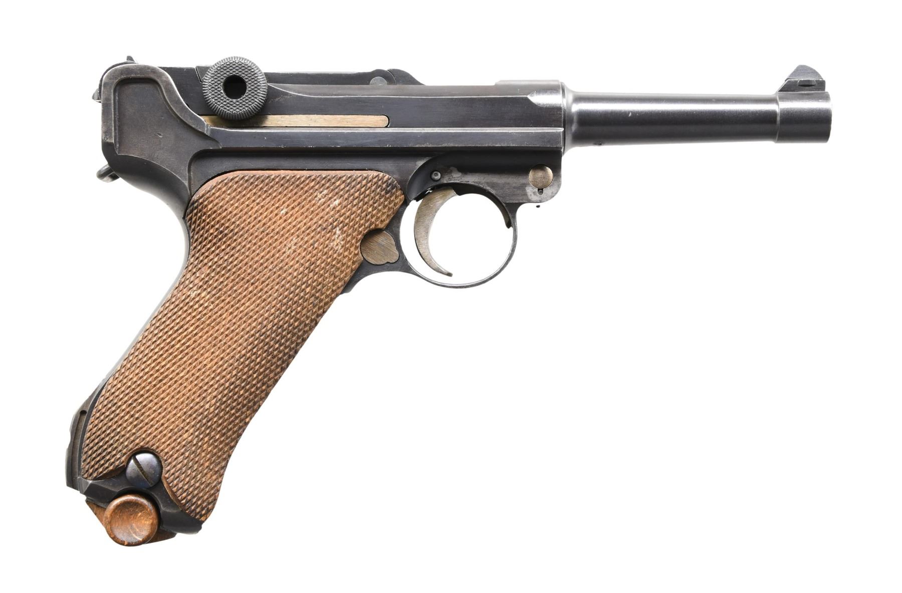 SEMI-AUTOMATIC PISTOL WITH CUSTOM HOLSTER. Cal. 30 Luger. S# 772L. Bbl. 3 3/4". Model 1920 Commercial Luger semi-automatic pistol, mfg. by DWM from surplus and newly mfg. parts after the conclusion of WWI. Toggle is marked with the intertwined "DWM" monogram. Underside of bbl., as well as the left side of the bbl. extension and the breechblock exhibit a horizontal Crown/N commercial nitro proof. Major metal components exhibit a blue finish overall, with some small parts, including the takedown lever, trigger, safety lever, and ejector, exhibiting a straw finish. Frame is mounted with 2-piece checkered wood grips. All serialized components are matching and include the frame, takedown lever, sideplate, bbl., and rear toggle link. MAGS: two 8-rd.; one marked with an Eagle/SU4 on the aluminum bottom. UNATTACHED ACCESSORIES: custom period brown leather holster. CONDITION: metal components retain the majority of their original factory blue finish, exhibiting some areas of mild wear and thinning, as well as some scattered spots of light surface oxidation overall. Strawed components retain the majority of their finish, exhibiting some light wear as well as scattered spots of pinprick oxidation and age-related discoloration. Very bright bore, exhibiting consistent light pitting while retaining strong rifling throughout. Grips are very good overall. Holster remains malleable, exhibiting some light wear overall. (24-3800/MLW). CURIO. $800-1,200.