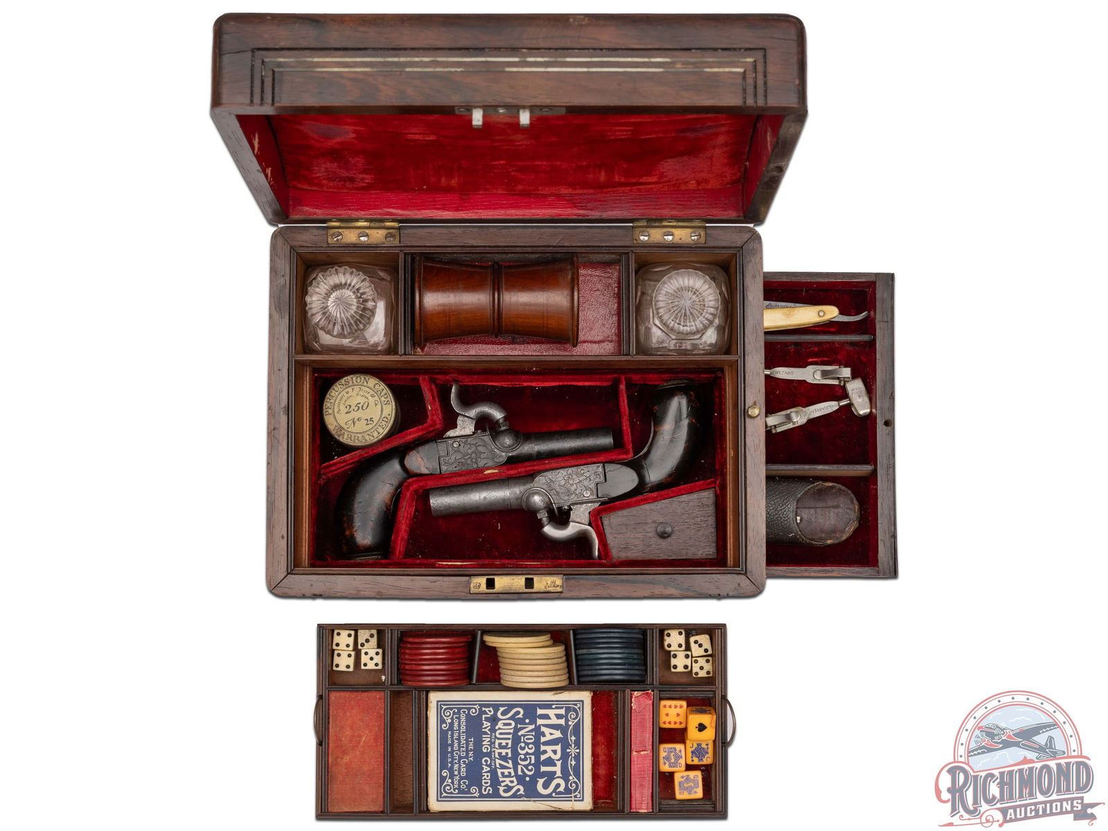 Professional Gambler's Kit from the 1870's assembled by unknown maker. When looking at this set it puts one in the mind of something Doc Holiday would have used as he traveled from town to town in the Old West practicing his trade. Kit is contained in a walnut felt lined box measuring 10" x 7-1/2" x 6" with silver key hole escutcheon and silver lid banner plate for owner's name. Upon opening case you see all the wares of the trade including, 3 styles of dice, a lathe turned wooden dice cup, 2 glass liquor decanters, red, blue and white ivory Poker chips and a pack of Hart's "Squeezer" No. 352, 1870's vintage playing cards. When you remove the gaming items tray you expose two Belgian "Screw" barrel percussion pistols with 50 caliber smoothbore chambers with percussion floral engraved case-hardened actions and matching mahogany grips and hidden triggers. With the guns is an empty vintage F. Joyce & Co. percussion cap tin. When the case is open there is a brass knob when pulled a spring loaded draw comes out containing a bone handled straight razor, and monogrammed cigar case, wire rimmed glasses in leather case and two "WIZARD" sleeve card holders for use by the nefarious card player. CALIBER: 50. FFL STATUS: Antique.