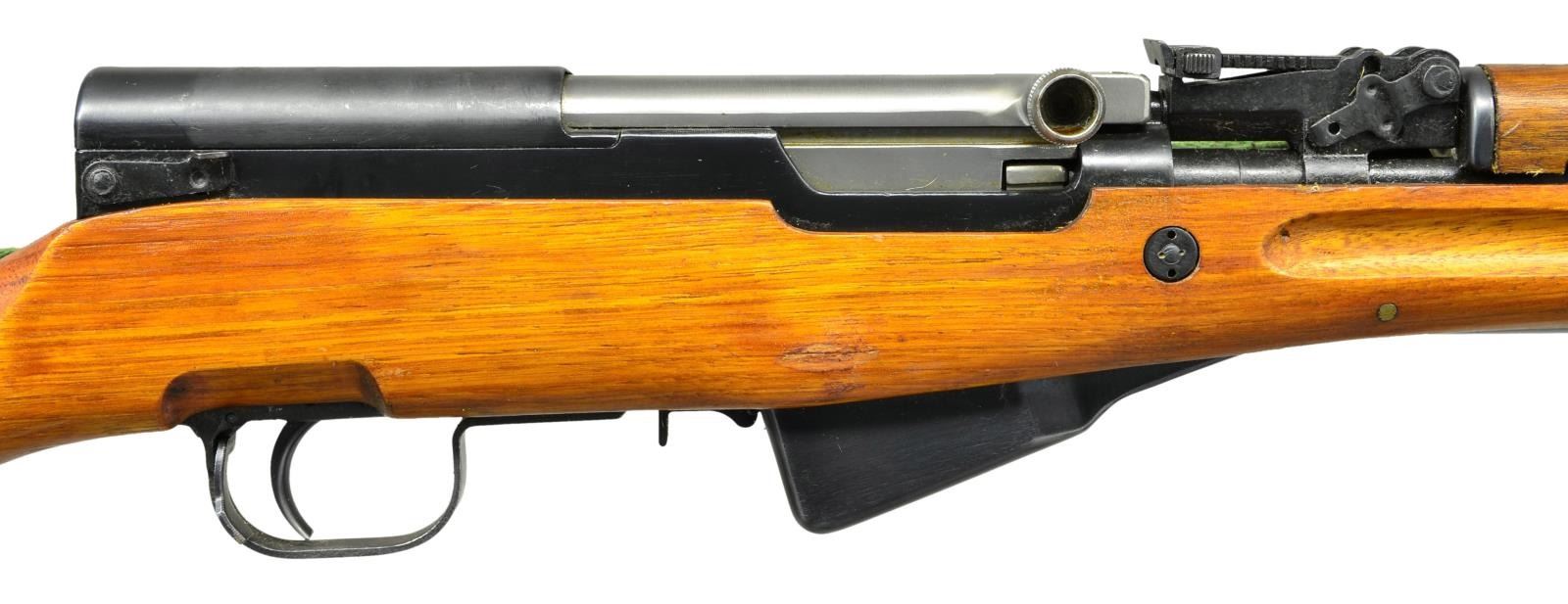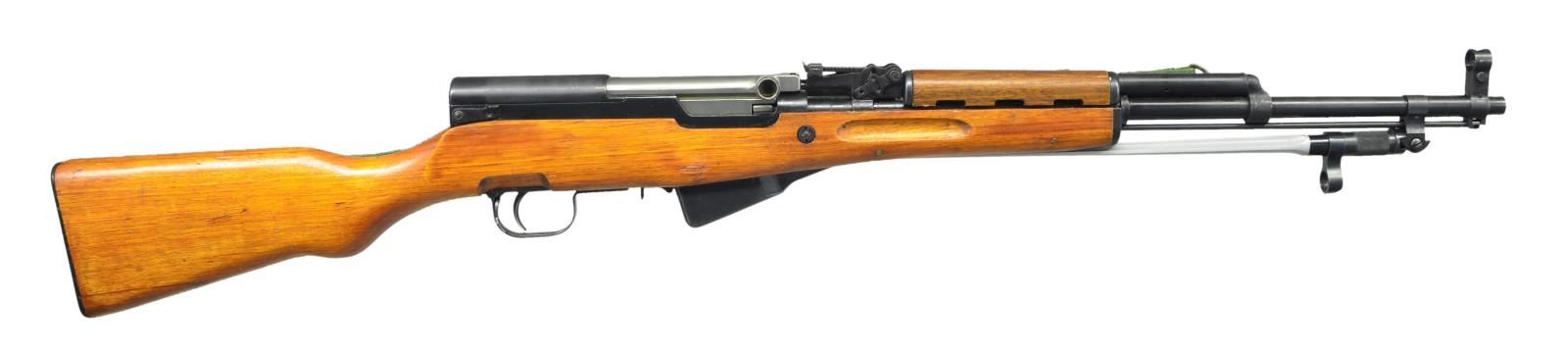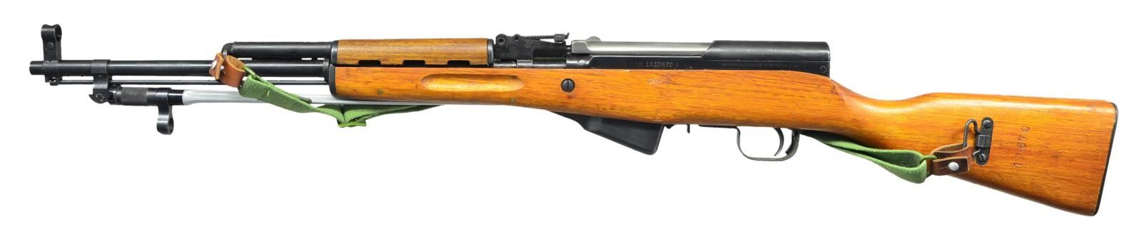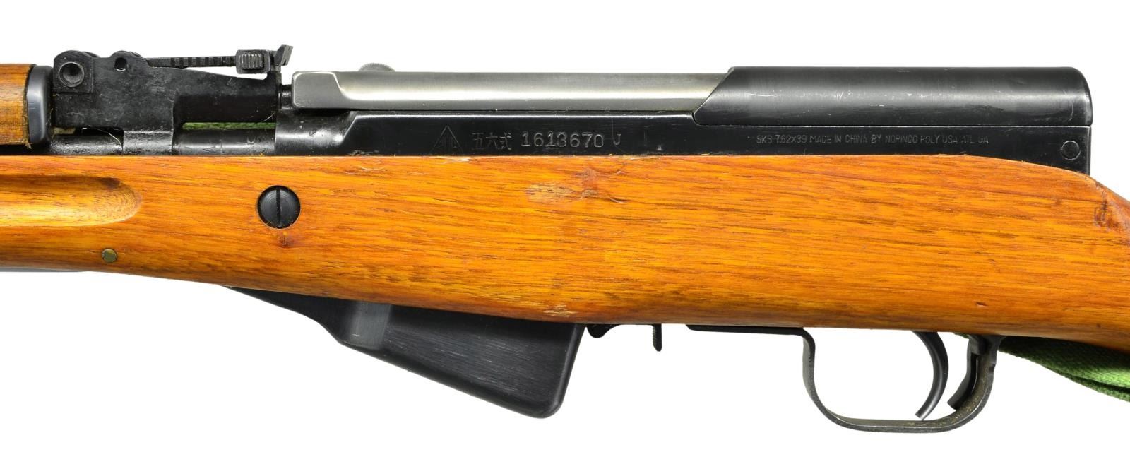 Cal. 7.62x39. S# 1613670. Bbl. 20 3/8". All visible numbers are matching. Front left of receiver has Chinese Arsenal 306 marking, Chinese characters & serial number. Rear left of receiver has Norinco import marking. Tangent rear sight graduated to 1000m. Post front sight w/ hood. Folding 11" spike bayonet. Asian hardwood stock set w/ left side sling swivels. Com Bloc style sling & cleaning rod present. UNATTACHED ACCESSORIES: accessory kit present in butt compartment. A reprint of TC9-56 manual pertaining to the SKS rifle. CONDITION: stock set has a small splice repair near mag well, stock otherwise shows some scattered handling marks. Metal retains 90% arsenal blue w/ much of the loss due to fading on top cover. Very good plus shiny bore. (23-965/MJC). MODERN. $300-500.