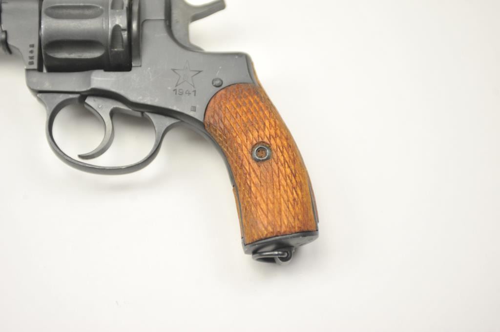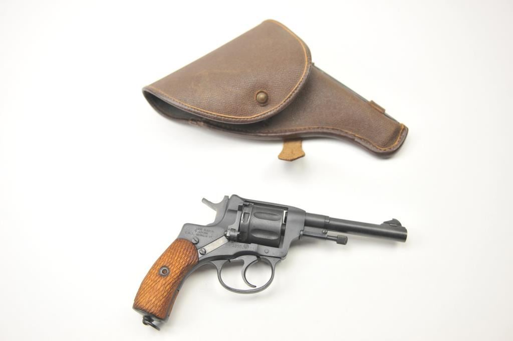 Nagant Model 1895 DA revolver, 7.62 x 38R caliber, Serial #189529733. The pistol is in nearly excellent overall condition with a 4 ½” barrel. The pistol retains approximately 98-99% of the matte blue finish with numerous Russian proofs and acceptance marks. There is a Russian star on the left side of the frame dated 1941 and it is import marked on the right. The crudely checkered wood grips are in very good condition and reflect thewartime production. The butt includes the original lanyard ring. The lot also includes a period pebble finished leather flap holster with cleaning rod. The bore is good, the action functions and the markings arecrisp on this WWII production Nagant dated 1941. Est.: $200-$400. (C+R/PPT).