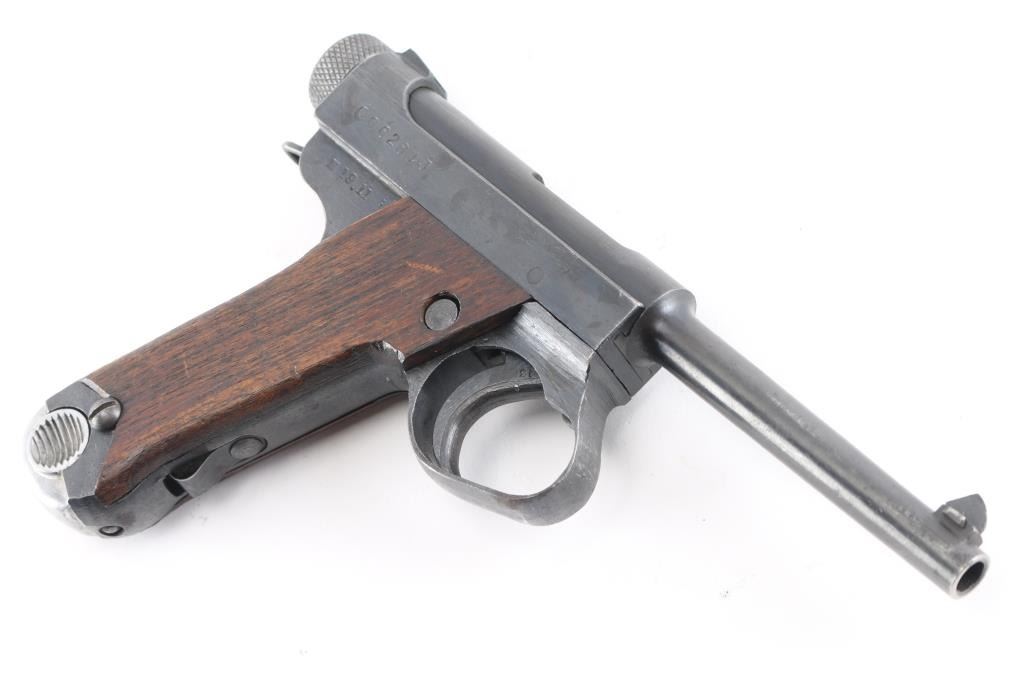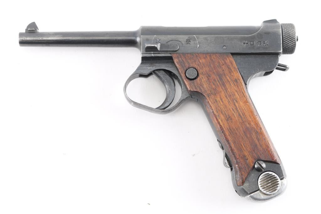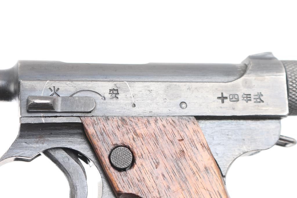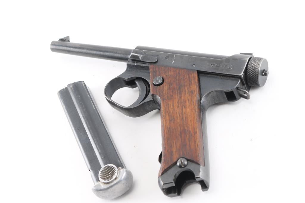 Semi-automatic pistol. Matching magazine. 8-rd magazine. Second Series Nagoya Nambu". Produced by the Toriimatsu branch of the Nagoya Arsenal.WW2 Japanese Military issued sidearm. Dated 19 11-November 1944. Recoil-operated, locked breech. Fixed blade/notch sights. 4.61" round barrel. Magazine retention spring on foregrip. Large triggerguard. Lanyard stable on rear frame. Later production solid knurled cocking piece. Serial numbers matched on frame, trigger. "Type 14" marked on left frame. Late war smooth wood grips. Frame mounted safety. Bore appears excellent/bright. Original blued metal finish is about 95% with some minor scratches/edge wear. Circular tracking line over the safety lever. Grips are very good/sound with minor scratches/dents. Blued magazine with alloy base, stamped "643", matching the pistol. No import marks, vet bring back.NRA Condition-Very Good. C&R Pistol.