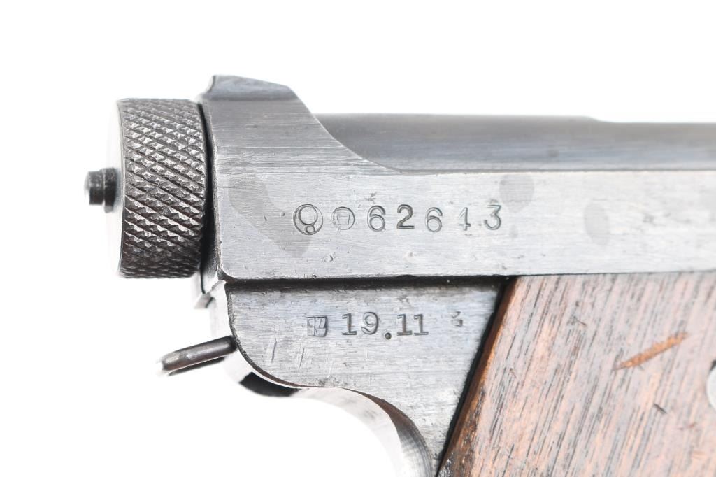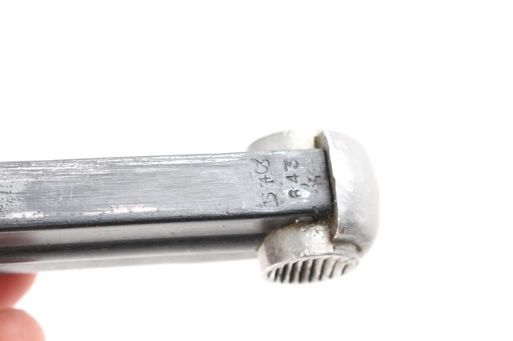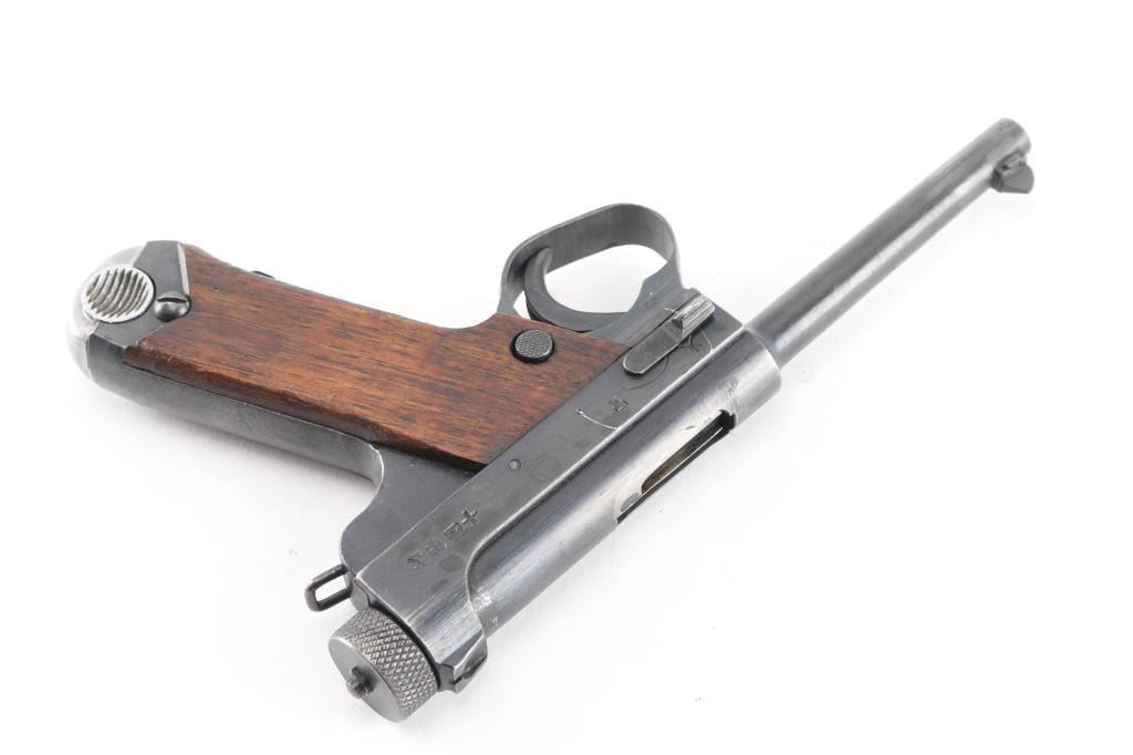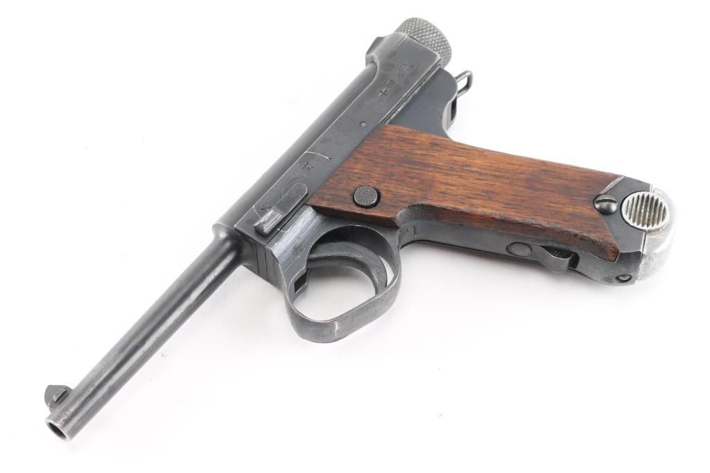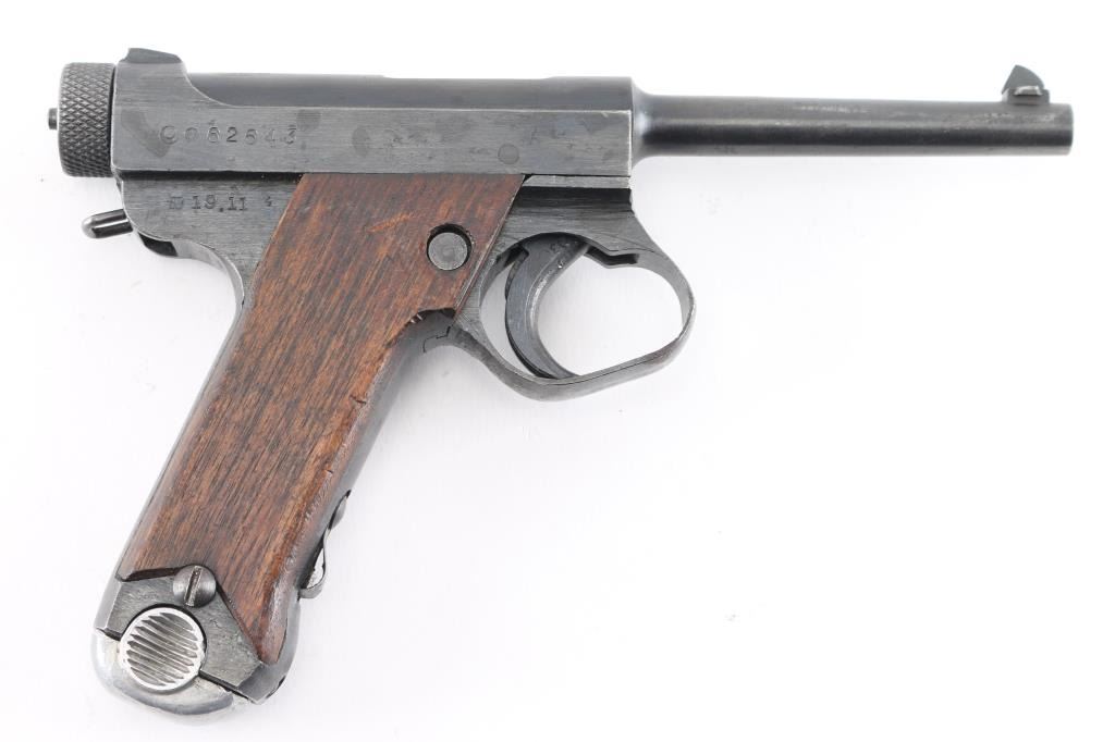 Semi-automatic pistol. Matching magazine. 8-rd magazine. Second Series Nagoya Nambu". Produced by the Toriimatsu branch of the Nagoya Arsenal.WW2 Japanese Military issued sidearm. Dated 19 11-November 1944. Recoil-operated, locked breech. Fixed blade/notch sights. 4.61" round barrel. Magazine retention spring on foregrip. Large triggerguard. Lanyard stable on rear frame. Later production solid knurled cocking piece. Serial numbers matched on frame, trigger. "Type 14" marked on left frame. Late war smooth wood grips. Frame mounted safety. Bore appears excellent/bright. Original blued metal finish is about 95% with some minor scratches/edge wear. Circular tracking line over the safety lever. Grips are very good/sound with minor scratches/dents. Blued magazine with alloy base, stamped "643", matching the pistol. No import marks, vet bring back.NRA Condition-Very Good. C&R Pistol.