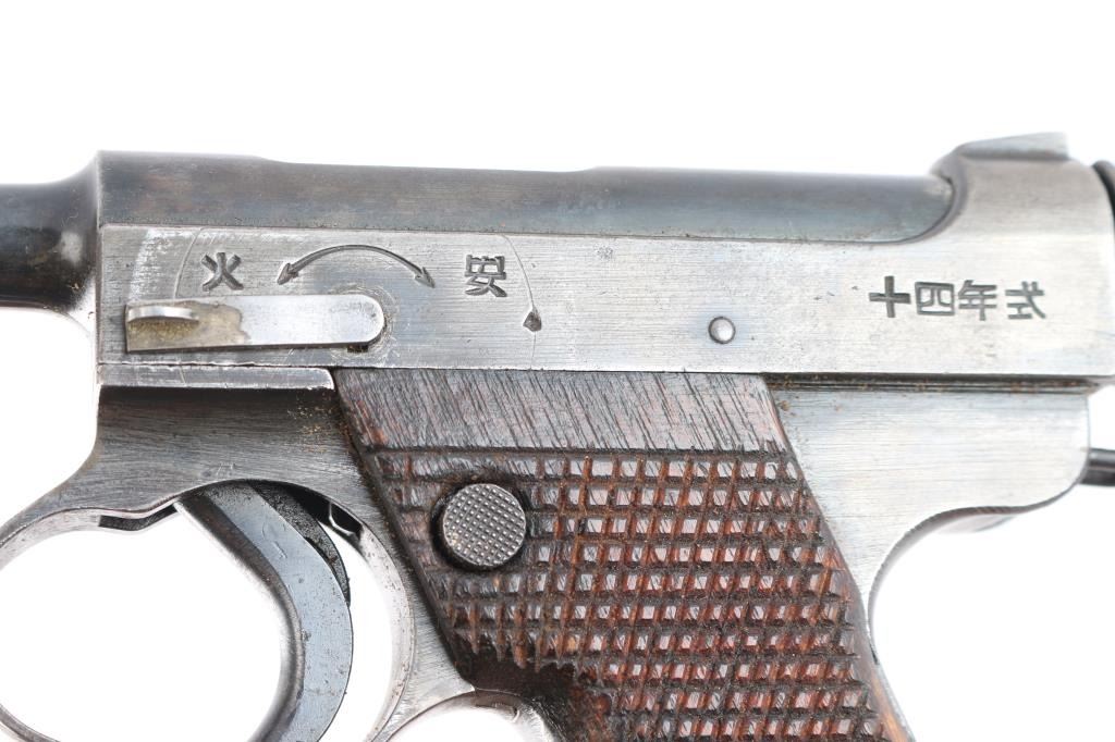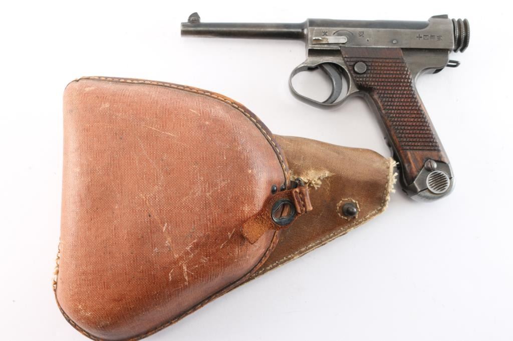 'Second Series' WWII era Japanese military striker fired semi-automatic service pistol chambered in 8mm Nambu, manufactured at the Nagoya Arsenal June, 1943. Features a blued finish, 4.6" barrel, dovetailed inverted 'v' front sight, fixed square notch rear sight, rounded trigger, large trigger guard, knurled cocking piece, manual safety on the left side of the frame, (Safety lever is a replacement) magazine disconnect safety, push button magazine release, 8 round magazine, steel frame with lanyard loop on the rear and hand checkered wood grips. No import marks have been observed. Bore is overall very good/bright with a very small area of light pitting. Retains about 70% of blued finish, dulling, with scattered light patina throughout, a bright drag line on the frame from the safety lever, bare metal on sharp edges and around muzzle. Grips are good serviceable condition, lightly scratched. Includes a fair rubberized canvas original flap holster, the flap has separated.