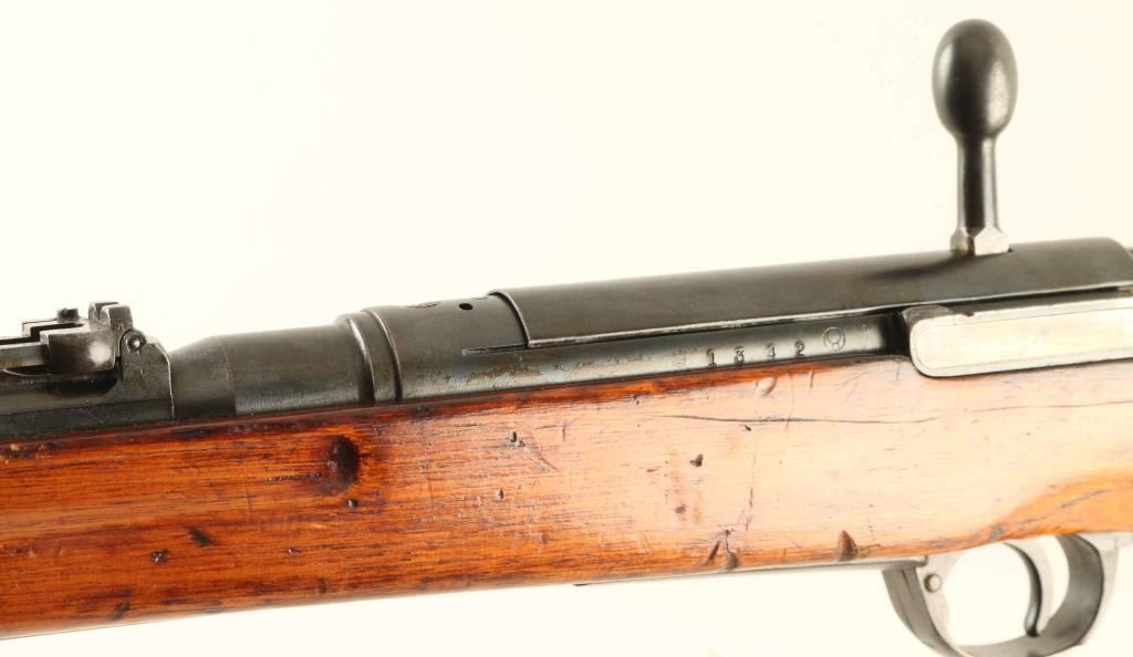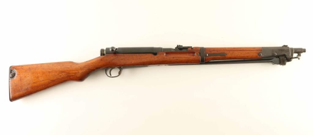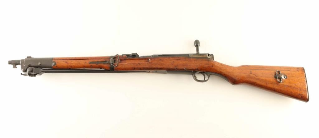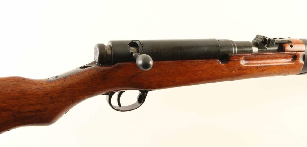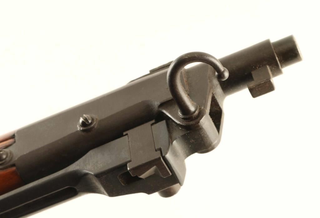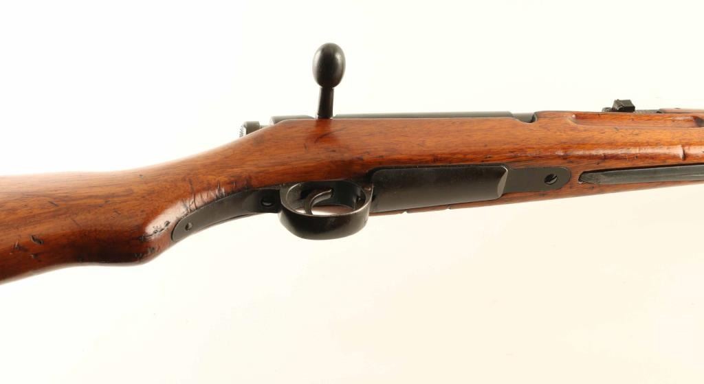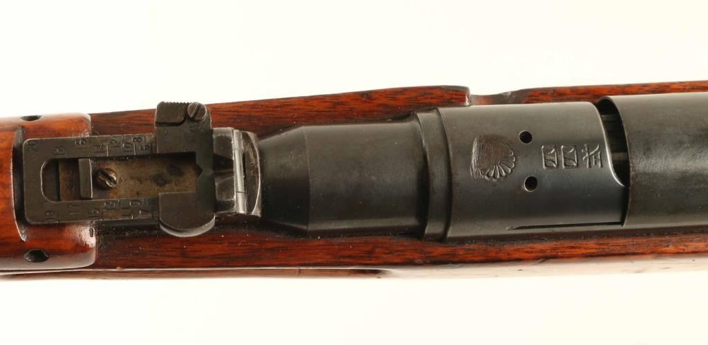 SN: 1342 'Second Series' Ground Chrysanthemum. Japanese military bolt action rifle features 19" barrel, blade front sight (protector ears removed), V notch rear sight with flip-up elevator ladder, folding spike bayonet, stacking hook, butt compartment for cleaning rod sections (rod not present), side mounted sling swivels, manual safety, hinged floorplate, dust cover. Bore is good or better condition, frosted appearance with strong rifling. Retains 80% blued finish, turning brown with dull thin patina at bayonet lug assembly, plum color on dust cover, bare metal on some sharp edges. Bolt is in the white, with safety knob showing blued finish on the rear section. Straw color visible on bolt stop spring, trigger & floorplate release. Wood is good to very good condition with many small scrapes, scratches & dents. Appears to have a thin coat of varnish added over the original finish. Butt dovetail is tight. Dust cover numbered "801". Matching numbers observed on bolt.. Condition is NRA Very Good - stock refinished *** C&R Firearm ***