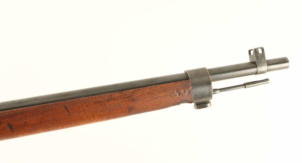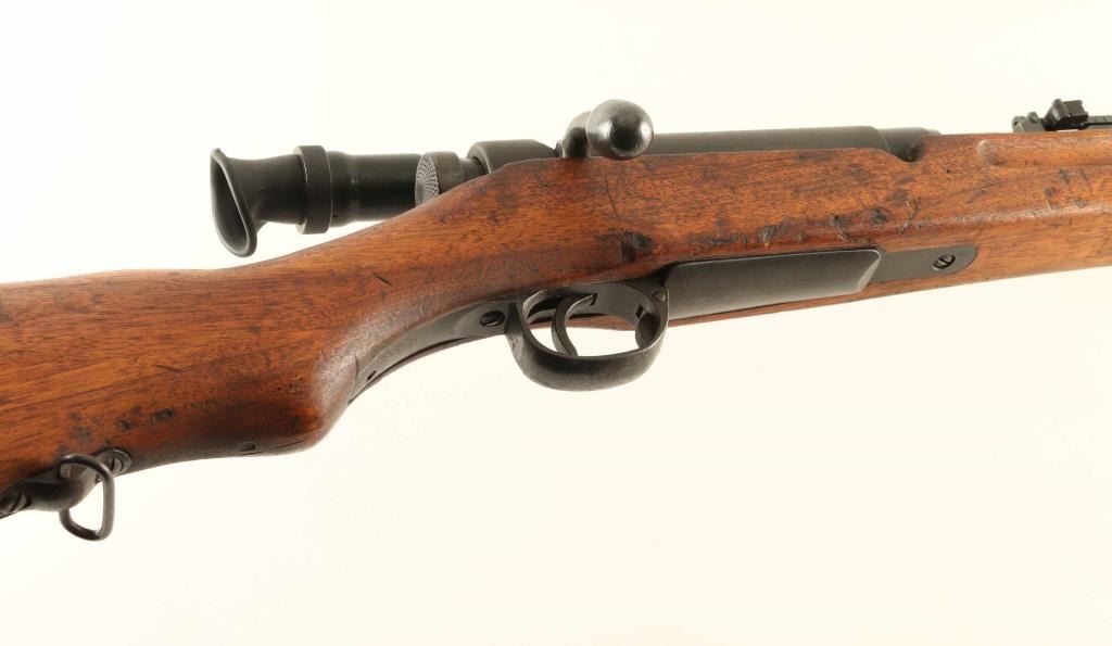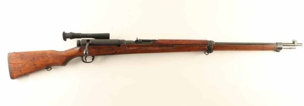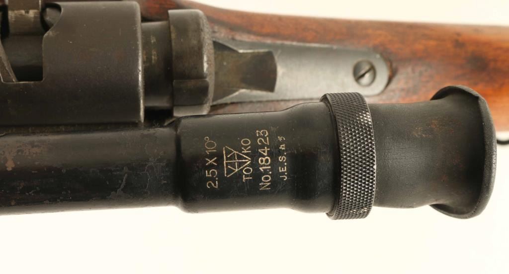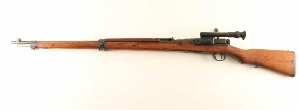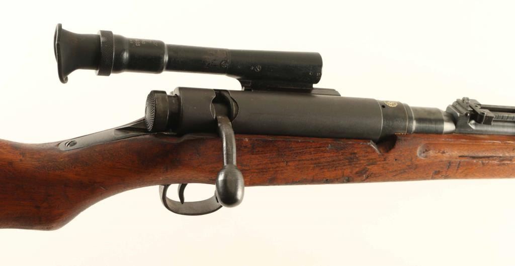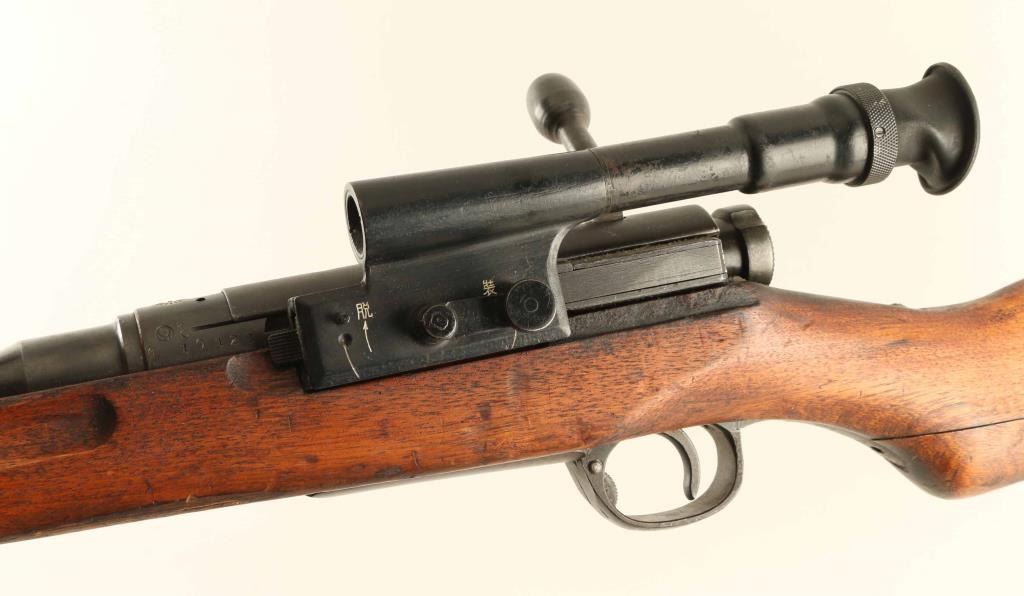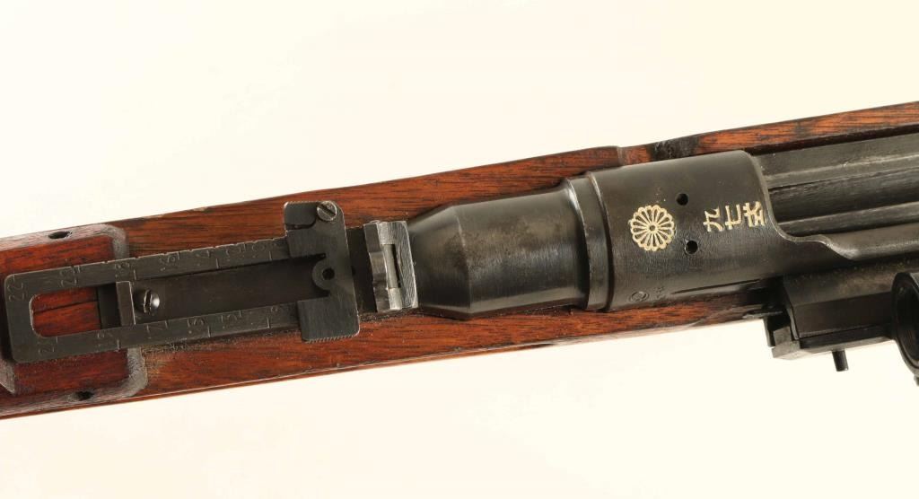 SN: 10128 'First Series' Intact Chrysanthemum. Japanese military sniper rifle manufactured circa 1938 - 1943. Features 31" barrel, cleaning rod, bayonet lug, blade front sight with protector ears, V notch rear sight with elevation ladder, hinged floorplate, manual safety, sling swivels, dust cover, curved bolt handle, side mounted quick detachable 2.5x scope. Rear band has lug for monopod, but no monopod present and no clear marks on forend to indicate previous installation. Bore is good condition with strong rifling. Retains 70% blued finish, fading or graying on bands and rear of receiver, bare metal on sharp edges. Dust cover is dulled with even light patina. Bolt is blued, showing much bare metal where parts rub during operation. Screw heads show marring. Wood is good condition with many small dents & dings, several scrapes and shallow gouges, general thinning of finish. Scope is good condition, with visible tiny specks or bubbles darkening the view slightly. Rubber eyecup is partially collapsed, misshapen. Bolt handle & firing pin numbered "128", safety knob numbered "871". Dust cover numbered "744". No observed serial numbers on scope. Condition is NRA Good+ *** C&R Firearm ***