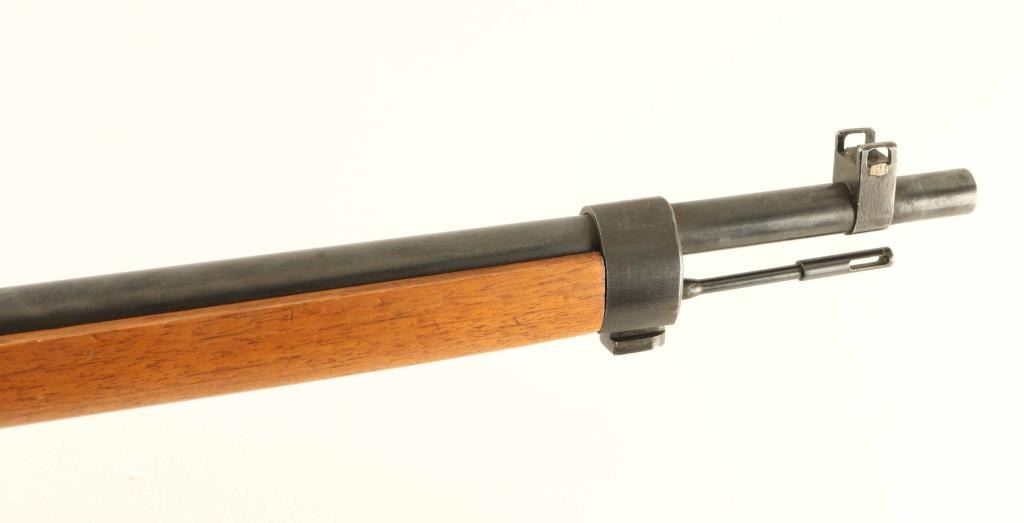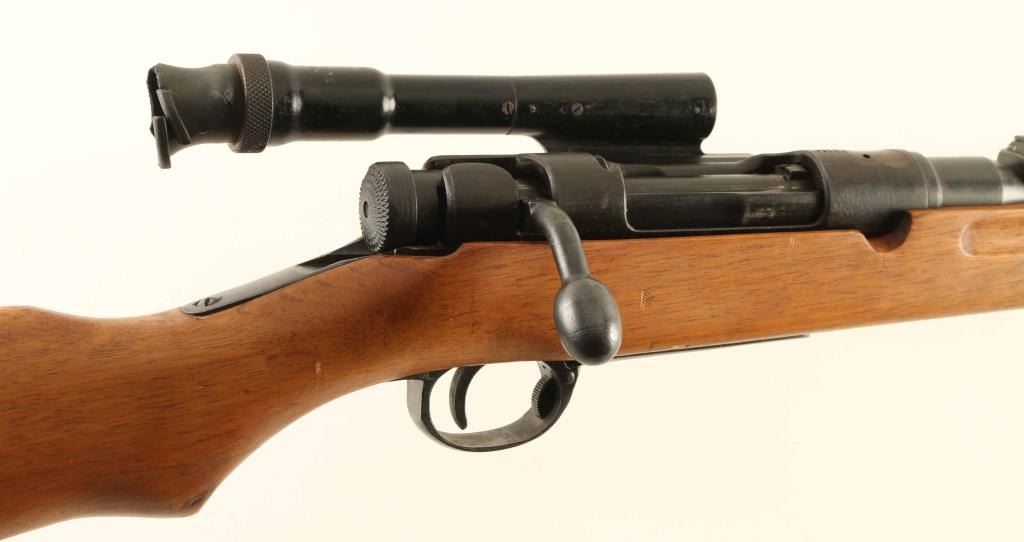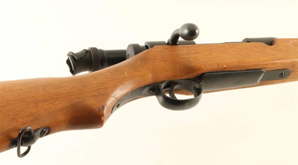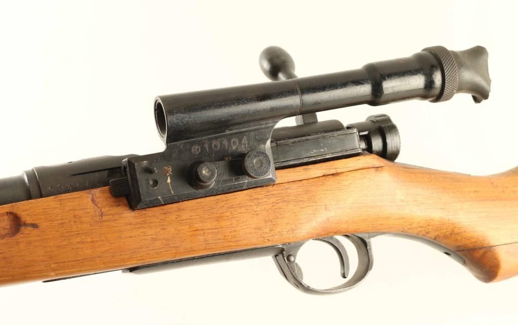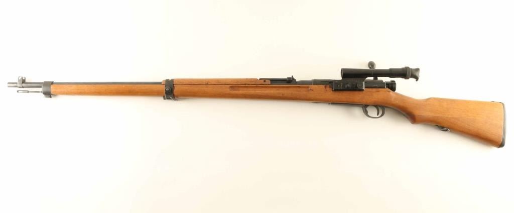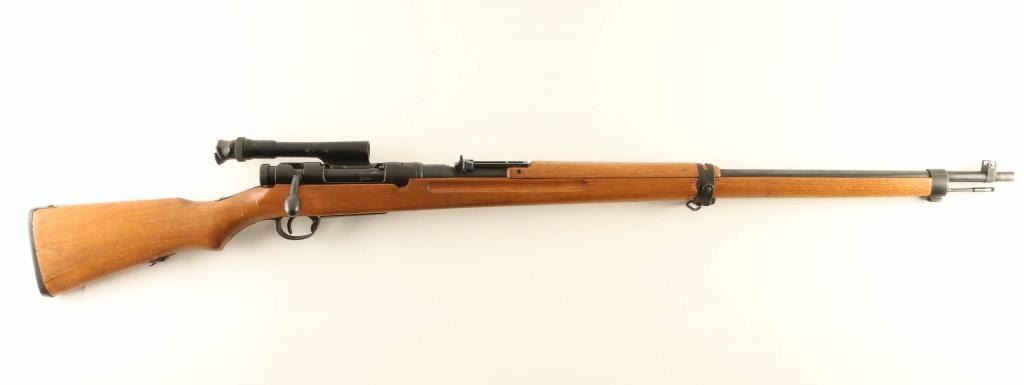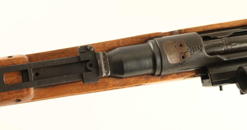 SN: 13643 'First Series' Ground Chrysanthemum. Japanese military sniper rifle manufactured circa 1938 - 1943. Features 31" barrel, cleaning rod, bayonet lug, blade front sight with protector ears, V notch rear sight with elevation ladder, hinged floorplate, manual safety, sling swivels, curved bolt handle, side mounted quick detachable 2.5x scope. Bore is good condition, frosted with strong rifling. Retains 80% blued finish (appears re-blued), with bare metal on sharp edges and where parts rub during operation. Screw heads show marring. Wood is very good condition, appears lightly sanded and refinished with an oil type finish. Butt join is tight. Scope is good condition, overall clear with many tiny dark spots in view. Rubber eyecup is distorted and partially collapsed, hard & inflexible. Bolt handle, safety & firing pin numbered "643". Scope marked "10104" on outer side of dovetail. Condition is NRA Very Good as refinished *** C&R Firearm ***