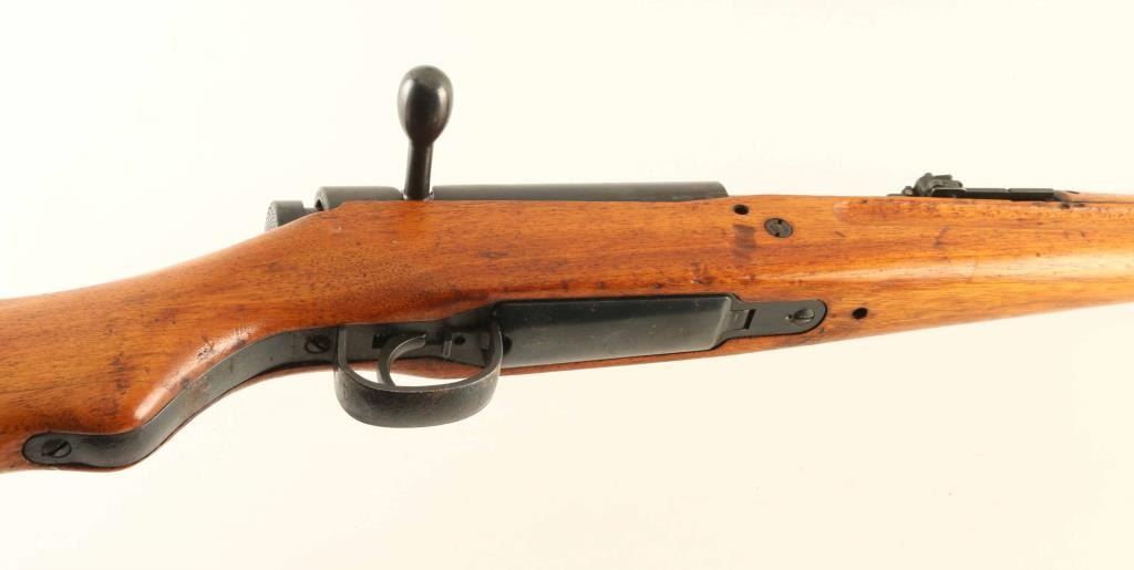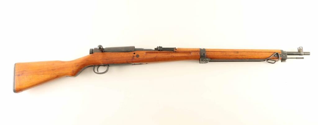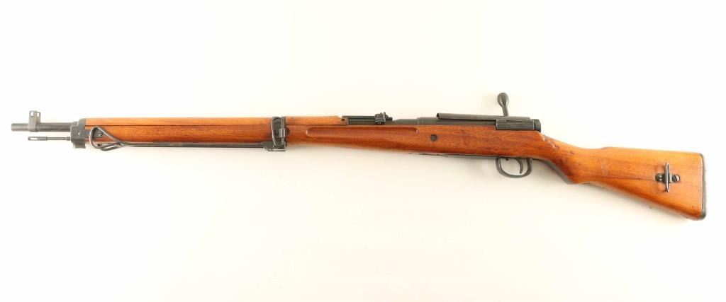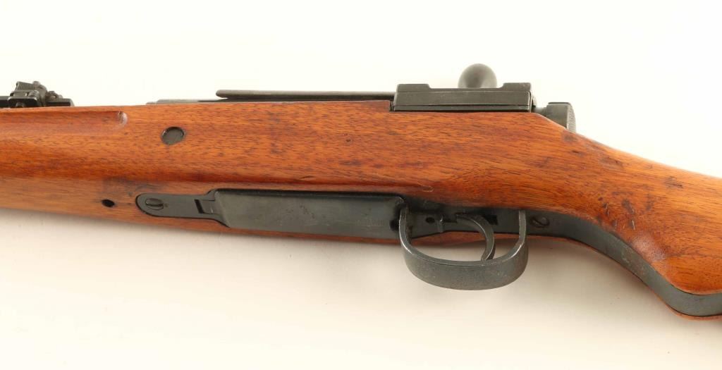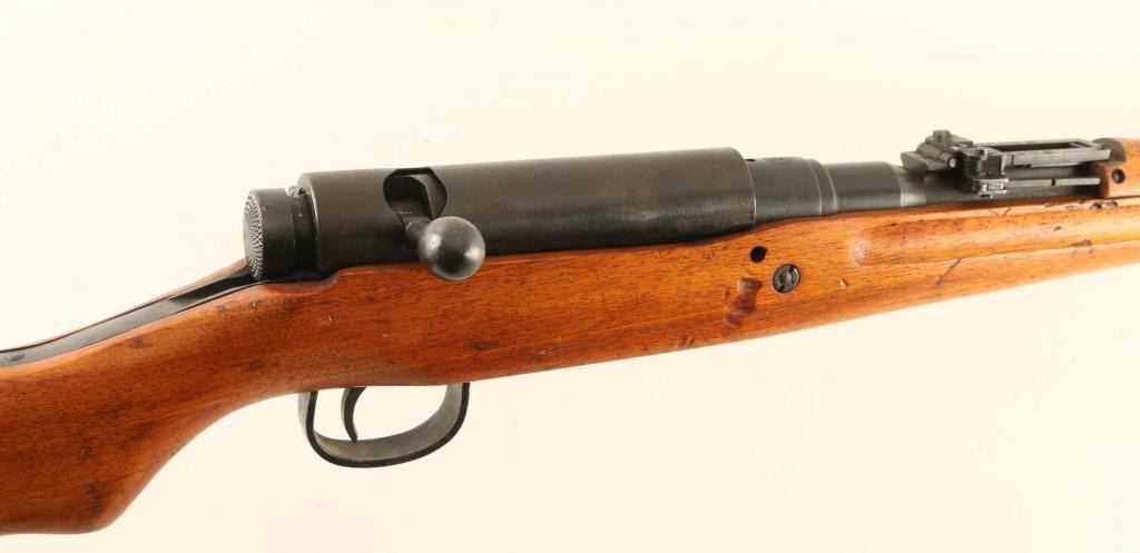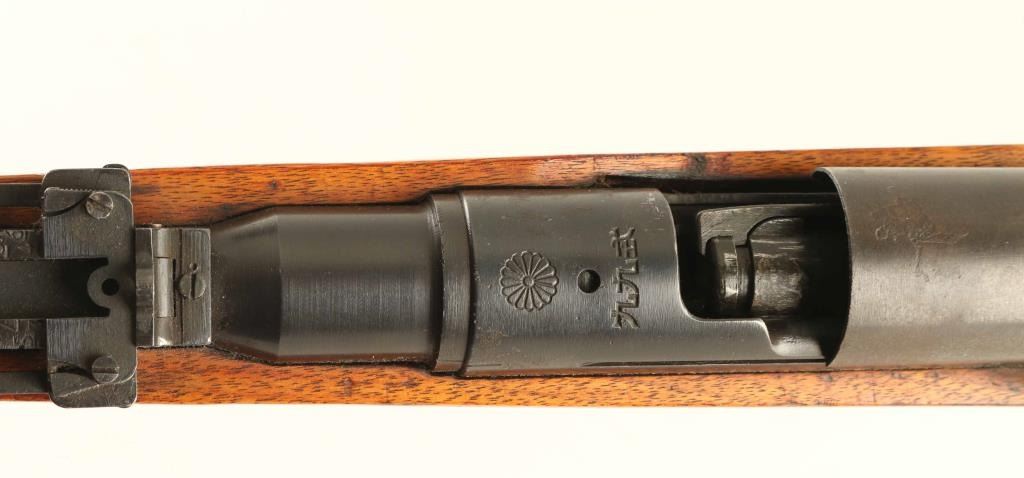 Rifle. WW2 Japanese Military issued rifle. Produced 1939-1945. 25.9" barrel, with front blade, and ladder rear, with aircraft lead arms, sights. Full chrysanthemum on the receiver ring. Monopod in place. Cleaning rod present, All matching serial numbers, except for the dust cover. Egg shaped bolt knob. Bore is very good/bright. Action is crisp/tight. blued metal finish is about 95%, with some pin-prick surface rust on the receiver ring, minor. There is some minor spots of pitting on the top, rear receiver, and dust cover. Wood is very good, with some dings/dents. Nothing serious. As far as Arisaka's go, this one is a beauty. NRA Condition-Very Good. C&R Firearm.