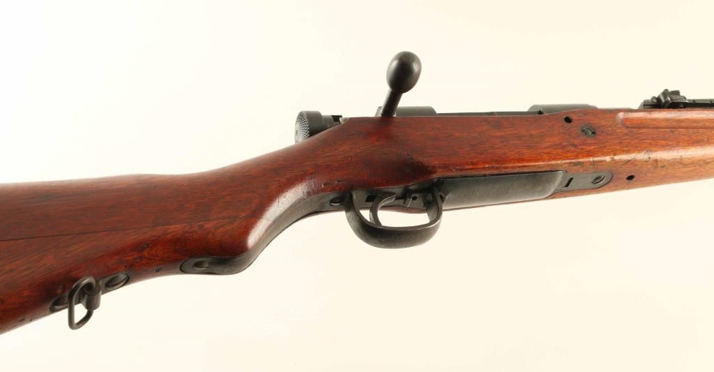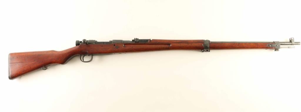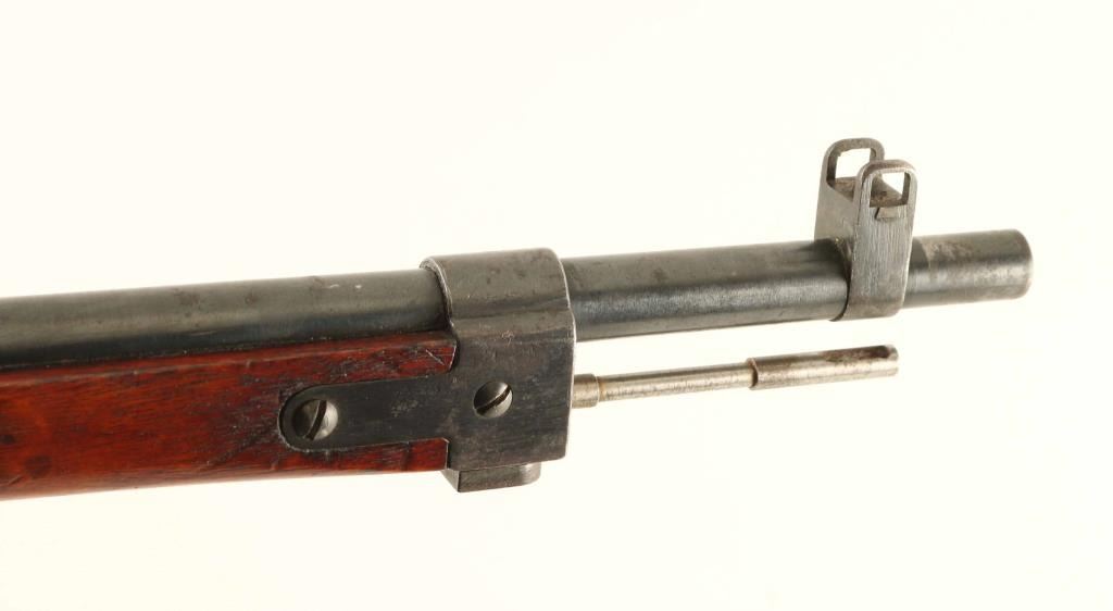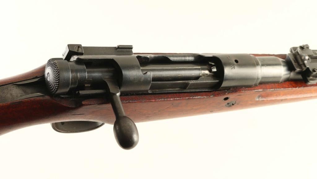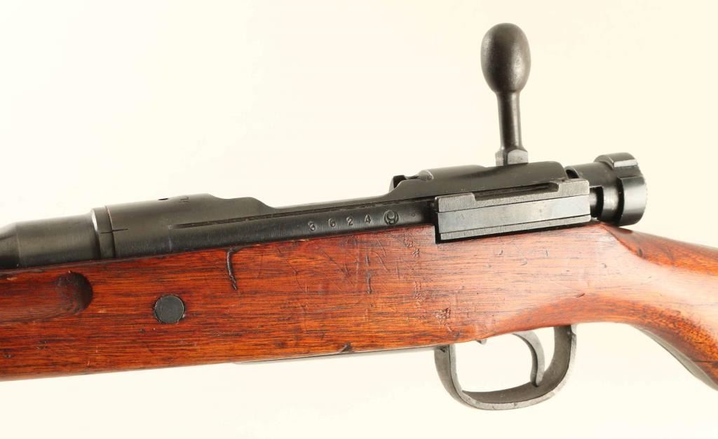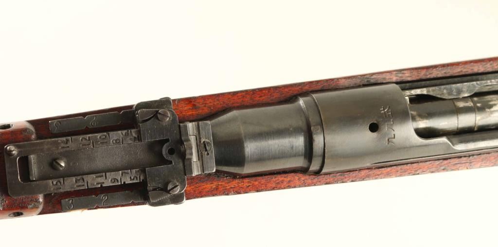 SN: 3624 'No Series' Ground Chrysanthemum. Japanese military bolt action rifle manufactured circa 1939. Less common "long" configuration of the Type 99. Features 31" barrel, cleaning rod, bayonet lug, blade front sight with protector ears, V notch rear sight with elevation ladder & anti-aircraft wings, hinged floorplate, manual safety, sling swivels, straight bolt handle. Bore is very good condition, appears to be hard chrome plated. Retains 80% blued finish, appears original with some re-touched areas such as where Mum was ground off. Several areas of rough finish as manufactured, such as tangs. Some bare metal on sharp edges and where parts rub during operation. Small areas of patina forming at bands and places on barrel. Screw heads show marring. Wood is very good condition, with numerous dings and dents. Butt join is overall good, with slight gap on right side. Most observed numbered parts marked "624", with exception of "640" on safety knob. Condition is NRA Very Good (bluing touched up in places) *** C&R Firearm ***