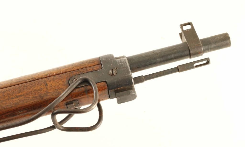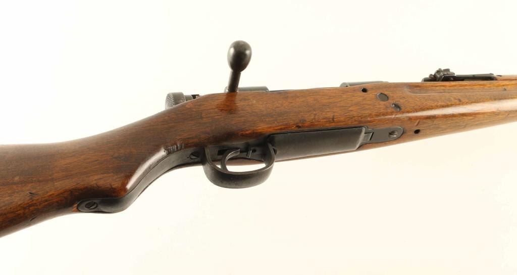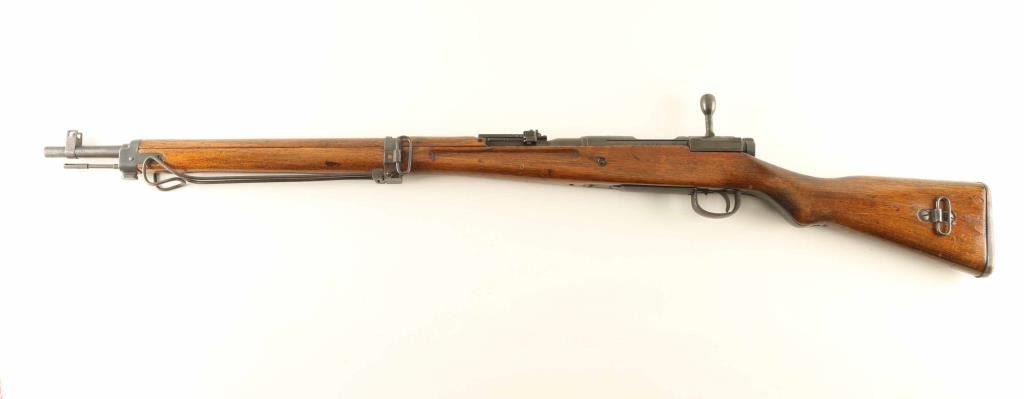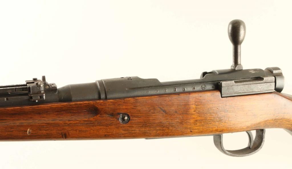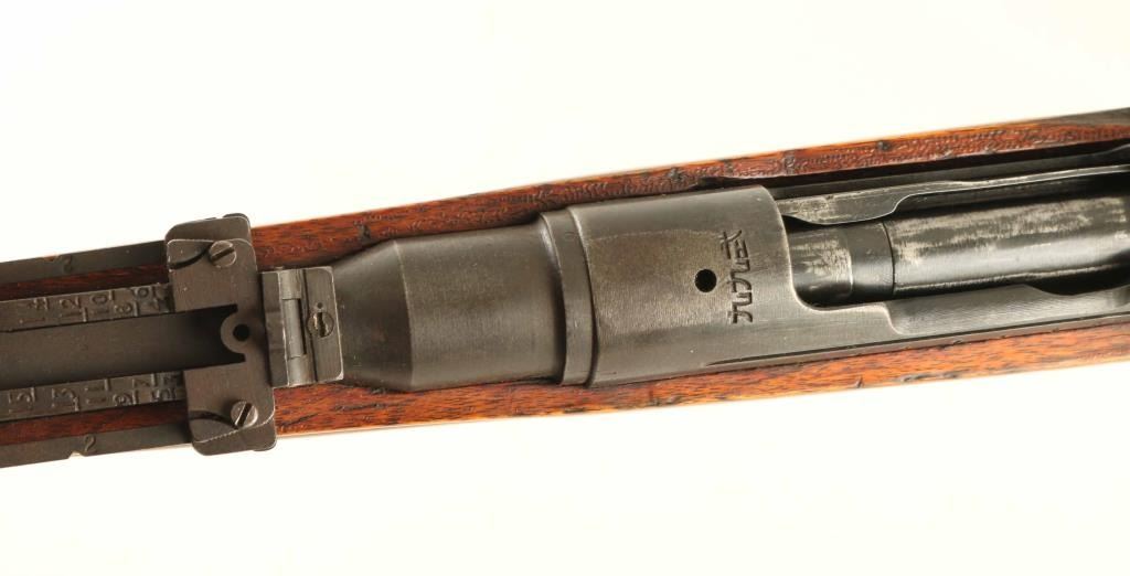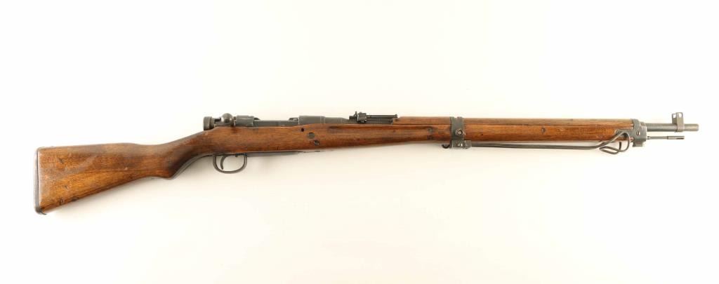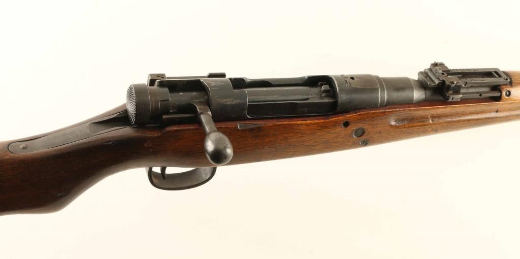 SN: 92714 'First Series' Ground Chrysanthemum. Japanese military bolt action rifle. Features 25.5" barrel, cleaning rod, bayonet lug, blade front sight with protector ears, peep rear sight with elevation ladder & anti-aircraft wings, hinged floorplate, manual safety, side mounted sling swivels, straight bolt handle, monopod. Bore is very good condition, appears to be hard chrome plated. Retains 70% blued finish, appears original with some re-touched areas such as where Mum was ground off. Several areas of patina or thin rust, such as rear sight. Some bare metal showing on sharp edges, rear of receiver, moving parts. Rust and light pitting on buttplate. Screw heads show marring. Wood is very good condition as refinished, with numerous small dings and dents. Butt join is tight. Small gap at toe between wood & buttplate. All observed numbered parts marked "714". Condition is NRA Good+ as refinished *** C&R Firearm ***