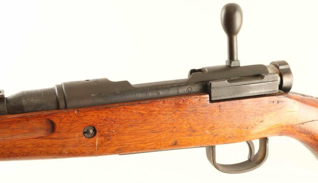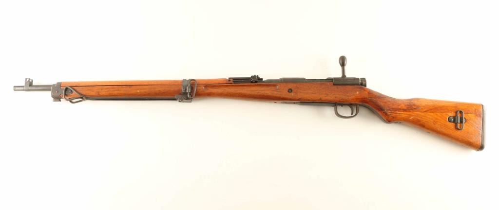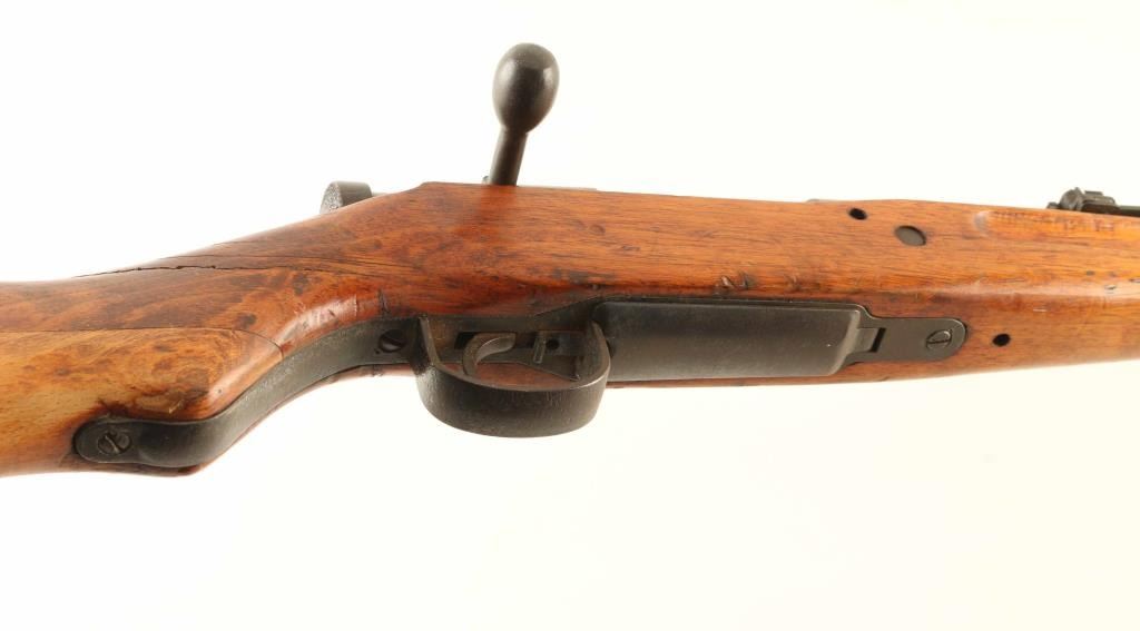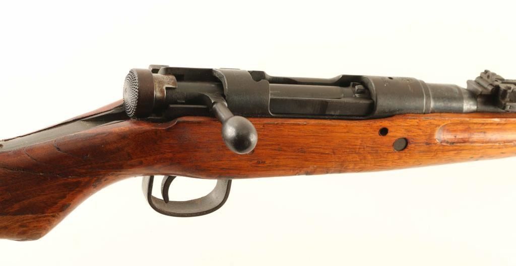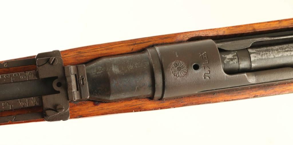 SN: 64373 'Fourth Series' Defaced Chrysanthemum. Japanese military bolt action rifle. Features 25.5" barrel, bayonet lug, blade front sight with protector ears, peep rear sight with elevation ladder & anti-aircraft wings, hinged floorplate, manual safety, side mounted sling swivels, straight bolt handle, monopod. Cleaning rod absent. Mum has been defaced with stamp marks, appears to have been partially ground off, restoration attempted, with result that Mum petals appear to have odd angles. Bore is very good condition, appears to be hard chrome plated. Retains 70% blued finish turning brown in many areas, patina or thin light rust on bands & sights & action, bare metal showing on sharp edges & moving parts. Rust and light pitting on buttplate. Screw heads show marring. Wood is good serviceable condition, refinished, with staining and what appears to be repairs at wrist, numerous small dings and dents. Butt join is good. All four major bolt parts marked "373" Condition is NRA Good as refinished *** C&R Firearm ***
