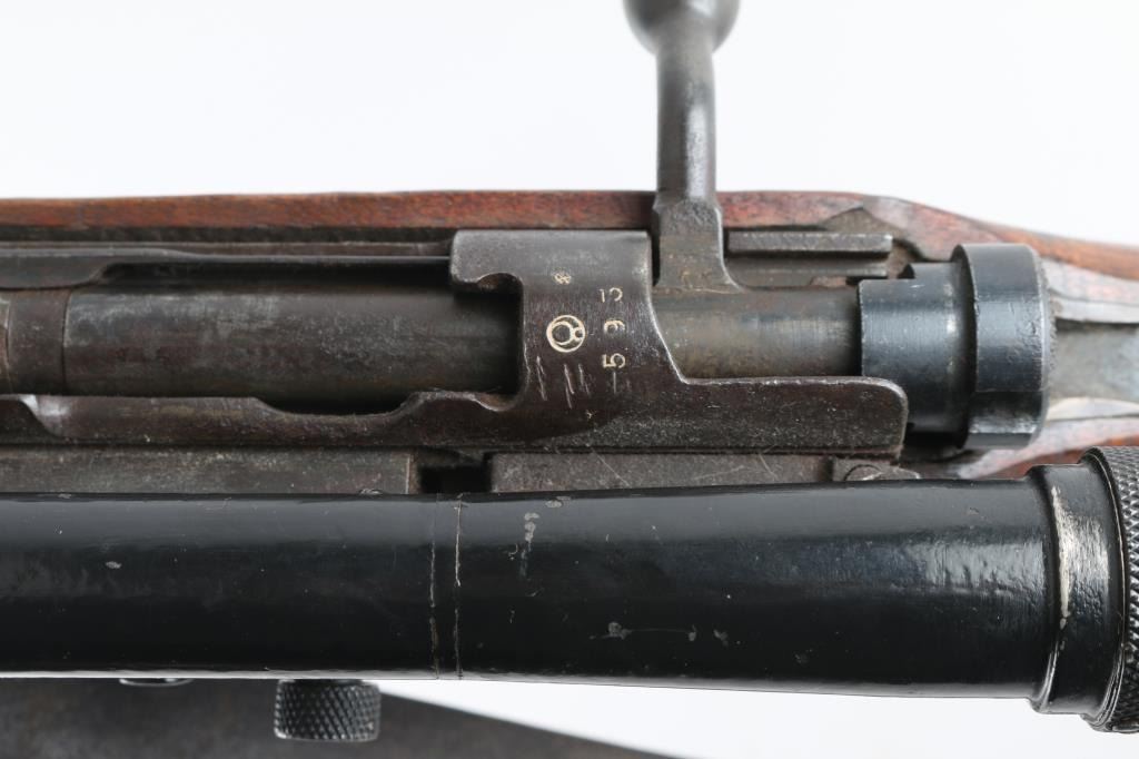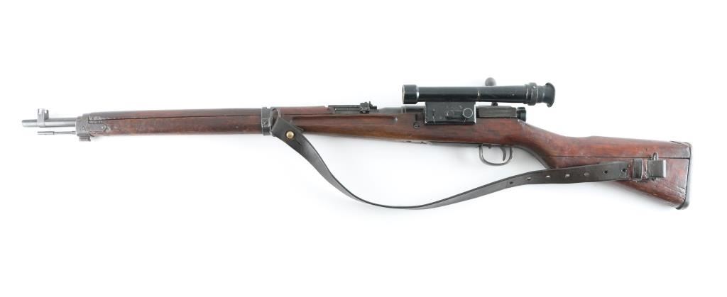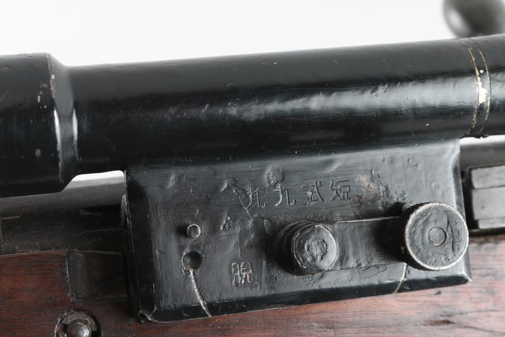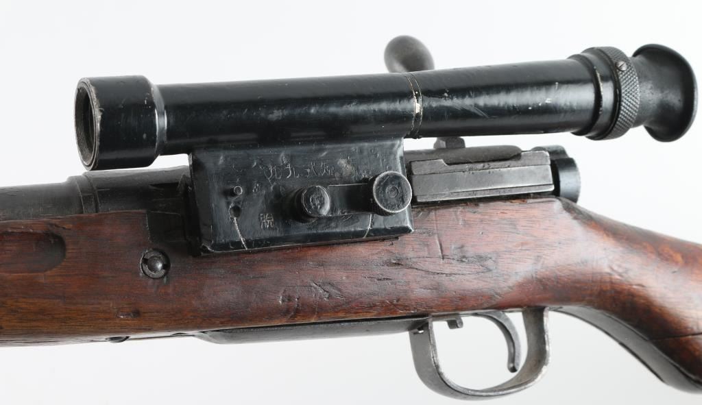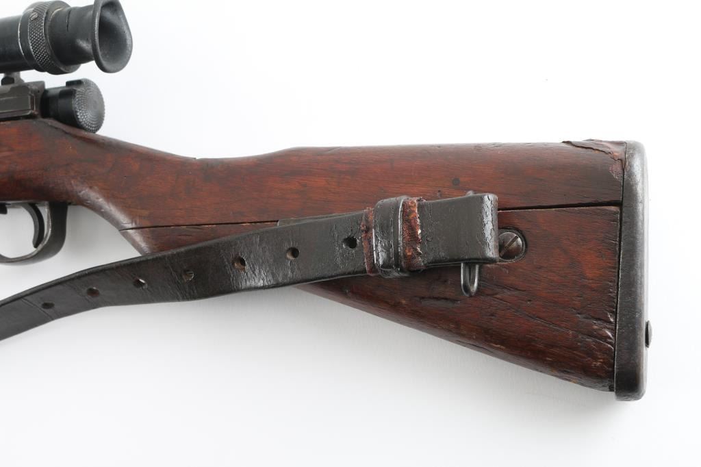 SN: 593 Ground Chrysanthemum. Japanese military sniper rifle. Features 25.5" barrel, short cleaning rod, bayonet lug, blade front sight with protective ears, peep rear sight with elevation ladder & anti-aircraft wings, hinged floorplate, manual safety, side mounted sling swivels, factory long bent bolt handle, side mount scope. Bore is very good condition, appears hard chrome lined. Retains 30% original blued finish, mostly on barrel, with receiver & smaller parts showing a patina brown color. Wood is fair to good, many small dents and some gouges, eroded at toe, gap along butt dovetail splice, cracking at heel. Missing rear tang screw. Scope in good overall condition, retaining good coverage of black paint or lacquer, marked "NTC KOGAKU", "No 12969". Reticle intact, fairly clear view with slight cloudiness and yellowish tint. Rubber eyecup deformed, intact. Bolt numbered "593" on bolt stem, extractor, firing pin. "593" on bayonet lug. "879" on safety knob stem. Scope numbered "4052" on inner dovetail locking block, "63" on inner rear. Includes a poor to fair condition leather sling, missing buckle. Condition is NRA Good+ *** C&R Firearm ***