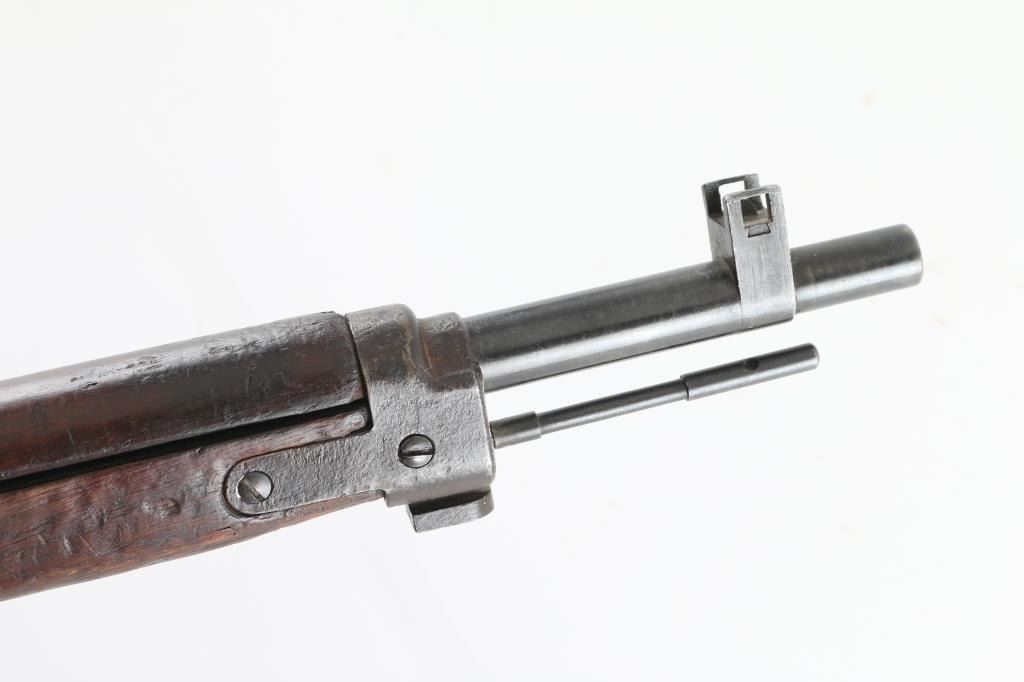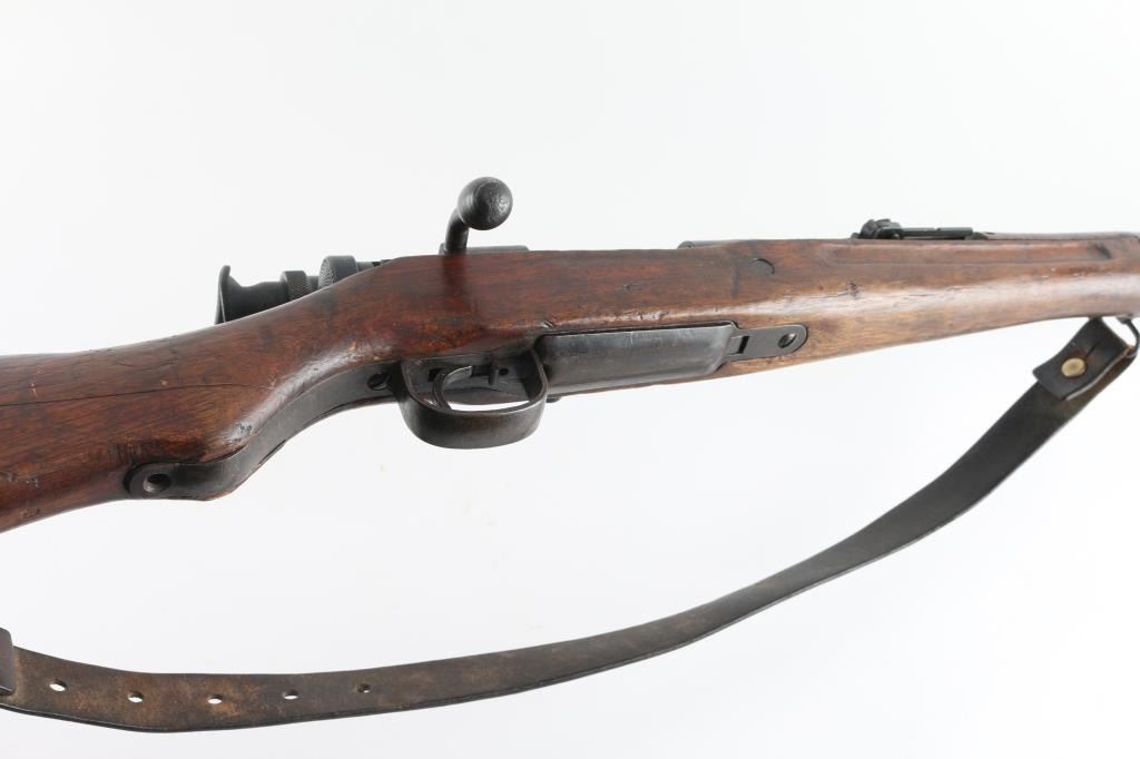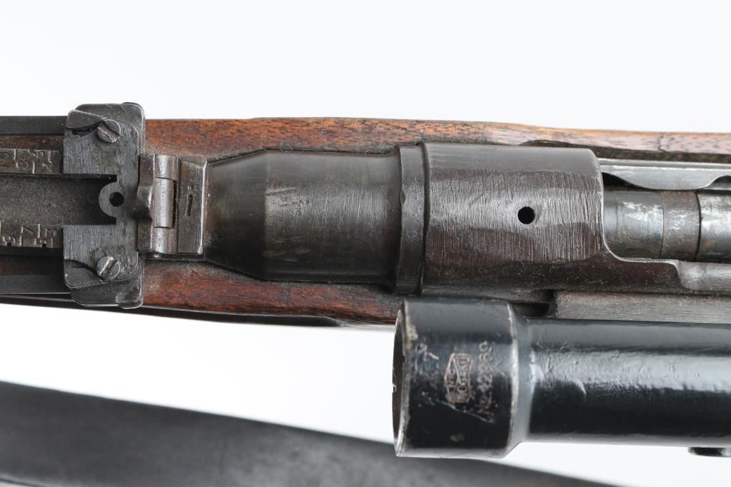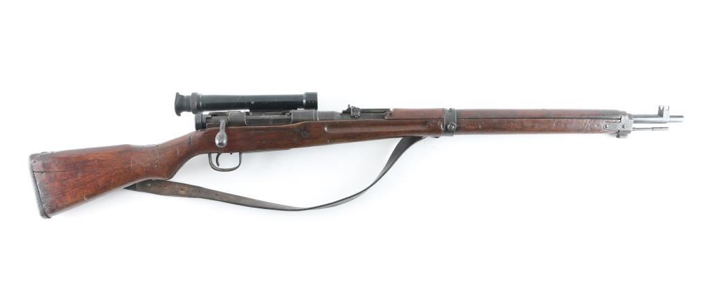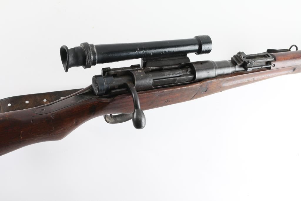 SN: 593 Ground Chrysanthemum. Japanese military sniper rifle. Features 25.5" barrel, short cleaning rod, bayonet lug, blade front sight with protective ears, peep rear sight with elevation ladder & anti-aircraft wings, hinged floorplate, manual safety, side mounted sling swivels, factory long bent bolt handle, side mount scope. Bore is very good condition, appears hard chrome lined. Retains 30% original blued finish, mostly on barrel, with receiver & smaller parts showing a patina brown color. Wood is fair to good, many small dents and some gouges, eroded at toe, gap along butt dovetail splice, cracking at heel. Missing rear tang screw. Scope in good overall condition, retaining good coverage of black paint or lacquer, marked "NTC KOGAKU", "No 12969". Reticle intact, fairly clear view with slight cloudiness and yellowish tint. Rubber eyecup deformed, intact. Bolt numbered "593" on bolt stem, extractor, firing pin. "593" on bayonet lug. "879" on safety knob stem. Scope numbered "4052" on inner dovetail locking block, "63" on inner rear. Includes a poor to fair condition leather sling, missing buckle. Condition is NRA Good+ *** C&R Firearm ***
