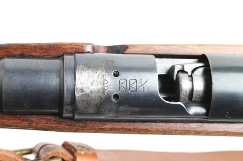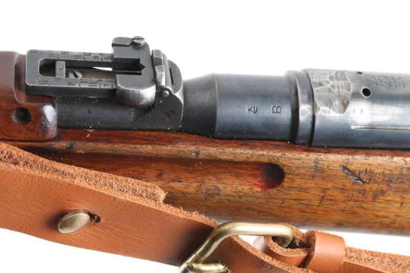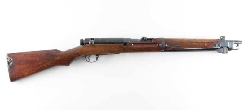 Rifle. Bolt-Action. "Cavalry Carbine. First variation, with two holes for cleaning rod. Produced 1911-1942. Entered service in 1912, the 44th year of the Meiji reign, Type 44. Ground Chrysanthemum. Japanese military bolt action rifle features 19" barrel, protected blade front sight, V notch rear sight with flip-up elevator ladder, straight bolt handle, folding spike bayonet, butt compartment, side mounted sling swivels, manual safety, hinged floorplate. Hook located below the front sight on the right side, replicating the quillon of the type 30 bayonet for bayonet fencing techniques of the period, and for stacking. Mismatched bolt, bayonet housing, and dust cover. Bore is good with strong rifling. Retains 75% blued finish, with edge wear, and handling loss on the triggerguard/floorplate. Bare metal where Mum is ground off. Bolt/buttplate are in the white, very good condition. Wood is good condition with many small scrapes, scratches & dents, Observed markings are crisp. No importer marks observed. Reproduction sling attached. NRA Condition-Good. C&R firearm.