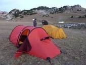 Barney's Sports Chalet Red Nammatj 2, 6 lbs. 10 oz. 2 man tent. Suited for a high altitude expedition or a weekend walk in the local hills. This robust all season tent sets up quickly and easily, can be taken down and moved in a flash, yet is far stronger and lighter than any other tent in its class. The Hilleberg Nammatj 2 is one of the toughest lightweight tents you can find. It handles easily in all conditions, and it defies any weather, season and environment. If you appreciate performance, stability, and low weight you will see this as an ideal tent able to stand up to the rigors of the weather at high altitudes, and on narrow ledges. This tent is a Sheep Hunters Dream Tent. The fabric used in the Nammatj is the finest available: Kerlon 1800 with an unparalleled tear strength six times that of ordinary tent fabrics. The Nammatj provides great performance and longevity.