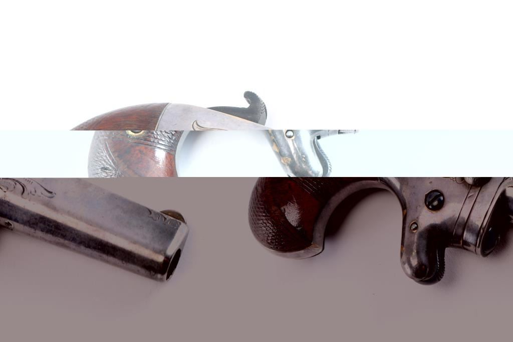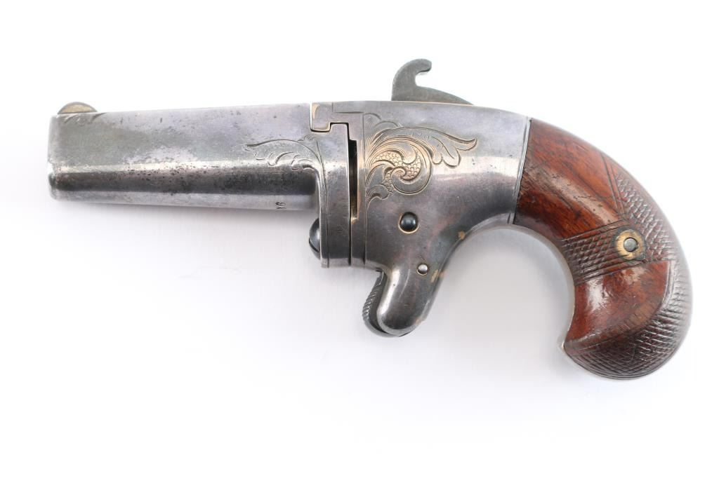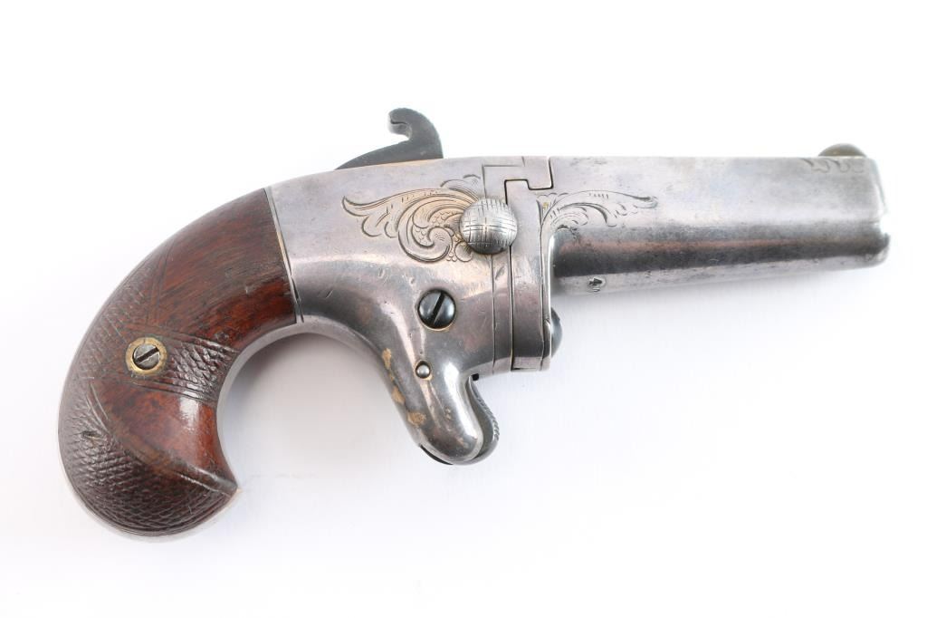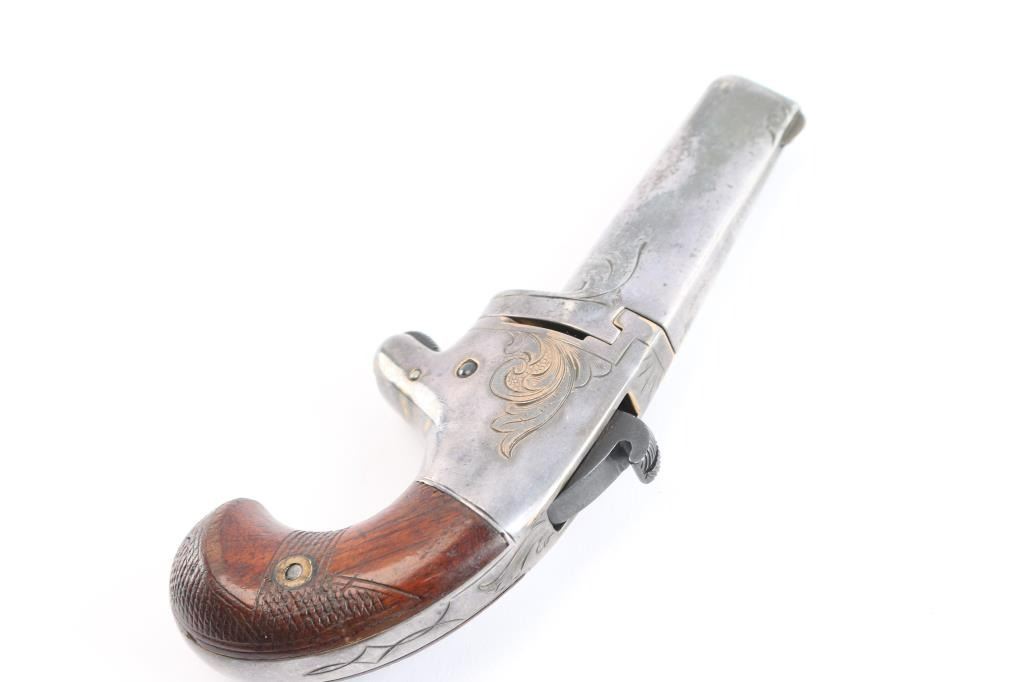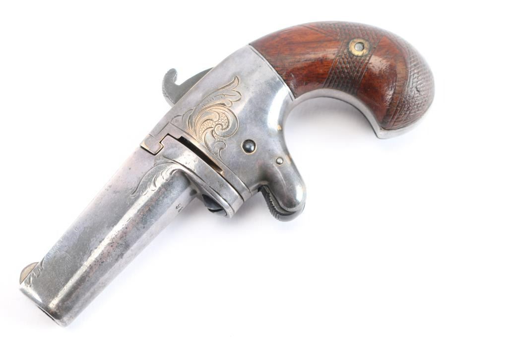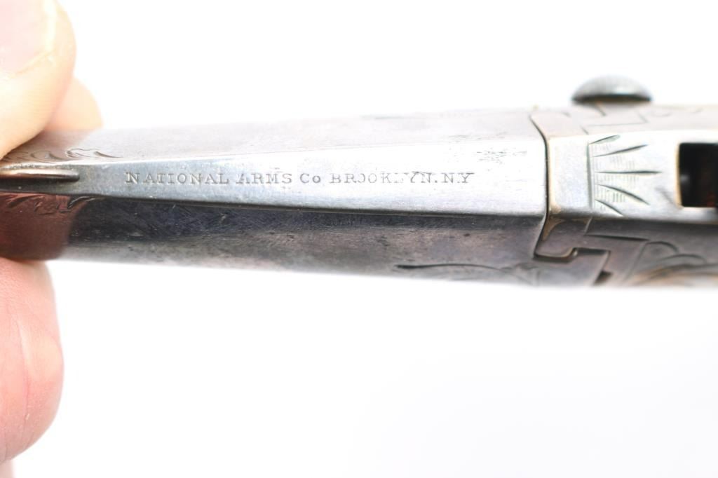 Antique Scarce Factory Engraved, silver plated National Arms Company No. 2 Derringer Pistol, made just after the close of the American Civil War with a production run between 1865 and 1870 in Brooklyn, New York when the company was purchased by Colt. Deringer is chambered for a single shot of .41 rimfire, a likely choice for very concealable self-defense in the last half of the 19th Century. The entire barrel swivels on a hinge for loading, when the hammer is put into half cock and the release button is pushed. The hammer is split and acts as the rear sight when in full cock. After the original maker, Moore’s, was purchased by the National Arms Co., the Colt Firearms Co. bought National Arms and started making the pistol in 1870. Original silver plate finish throughout. Barrel marked "National Arms Co. Brooklyn NY, the underside is stamped with the serial number, the face of the barrel is stamped "AM", the left frame under the grip is stamped "AM 86" and the inside of both grips are stamped "AM 86". The action is excellent, hammer stays at half cock. The bore is bright with rifling with patches of light pitting, the checkered wood grips are are very good with minor dings and the silver plate is about 85% with some handling wear.