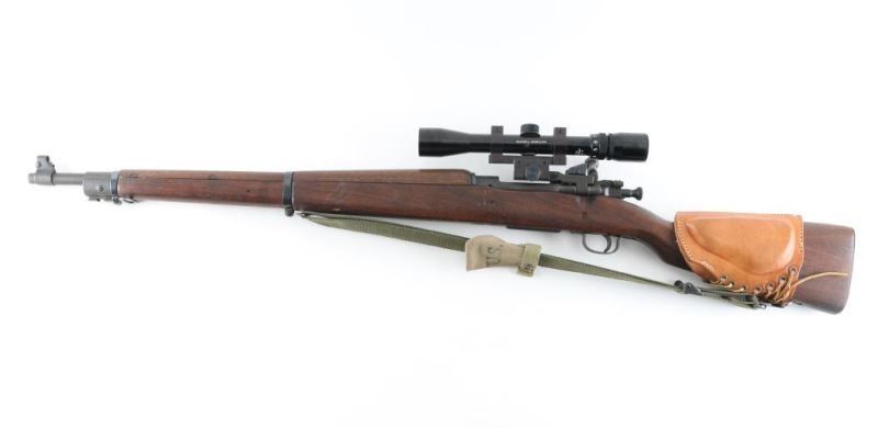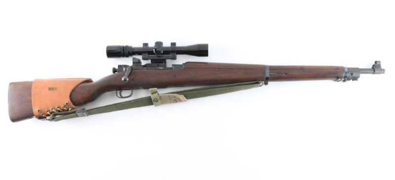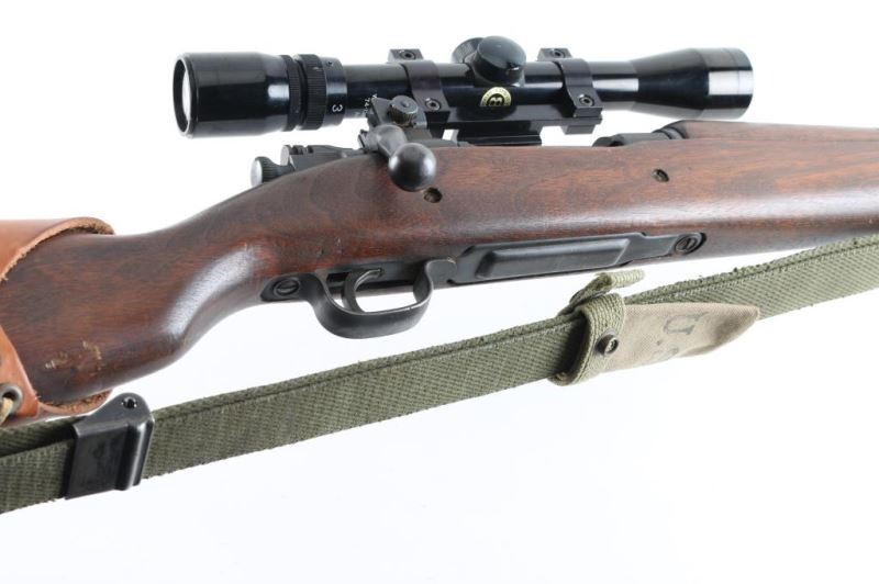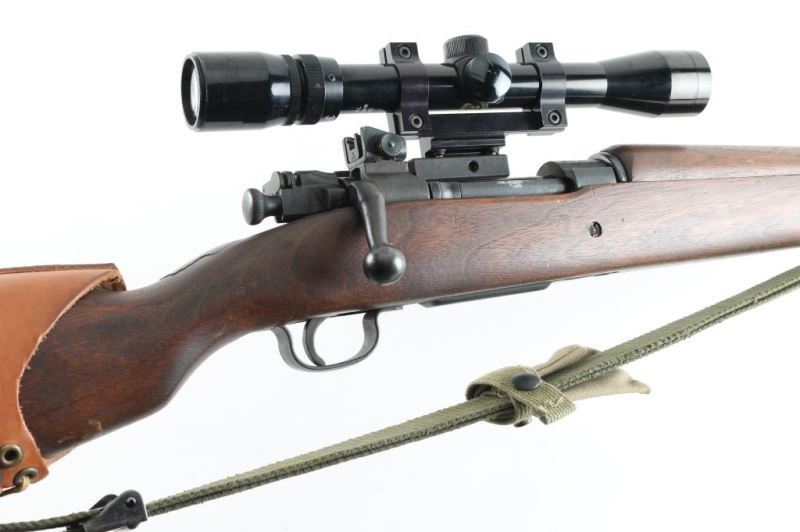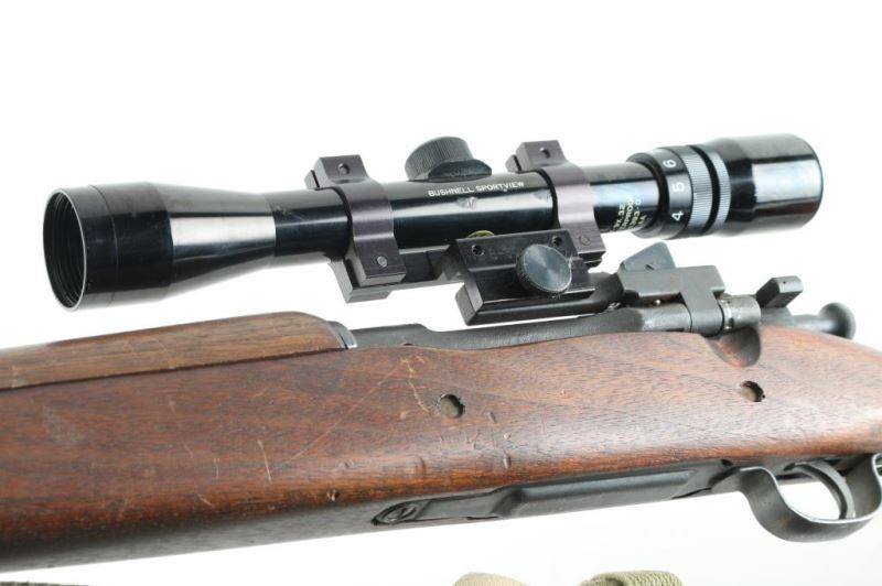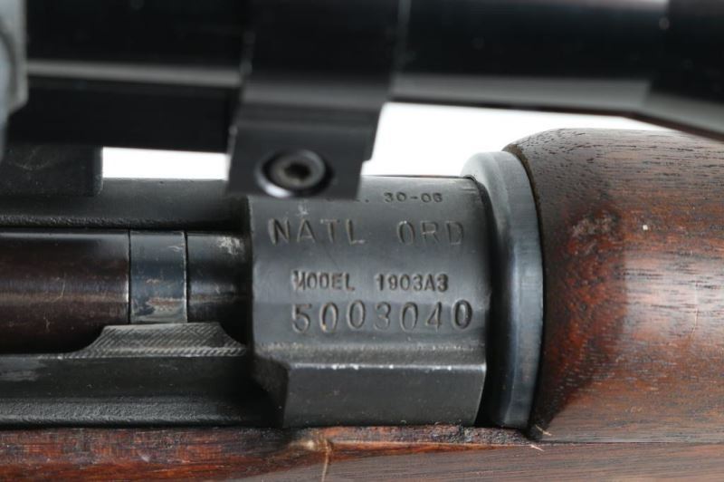 Rifle. Bolt-Action. Commercially made rifle using a new made receiver, and original G.I. parts. 24" barrel with hooded ramp/blade front, and adjustable aperture on ramp rear sights. Chamber stamped "Cal. 30-06 Natl. Ord. Model 1903A3 " and serial number., Barrel stamped "R.A. Flaming Bomb, and 5-44" parkerized finish with blue bolt, barrel bands. Bore is dark/rough. Smooth wood stock/handguard are good with minor scratches/dings. There is a crack on the top of the comb. Action is smooth/tight. Brown leather cheek rest attached. Green web sling, and "U.S." marked muzzle cover. Mounted with a Bushnell Sportview 3X,9X,32 scope. Clear optics. NRA Condition-Good. Modern Firearm.