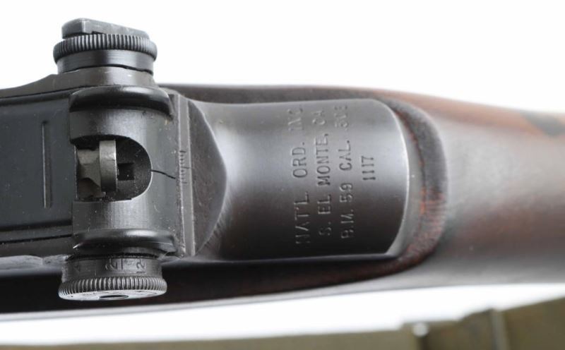 Semiautomatic rifle based on the Italian BM-59 design, a detachable magazine version of an M1 Garand, using many USGI parts and a new made receiver. Features parkerized finish, wood stock & handguard, 18" barrel, long slim flash hider, blade front & peep rear sight (both with protective ears), manual safety with extension for operating while wearing mittens, stripper clip guide on receiver, butt trap for cleaning gear (oil bottle included), sling swivels. Bore is very good condition. Metal surfaces retain 85% coverage of refinish with different parts having different colors, gas cylinder is silvery color. Wood is very good condition. Includes GI type web sling, (5) magazines (shorter length, appear to hold 10 rds) and bipod (attaches by replacing gas cylinder lock). Condition is NRA Very Good *** Modern Firearm ***