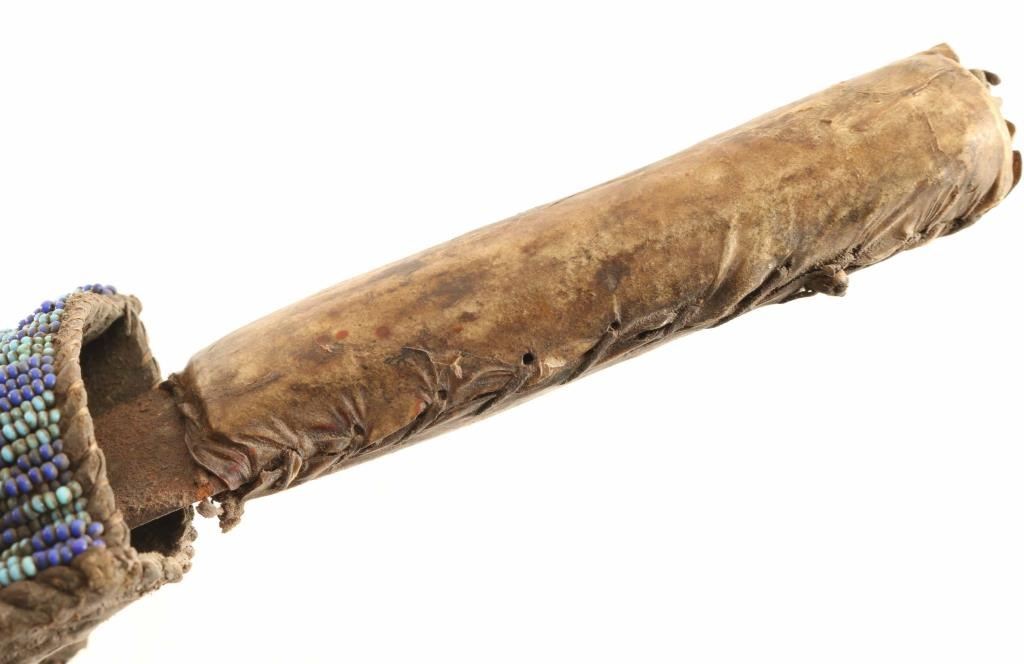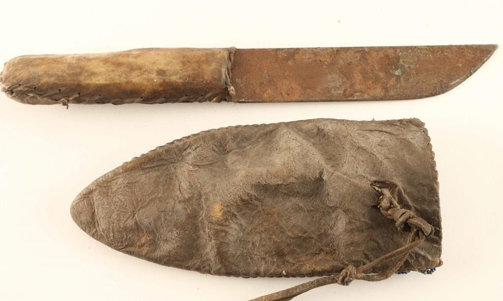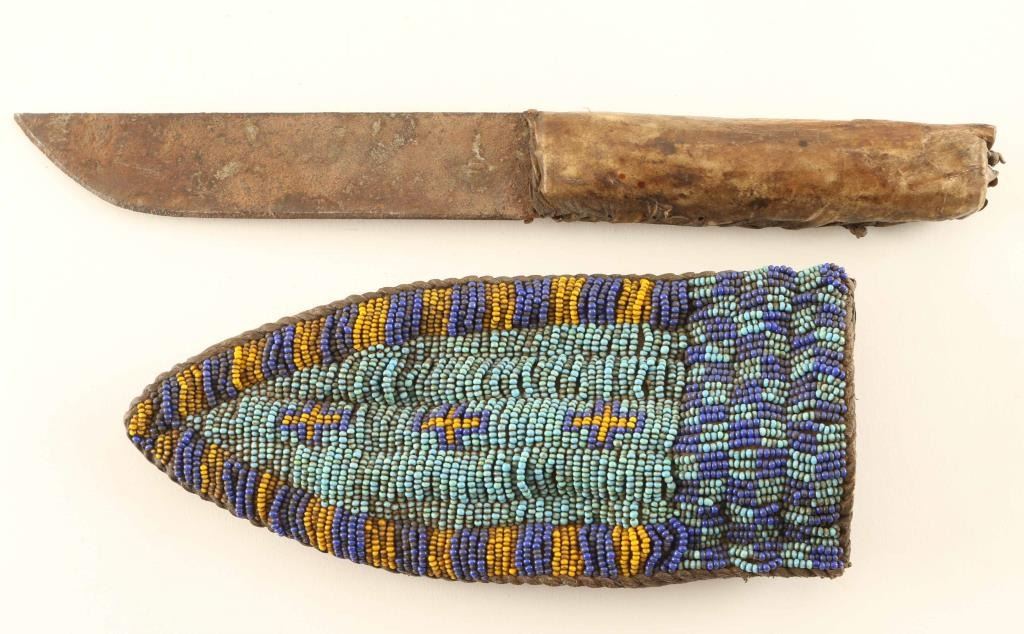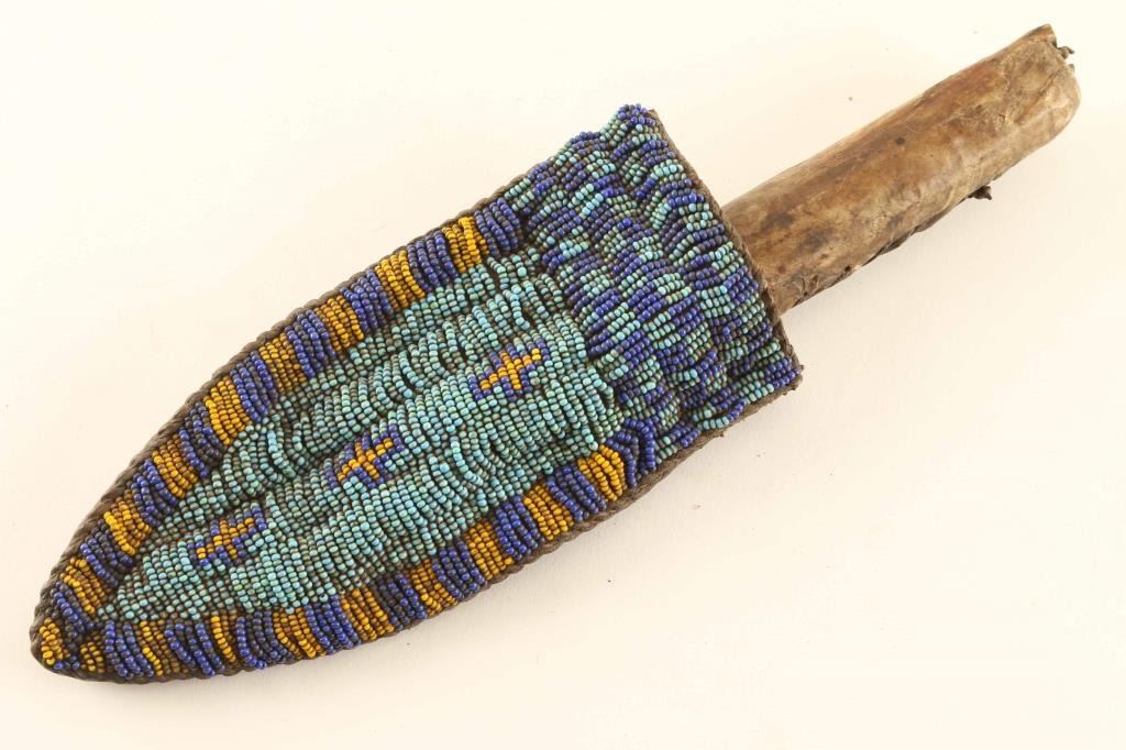 In Blues And Yellow With Primitive Knife Measures 12" Overall Good Condition Shows Age.