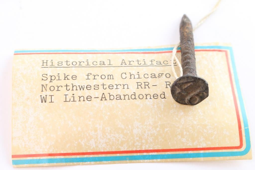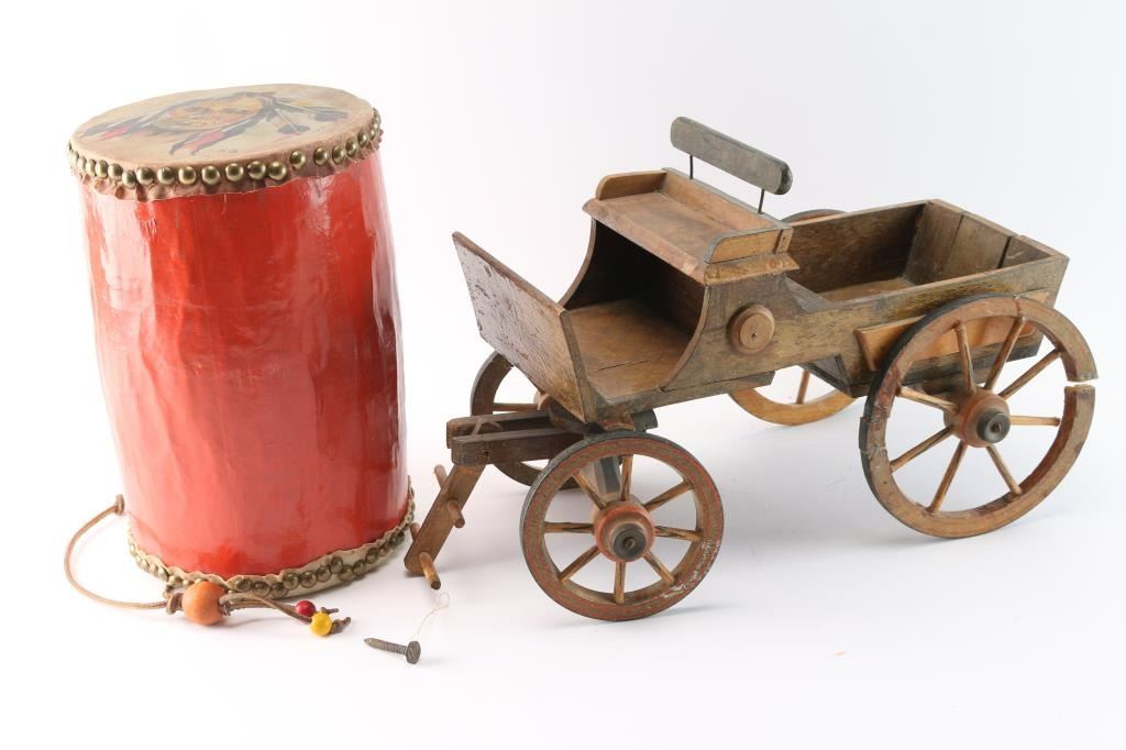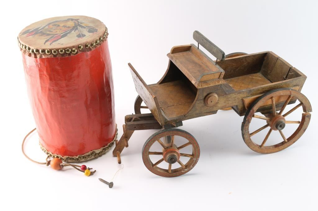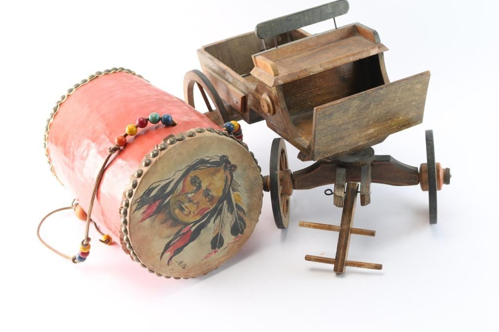 Includes: Small wooden wagon measuring 10" H x 16"L x 9"W. Drum, painted orange with leather and beads. Painting of Native American on top drum face. Tie marker from Chicago Northwestern RR.