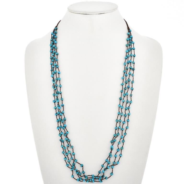 Native American Four Strand Bone Choker represents the history of many great tribes...the Sioux, Crow & Apache to name a few! This choker is meant more than just jewelry, it signified honor, bravery and victory. Made by Navajo Shirley Wiley. Authentic, hair-pipe tubes were strung on sinew with Turquoise and Apple Coral wheel beads and are held in place by the etched slabs. About 1-1/8" tall and about 14" from tab to tab, the leather ties add an additional 6" on each end, Turquoise Beads with beautiful southwest color. Genuine, sky blue Turquoise was shaped into 4-5mm irregular rounds. The stones are held in place by the hand knotting on waxed reinforced thread. About 31" long, 6 large cabochons exhibiting a nice dalmatian-like pattern of dark inclusions.