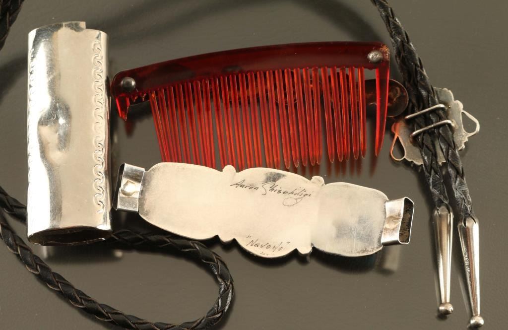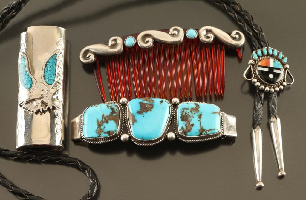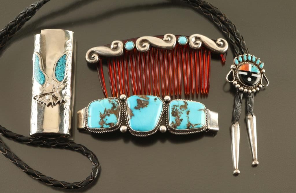 (1) Zuni Sunface Bolo with inlaid stones all sterling (1) Sleeping Beauty Turquoise Barrett set in sterling marked Aaron Shischigs (1) Sterling and turquoise com needs repair (1) Eagle lighter cover
