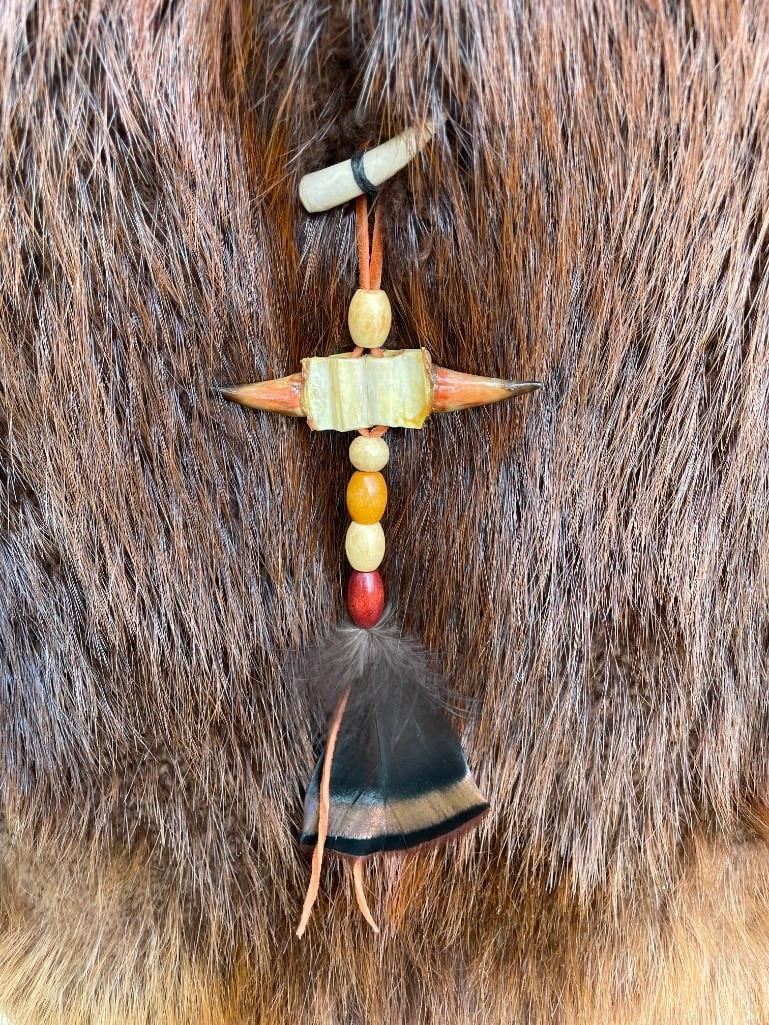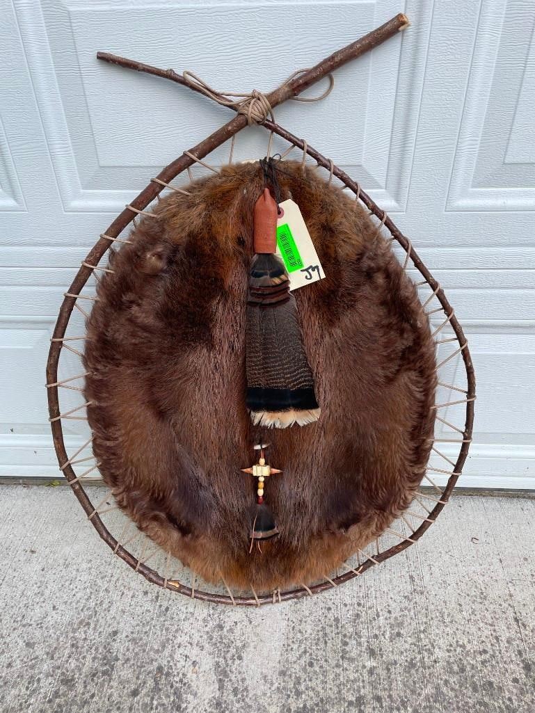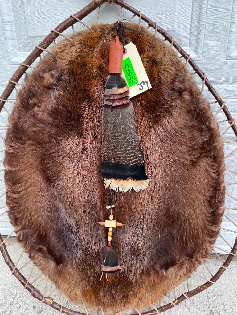 Traditional Native American Style *New* BEAVER Hide in a Natural Willow Wood Hoop. It was hand-made and embellished with Turkey Tail Feathers and Spurs. It measures 35" Long x 28" Wide. This is unique decor for your hunting camp or cottage. COLLECTIBLE TAXIDERMY NATIVE AMERICAN ART