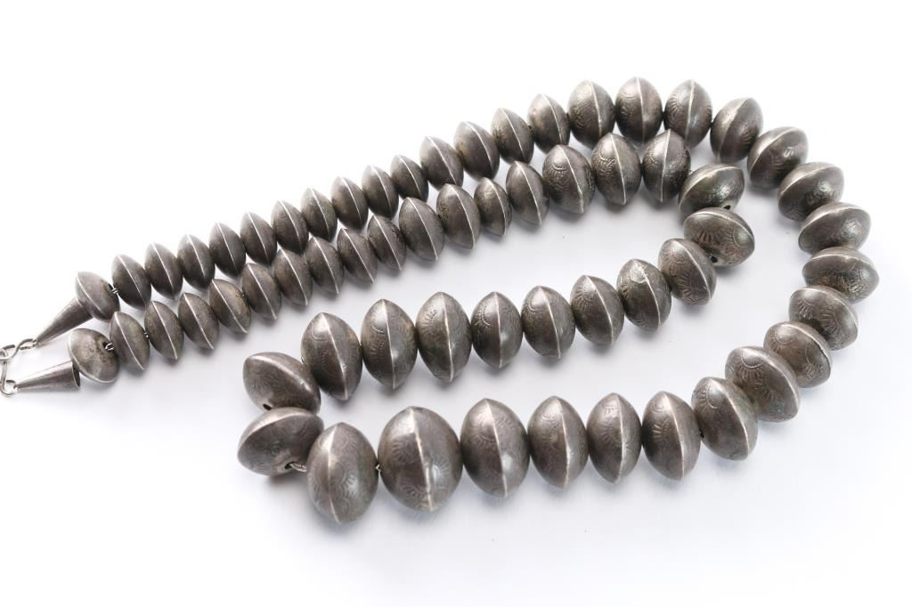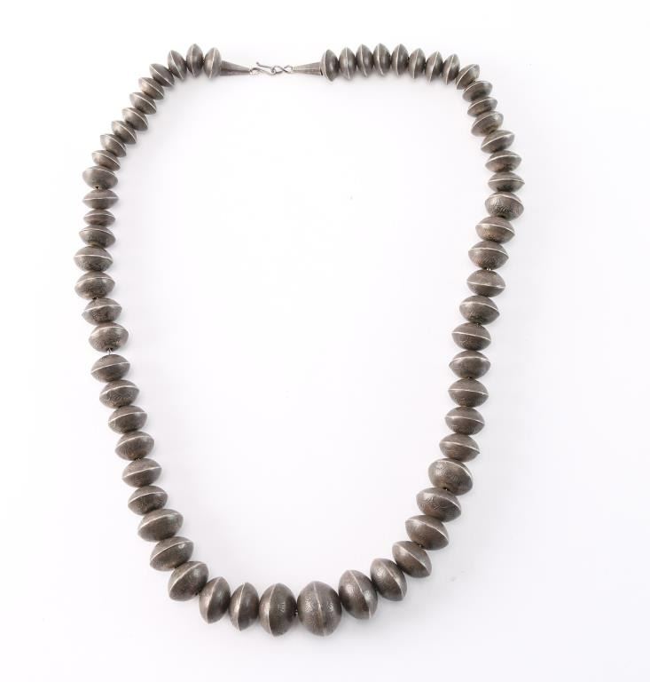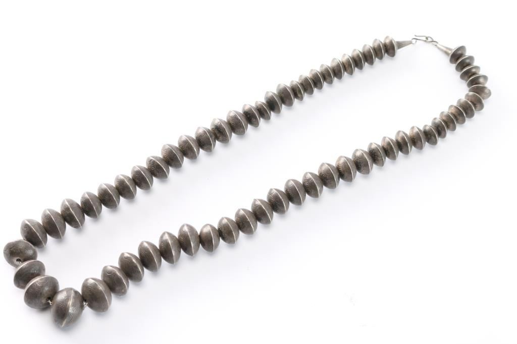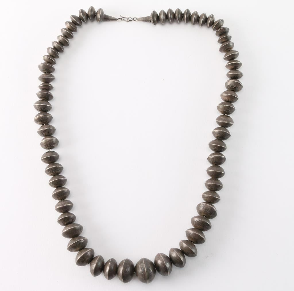 Engraved graduated sterling silver beads. Measures 12 1/2" from drop.