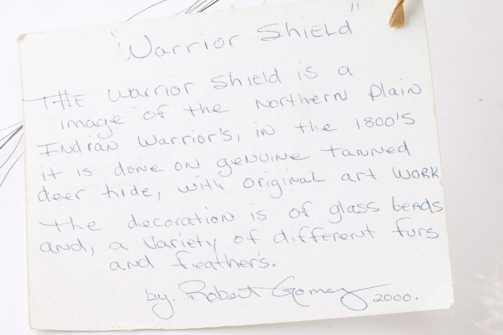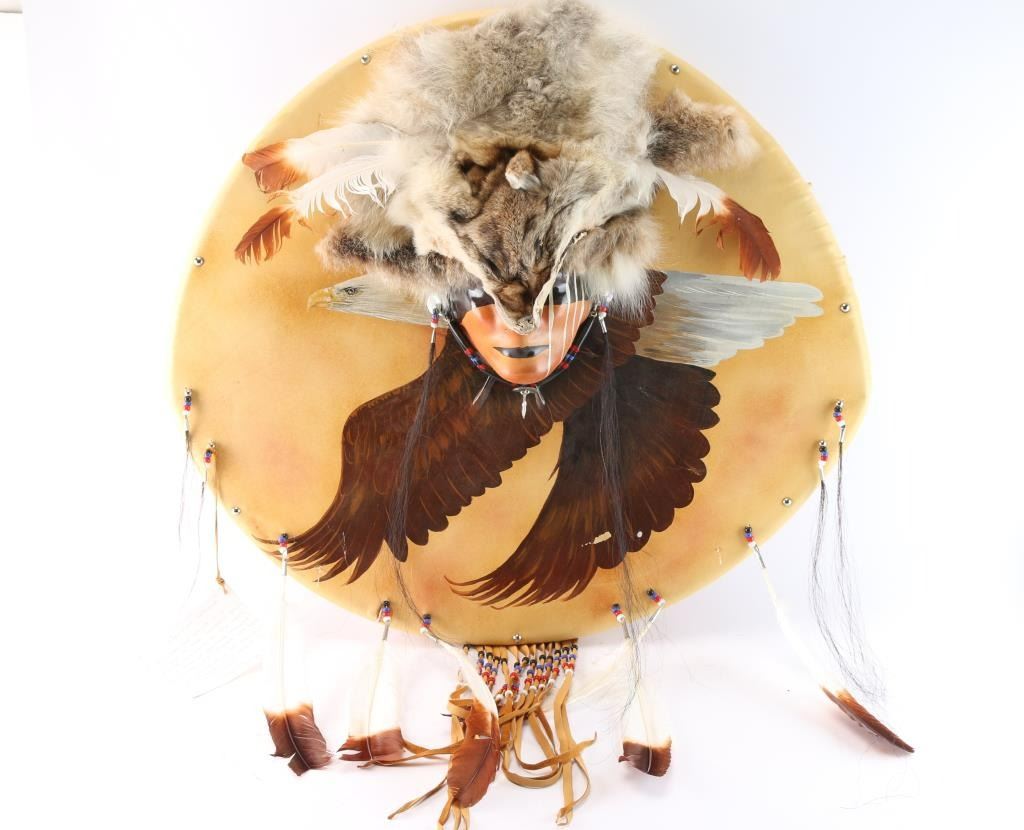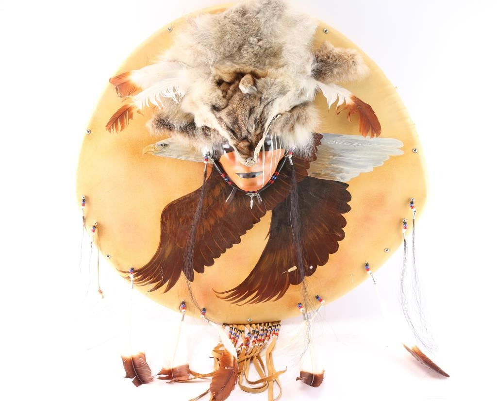 Large shield-shaped with bald eagle painted on leather with face of Native American made from leather wearing a coyote pelt and feathers. Beaded horse hair and leather fringe. Signed on back by Robert Gomez