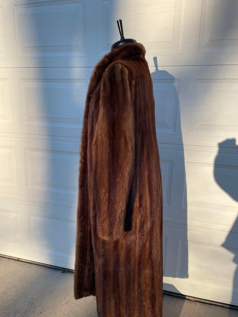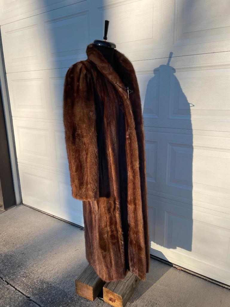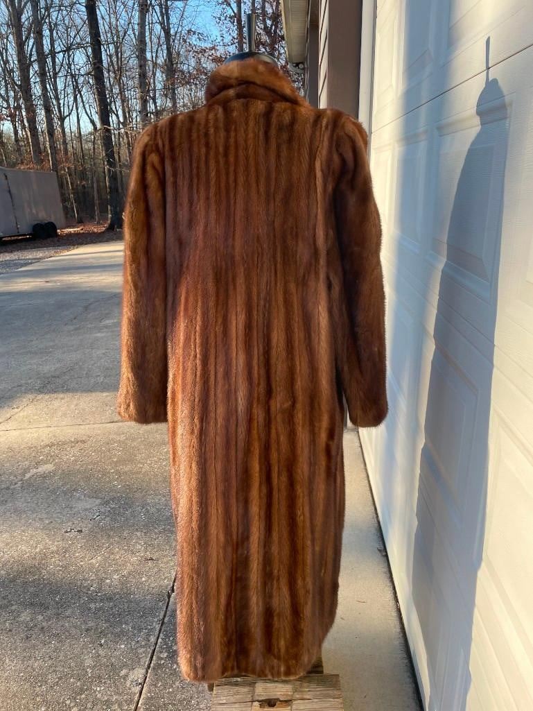 This is a Beautiful Natural Brown MINK Fur Coat. It measures 52" Long x 16" across the shoulders x 25" Long sleeves. It fits Medium to Large. DECORATIVE TAXIDERMY CLOTHING