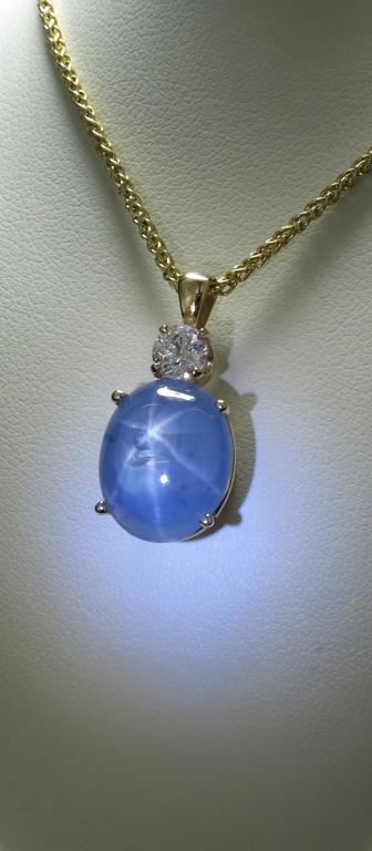 7.30 carat cabochon Star Sapphire and Diamond accent weighing 0.40 carats with E-F colors set in 14 karat yellow gold setting.